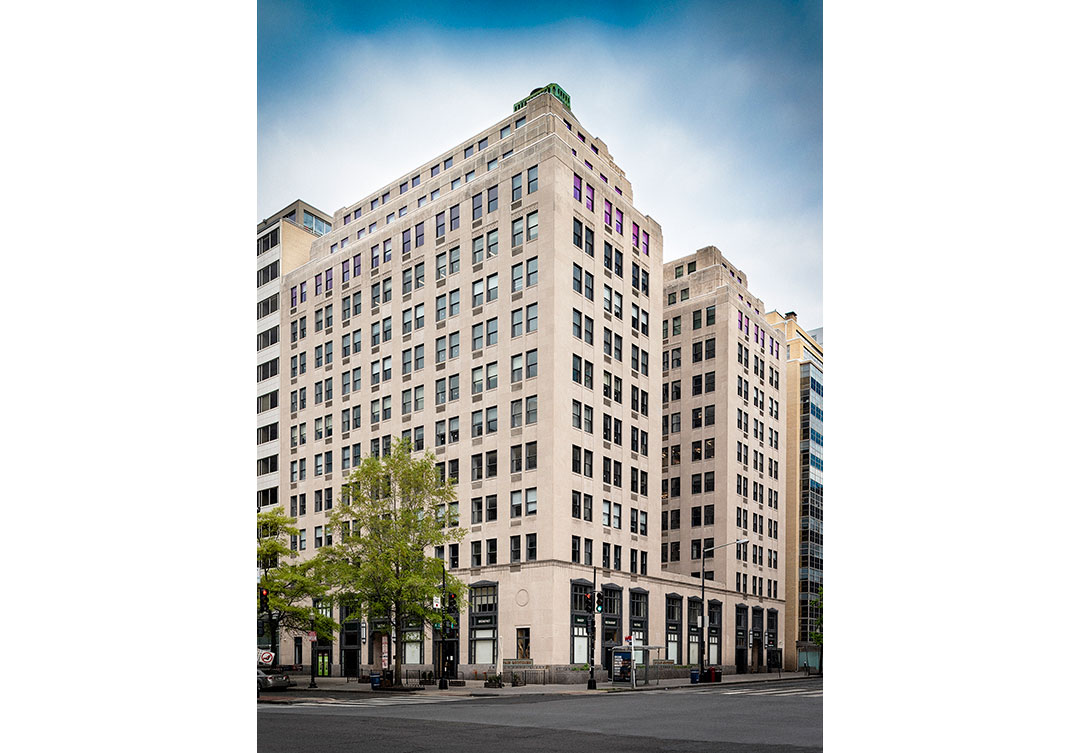The work included a deep cleaning of the entire facade with a low-pressure water wash, removing ferrous stains, and biologic staining. Many of the stains had to be treated with a chemical poultice multiple times to free them from the stone. Rugo also performed re-pointing the limestone in selected areas due to failing mortar joints. We also had to remove all the massive roof stone copings, so new flashing and waterproofing could be applied to the parapets. We replaced 25 embedded limestone panels with matching existing color and texture, replaced alley elevation face brick, restored the existing original lobby stone walls, and installed a new marble lobby floor.