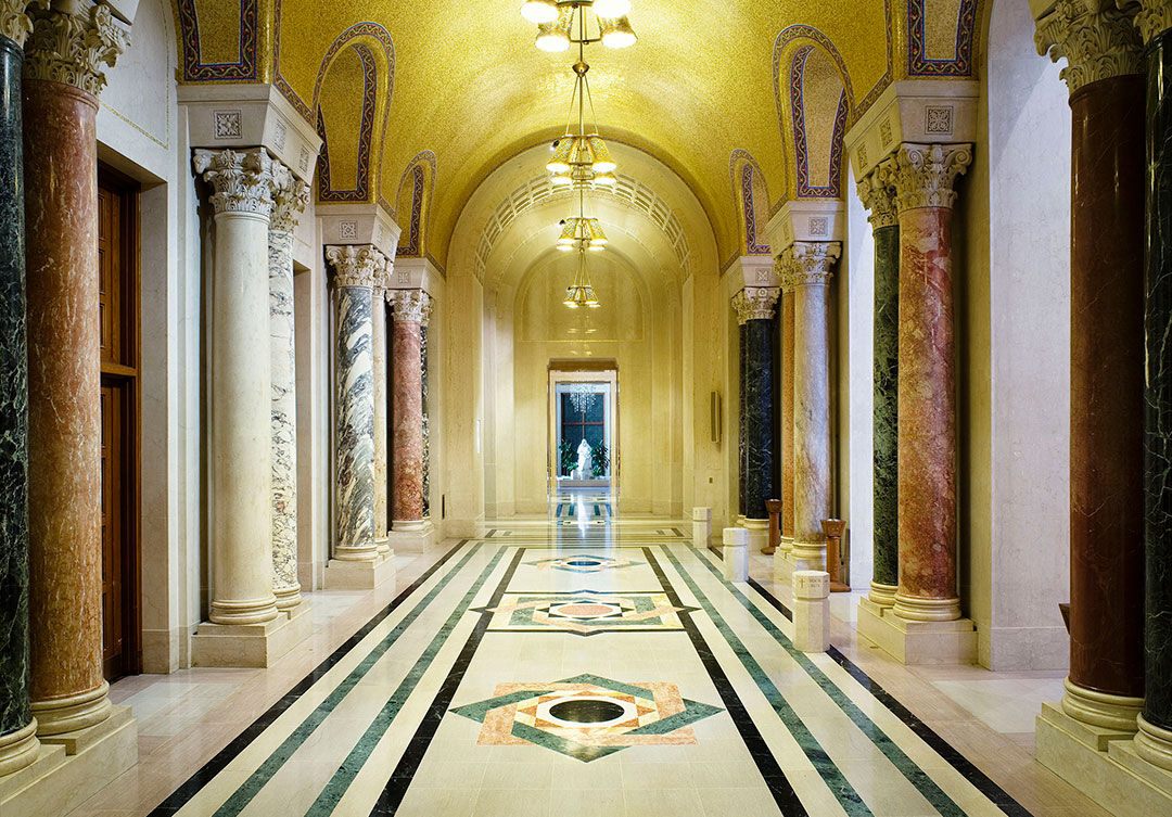 Rugo built a complete dust enclosure system to carefully remove the old gypsum plaster base, and float all-new Portland cement plaster to meet the exact curvature of the original ceiling. The new mosaic also included two concentric smaller domes and extended the side aisle ceiling decorative patterns.