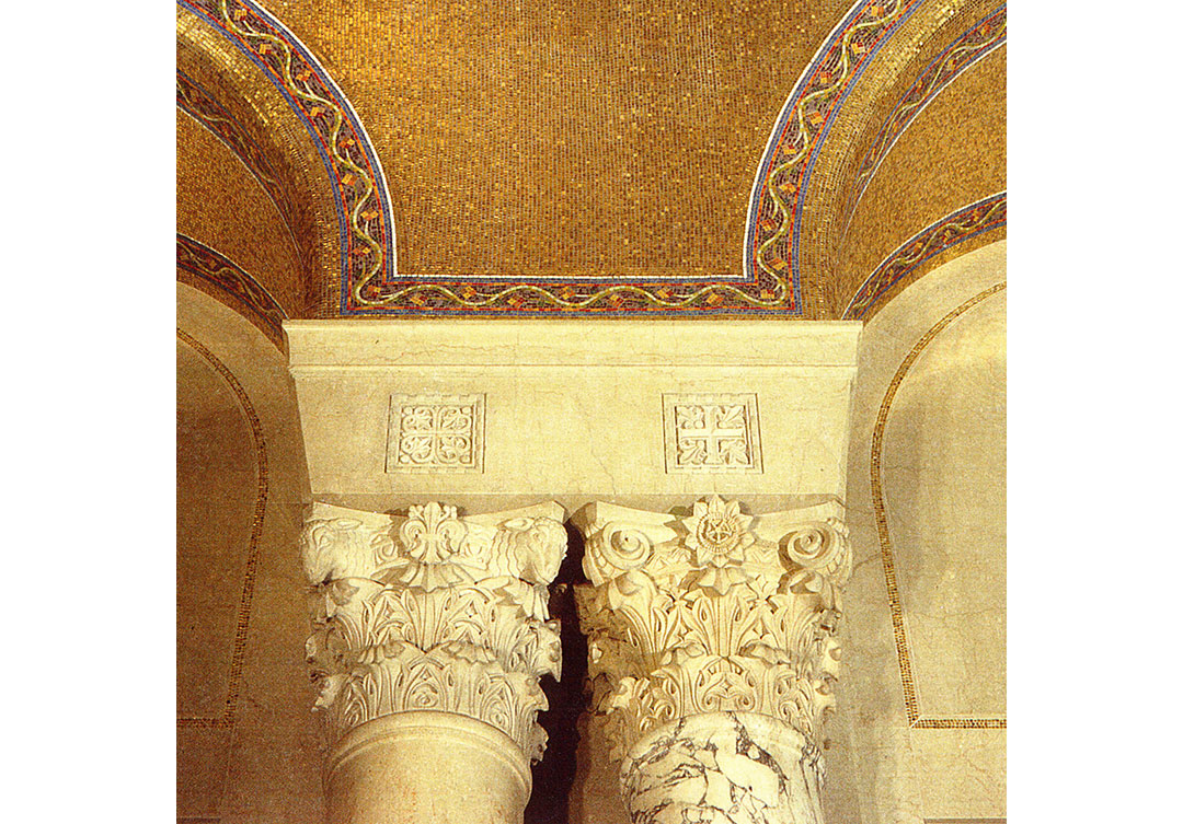 The Narthex is the gathering space just beyond the central entry vestibule in the upper church of the Basilica. The ceiling in this space had had never been embellished with mosaic in the original construction. So Rugo was contracted to design, assemble, and install a 24-carat gold mosaic ceiling. The mosaic design was simplistic and incomplete with surrounding art. Still, the degree of difficulty in installing an all gold tesserae field of the mosaic was very challenging, a task our distinguished artisans welcomed.