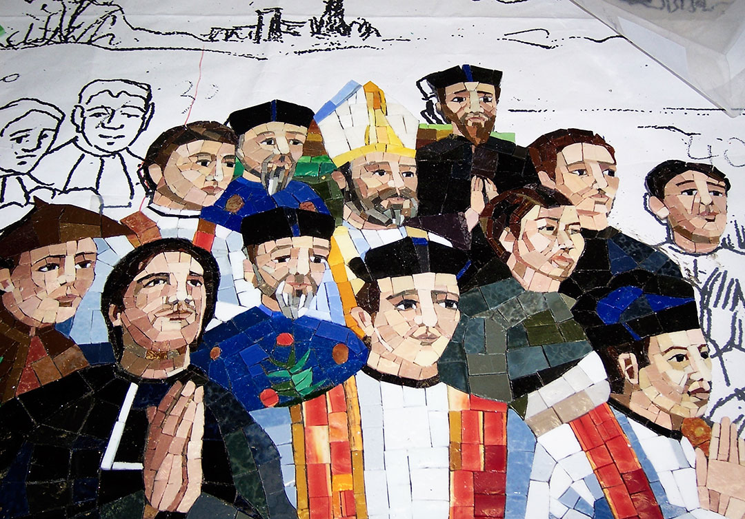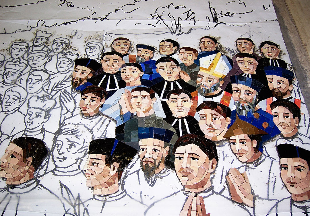 The Our Lady of La Vang Chapel is dedicated to Vietnamese Catholics. The Chapel displays some of Rugo’s most exceptional artistry in micro-mosaics. Rugo artisans created two panels, 8’x4′ using the direct method of micro-mosaic assembly. The one the left wall is The Martyrs of Vietnam, which shows 118 figures of the known Vietnamese martyrs killed for their faith in the 18th century.