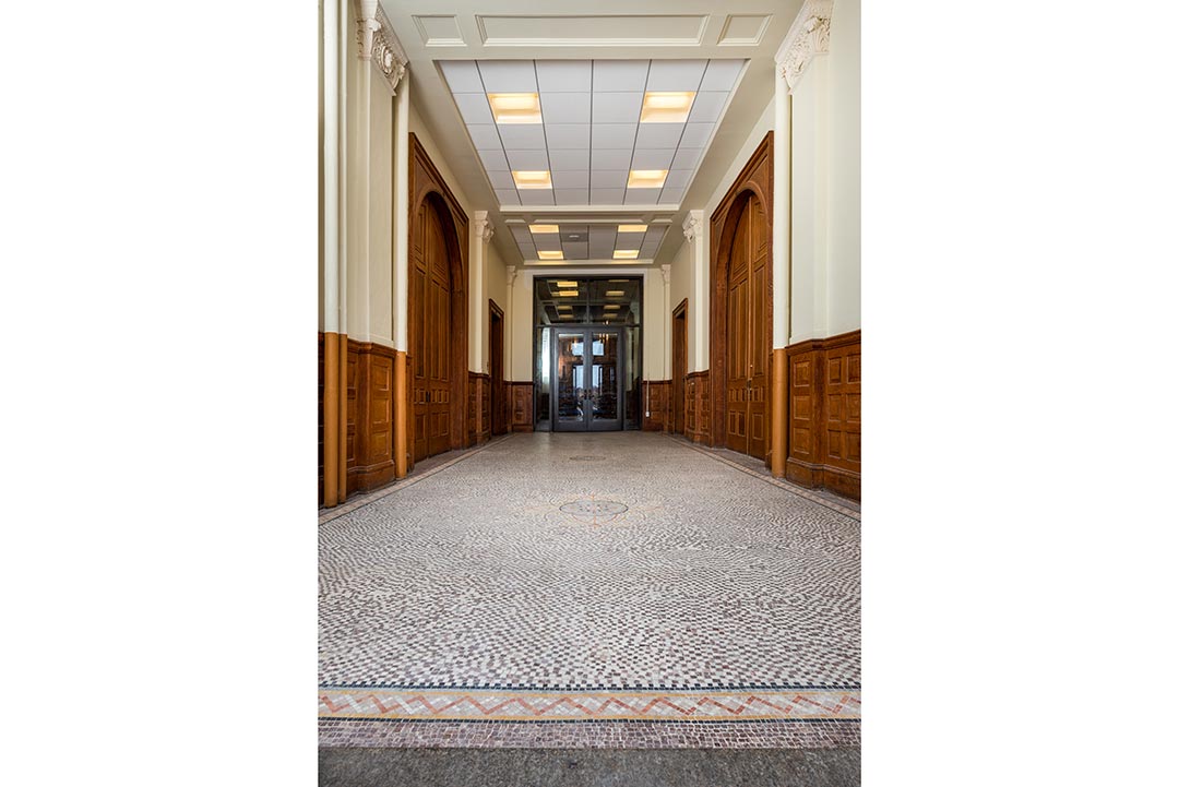We perfectly matched the color of the marble to the various marble colors used 150 years ago. Our team also created and installed a new mosaic threshold. Finally, the floor was re-grouted, cleaned, and sealed.