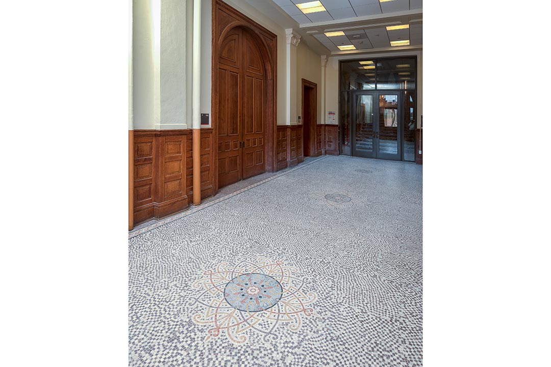 Caldwell Hall is a building on the campus of The Catholic University of America in Washington, DC. Rugo Stone was hired to restore the marble mosaic floor, which was originally installed in 1870. Conserving and restoring a marble mosaic floor involves a careful and artistic approach to preserve the original material and design.
