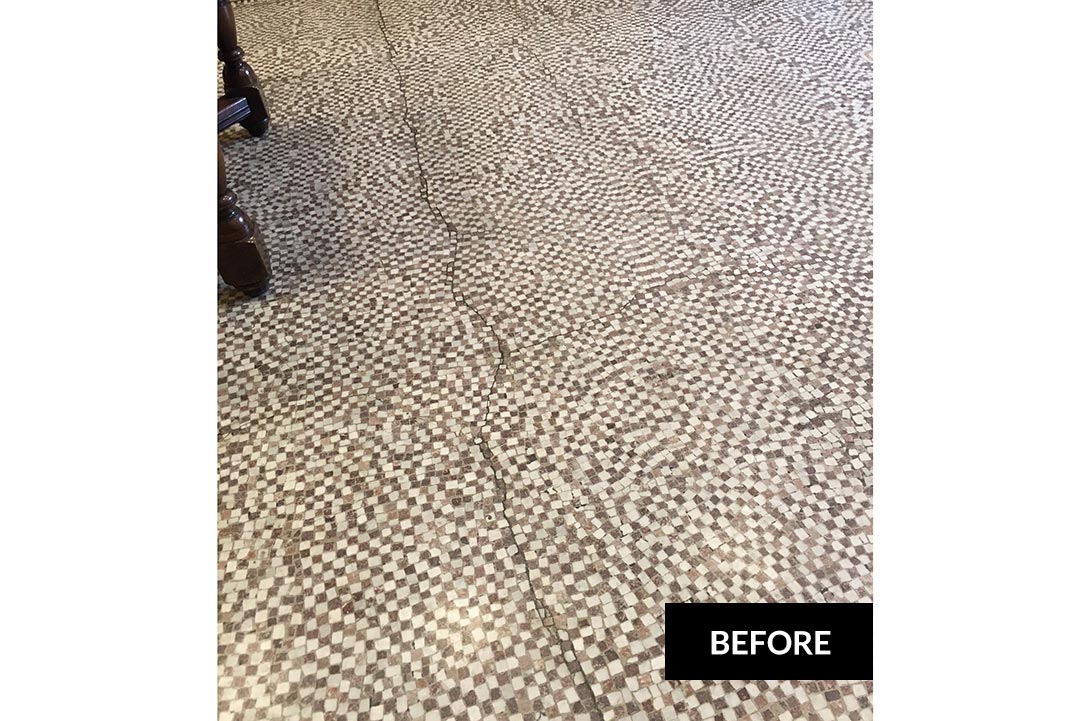 The original floor had several damages. Some areas had missing mosaic pieces due to damages or modifications over time. Plus, the floor had several cracks, wax build-up on the marble, and scratches and stains on the marble mosaic.