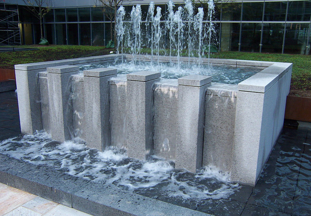 Rugo fabricated a bright white granite and assembled the water feature with high precision.