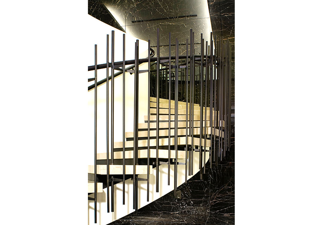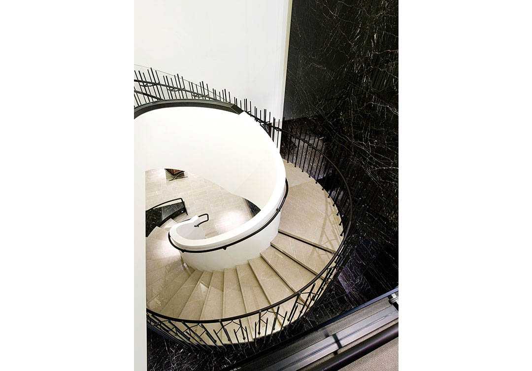 Located directly in front of the feature wall stands the elliptical staircase made of Corinthian Beige Mable. What makes this staircase so unique is that each cubic stair tread is individually supported. Due to the design of the geometry, each tread is a separate piece size and configuration. The landing is also one solid 4” thick panel roughly 8’x6’. To accomplish such a unique design, our team and the Steel contractor worked hand in hand to coordinate each element of the project. The outer part of the cubic tread is cantilevered beyond the steel support system and is integrated with the baluster system. The railing posts penetrate each stair tread, and a load of weight is shifted to steel brackets located on the underside of each tread. The exceptional craftsmanship of this staircase allows for the stairs to look as though they are floating in the air. This precise fabrication was achieved through diligence and cooperation from the steel contractor, the general contractor, and our team. At the bottom of the elliptical stairs sits a visually stunning raised plinth. This plinth, constructed of Noir St. Laurent, carries the same radii as the elliptical staircase.
