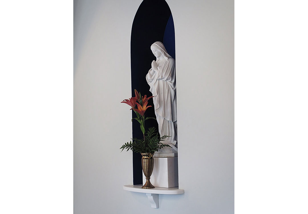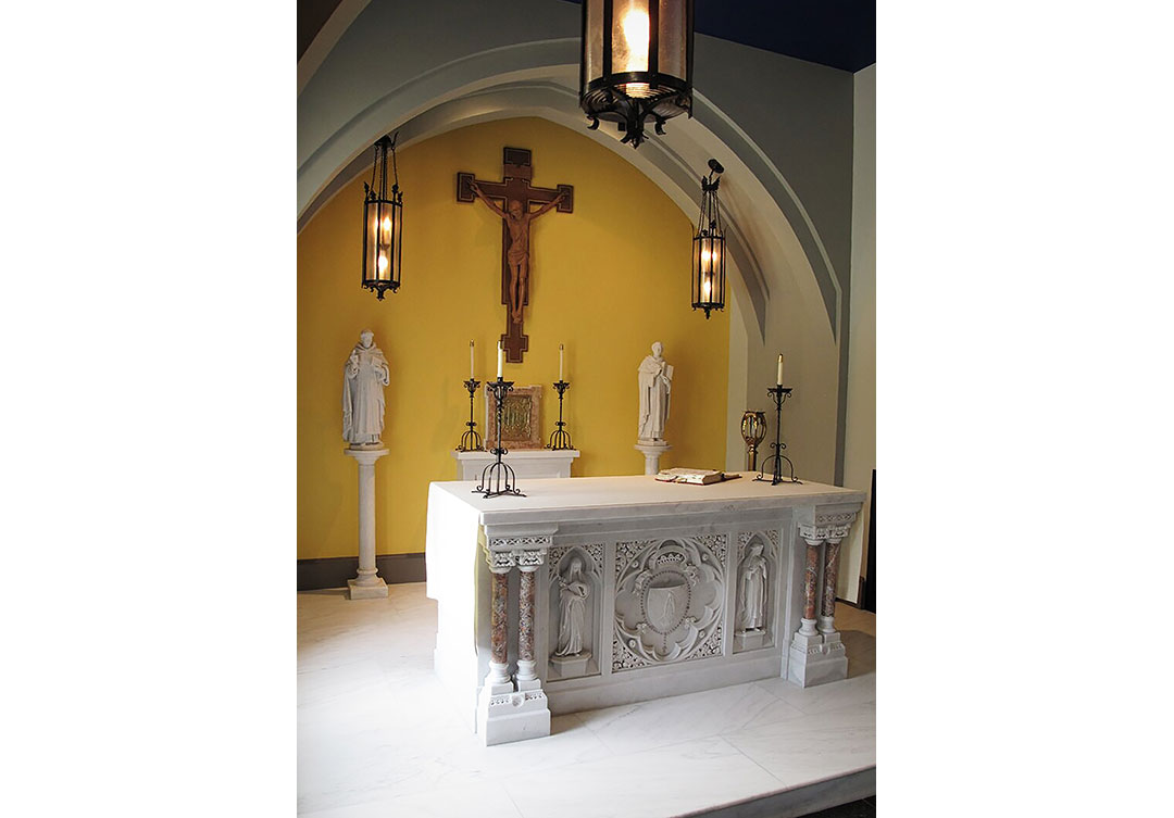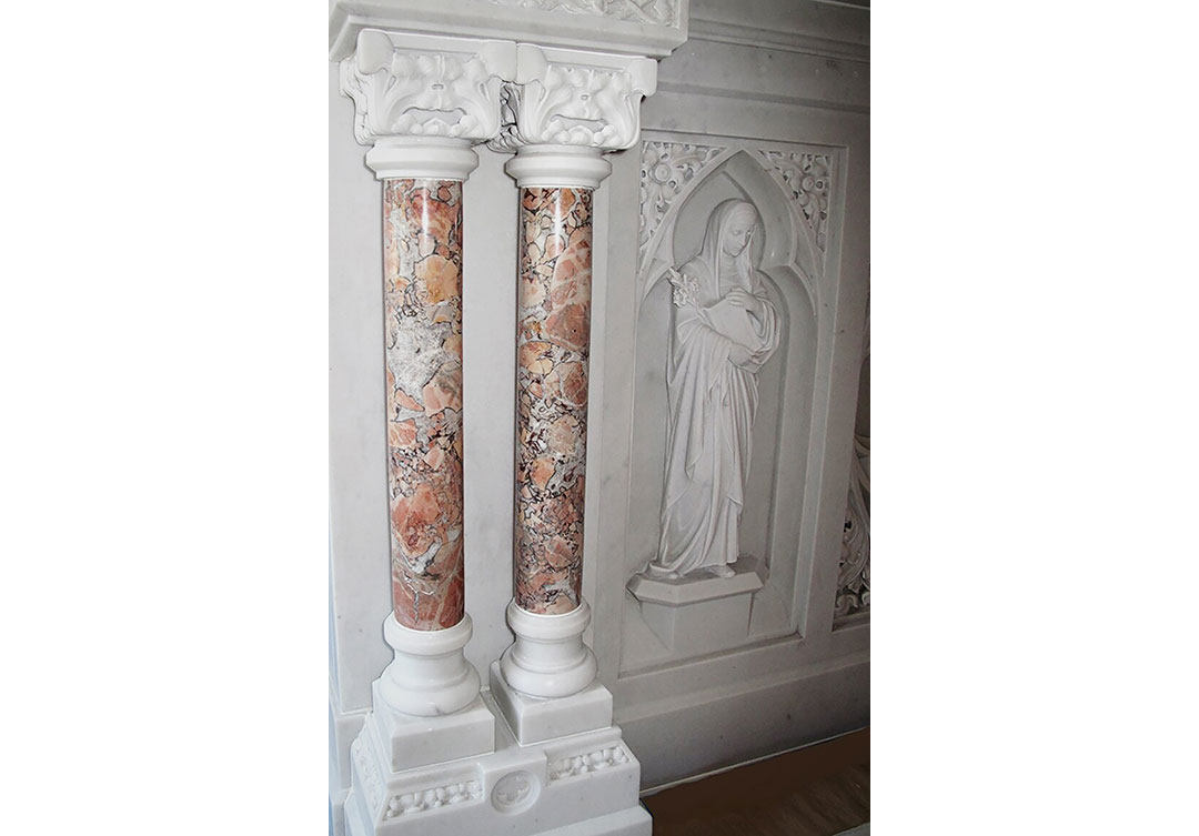 Our team removed the existing marble platform, and furnished a new raised platform of the same Olympian White Danby marble. The next step was to fabricate and install the new fused rear altar of Bianco P marble with an accent color of Rosso Nembro.The final phase of the project was the restoration of various round stone statues of Catholic saints.