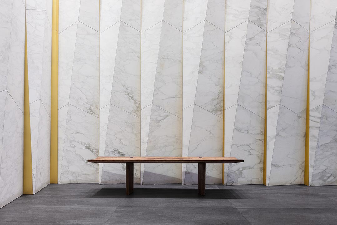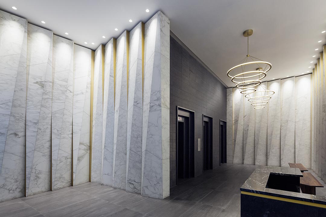 Rugo Stone was top of mind for the team at Walker Zanger when it came to fabricating the marble for the complex design in the lobby. This unique lobby design features “pleated” walls in hand-selected, fine veined Calacatta Caldia marble, with hints of bronze-tinted aluminum between each marble pleat. First, the Rugo Stone team prepared detailed shop drawings and digital slab layouts to locate the saw cuts on the slabs, ensuring perfect vein matching from panel to panel. Using these layout drawings, Rugo then cut the panels on a waterjet machine to precisely cut the unique triangular and quadrilateral shapes. Then using a CNC machine, Rugo milled the edges to create custom angle cuts, which formed the pleated design. The team dry-assembled each marble panel on plywood to mock up the installation conditions as a final QC check. For this, Rugo built special crates based on the sizes of the pieces, carefully packed and sent to the final installation. The final result is an elegant design with perfect vein matching.