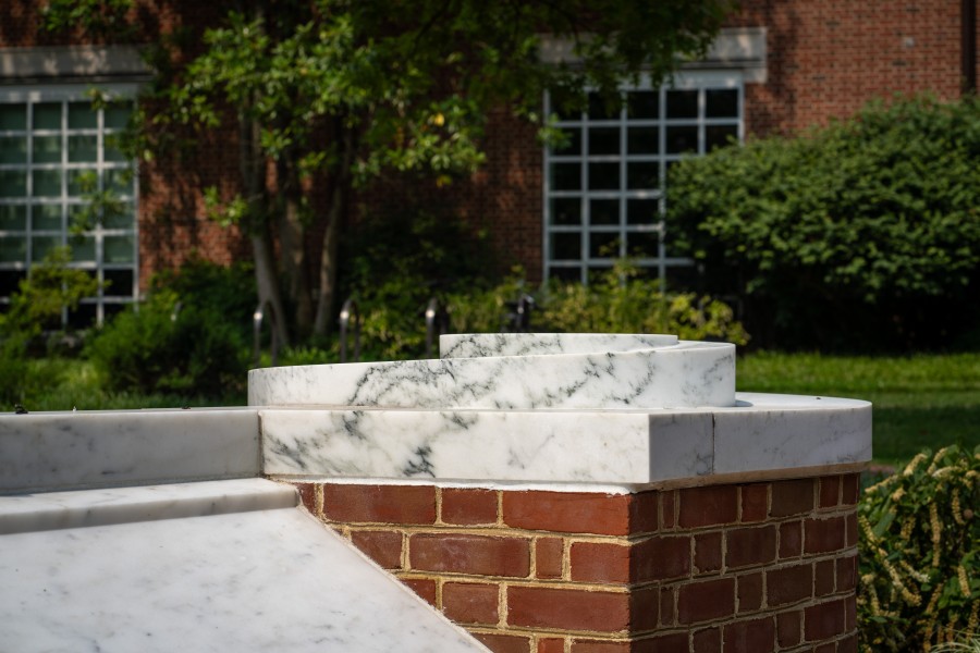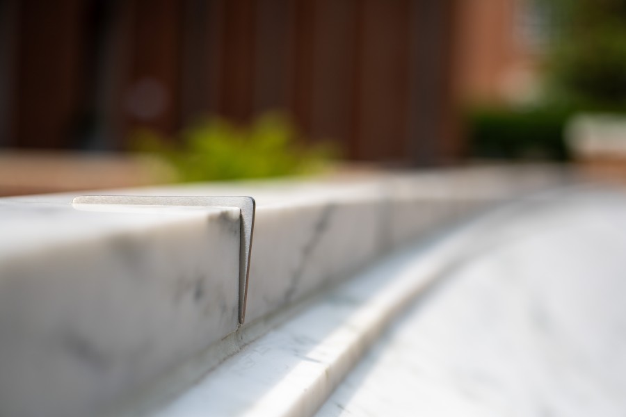 The Wyman Wall, a landscape addition along a pedestrian walkway, features complex geometry, including a dramatic ramp and twist coping fabricated from Mountain White Danby marble. The coping is not simply linear but incorporates spiraling volutes at both ends. Achieving this required precision 3D modeling and CNC fabrication, followed by meticulous hand-finishing. The precision required to create compound slopes and varying radii made this aspect of the project particularly demanding, pushing the limits of both digital and manual craftsmanship.