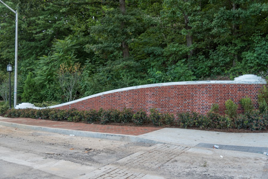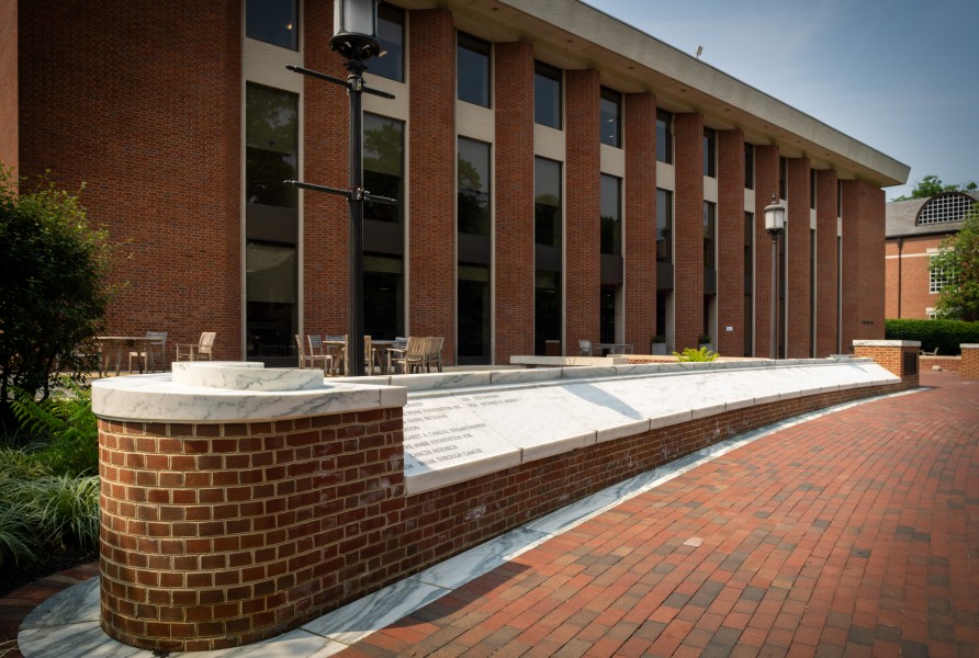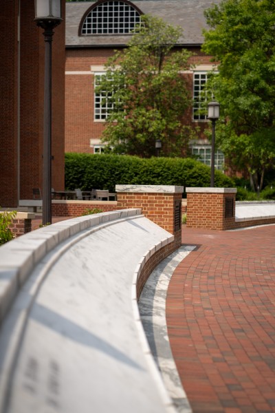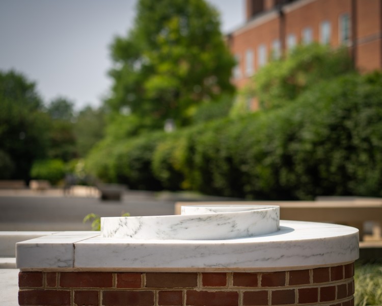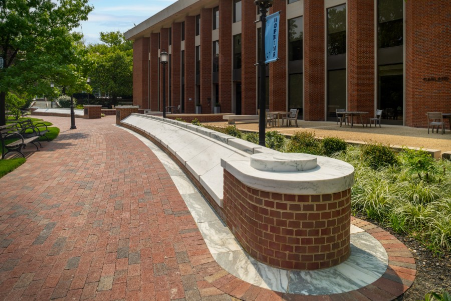 The Founders’ Wall serves as a monumental tribute to the university’s most generous benefactors, featuring Olympian White marble walls, Mountain White marble coping, and Danby Grey marble paving. The design of the wall incorporates spiraling volute caps at both ends, reflecting classical architectural aesthetics while demonstrating Rugo Stone’s mastery of contemporary stone fabrication techniques.