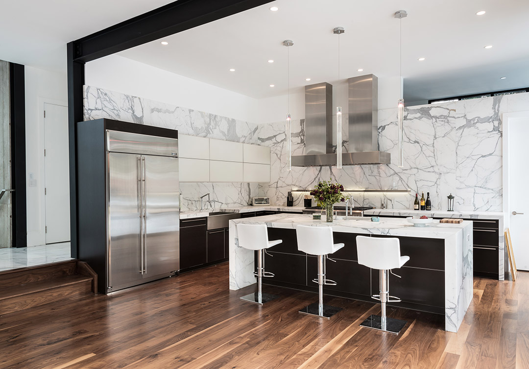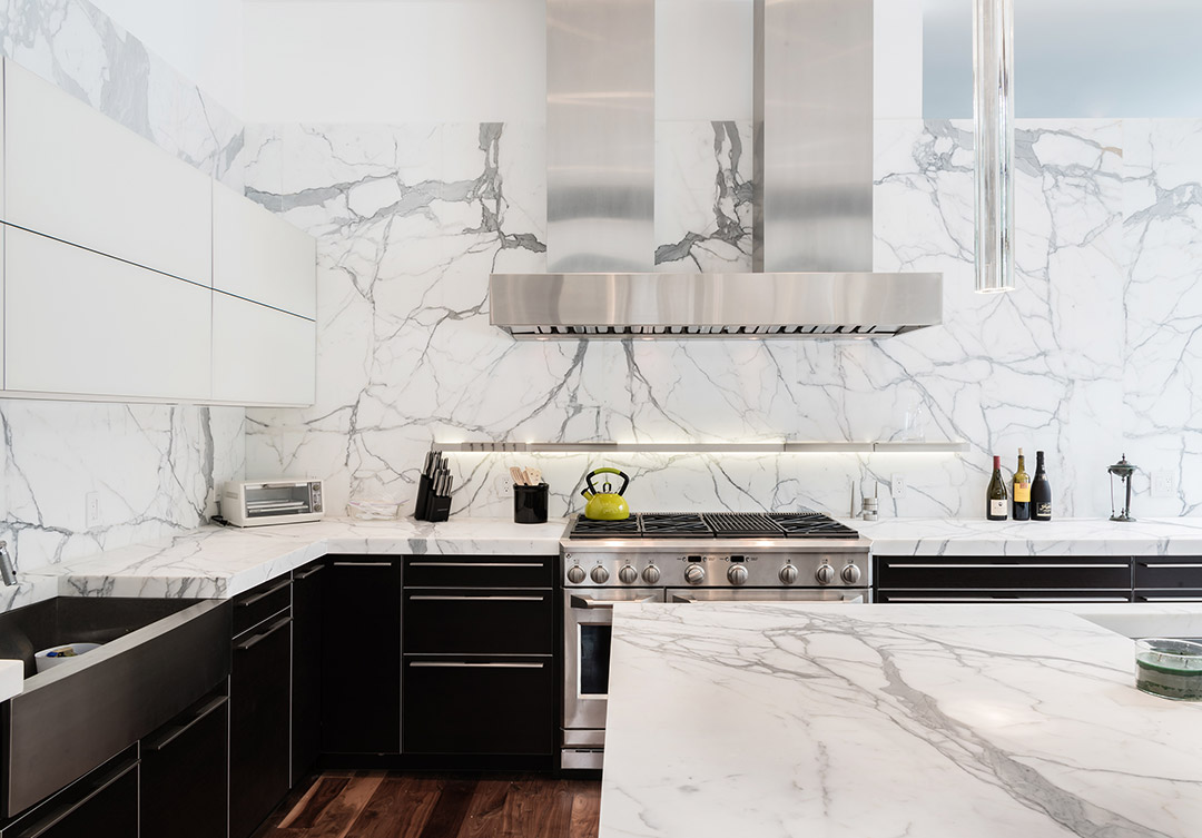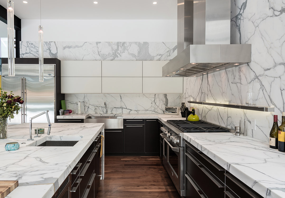 This project was special and unique; the homeowner had an excellent taste for natural stone and designed his kitchen with meticulous attention to stone selection and detail. The Rugo team handpicked the best choice of Statuary marble for this project as desired by the homeowner, performed digital slab layouts to book-match the veins at joints to create a grand marble mountain look on the full height backsplash which was 6′-6″ tall from countertop to ceiling.