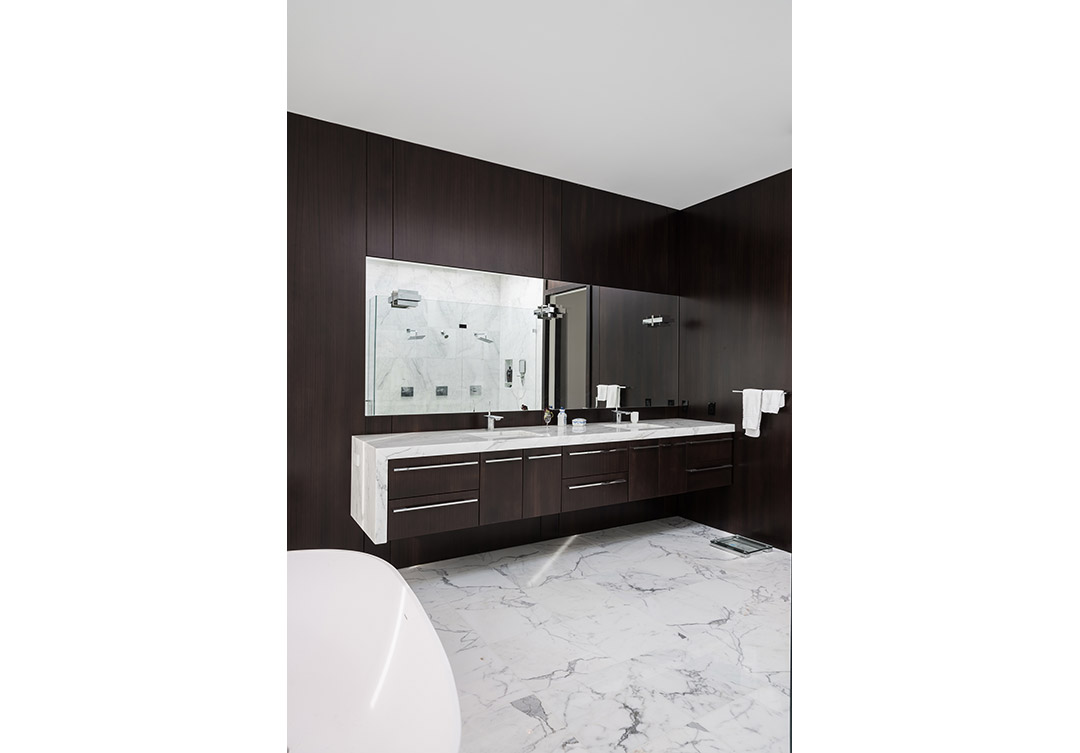 The center island was wholly clad with marble all around; all the edges were mitered and epoxied to create a “monolithic” appearance. We installed full-height backsplashes with anchors to be secured to the stud wall behind and designed the anchorage to support the stone’s load to avoid bearing the weight on the countertops.