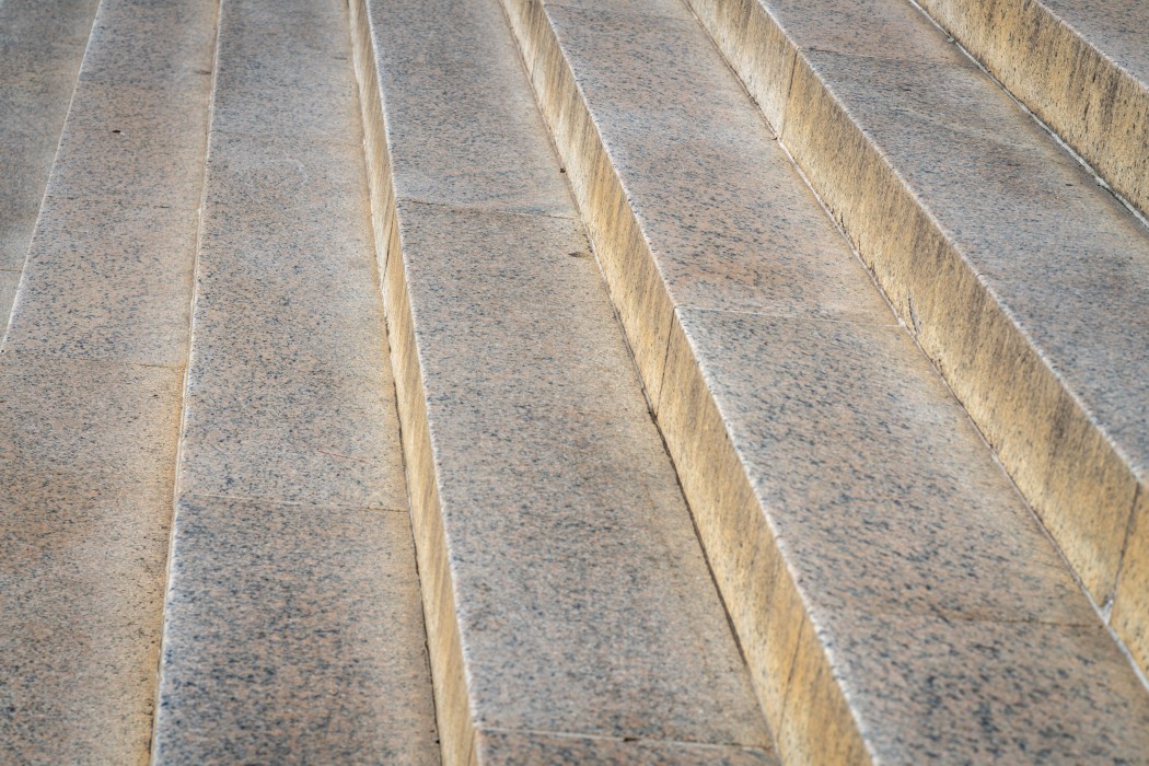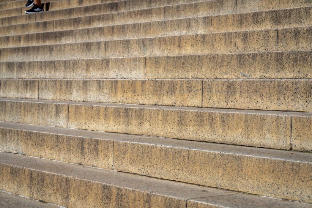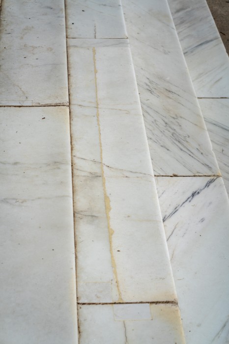 The scope included dismantling, salvaging, repairing, and reinstalling thousands of existing stone elements including landings, pavers, copings, and marble treads. Damaged stone was replaced with new material, and granite lintels at doorways were carefully modified and reinstalled to widen access points. Every stone was surveyed against seven evaluation criteria, labeled, photographed, and documented through sketches to ensure precise reinstallation.