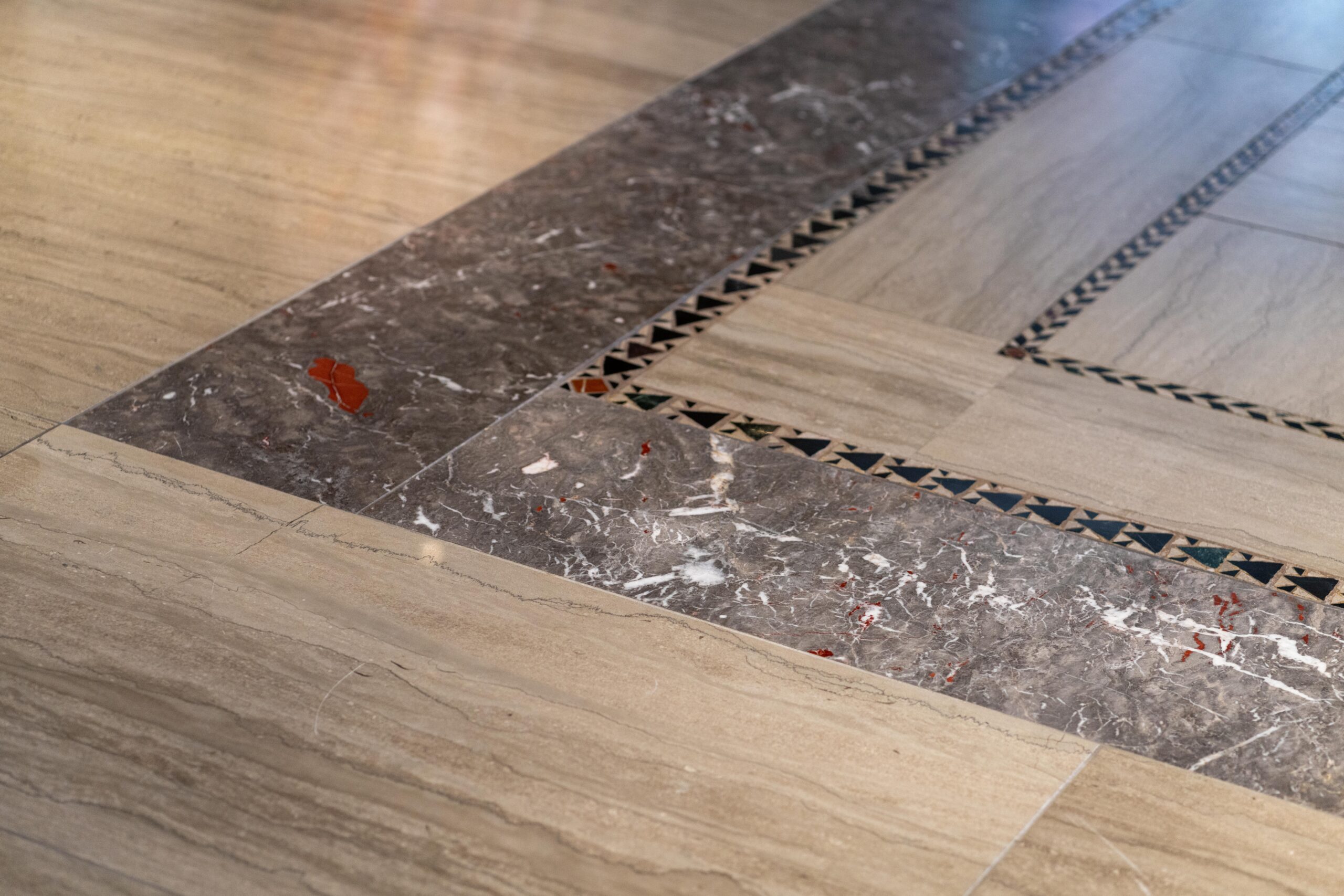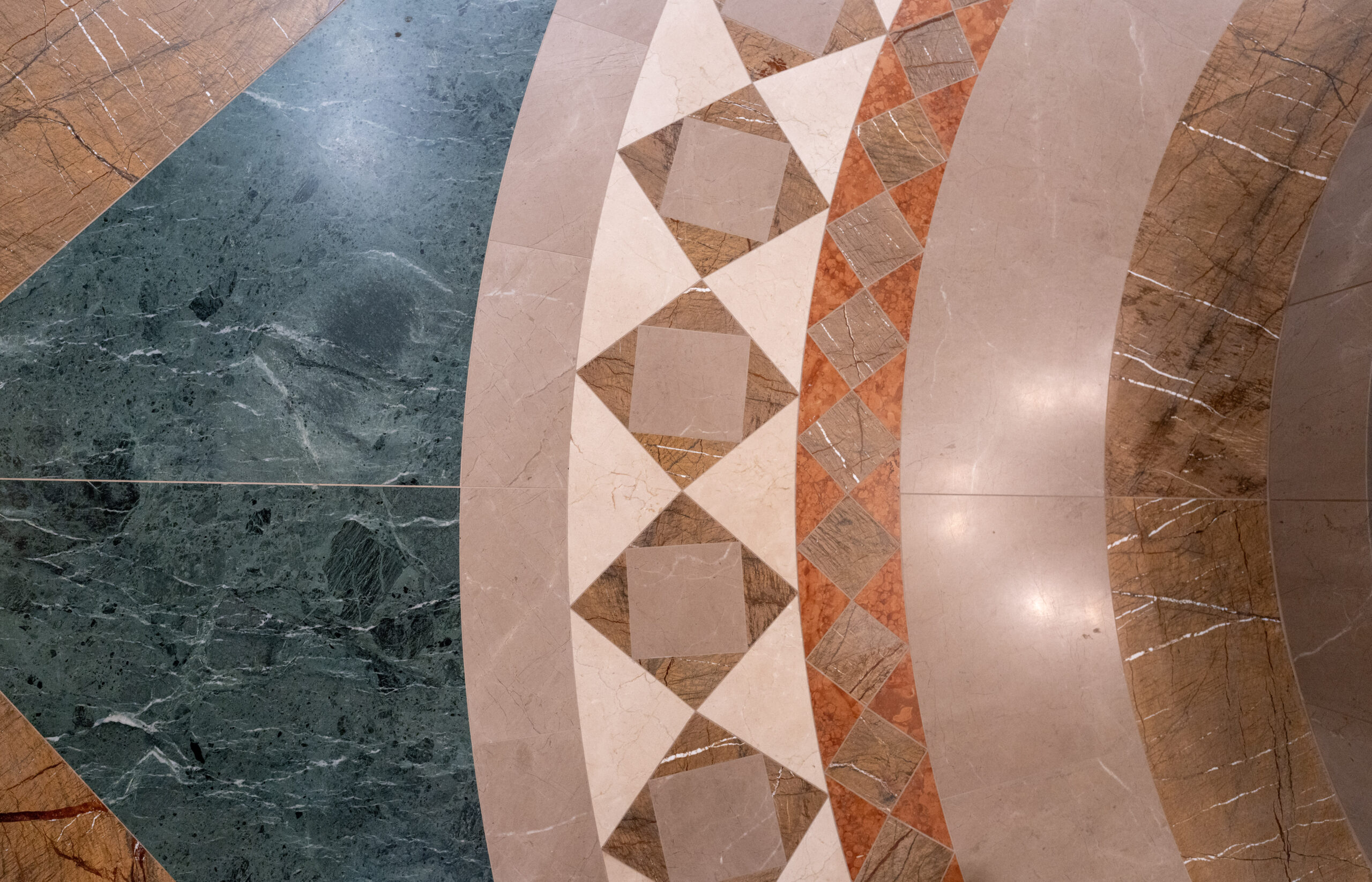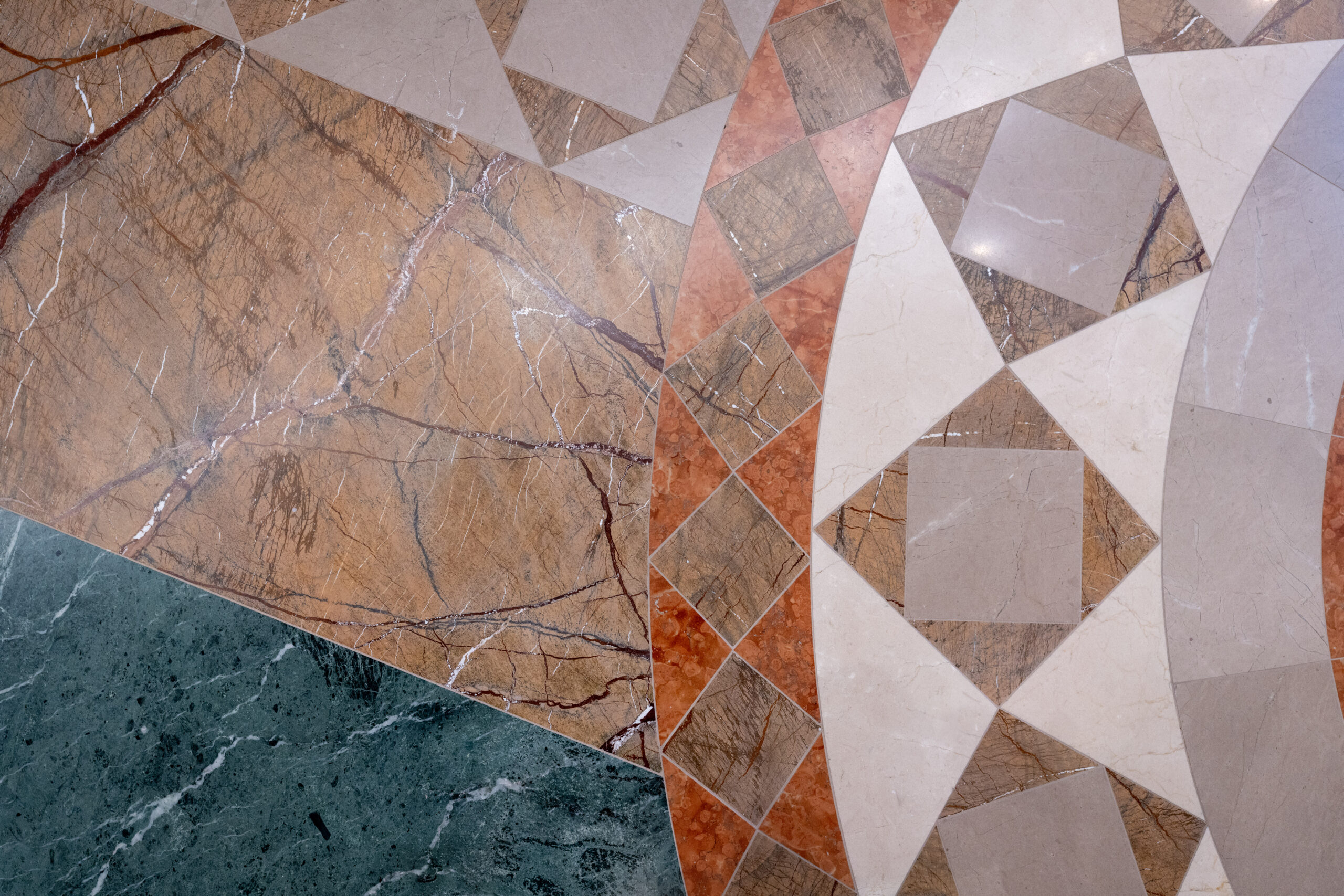 Rugo Stone’s scope included the removal, salvaging, restoration, and reinstallation of approximately 30,000 square feet of interior paving, steps, door & window casings, along with additional exterior paving on pedestals at the 12th floor Rooftop. Napolean Gray and Calacatta Lincoln marble were used for the lobby floors to match existing and added floor areas, both are stones quarried domestically in the US. Aurisina Fiorito, Bois de Jordan and Botticino Classico marbles were used for the wainscot and wall panels. In the lower level our team installed a waterjet cut, mosaic floor with various, colored marbles. The floor was made with various geometric shapes and they were all interconnected, so precision was key in execution of the design. Precision fabrication, quality control and dry lay review in the shop, along with extensive field measurements helped Rugo team achieve this grand floor installation.