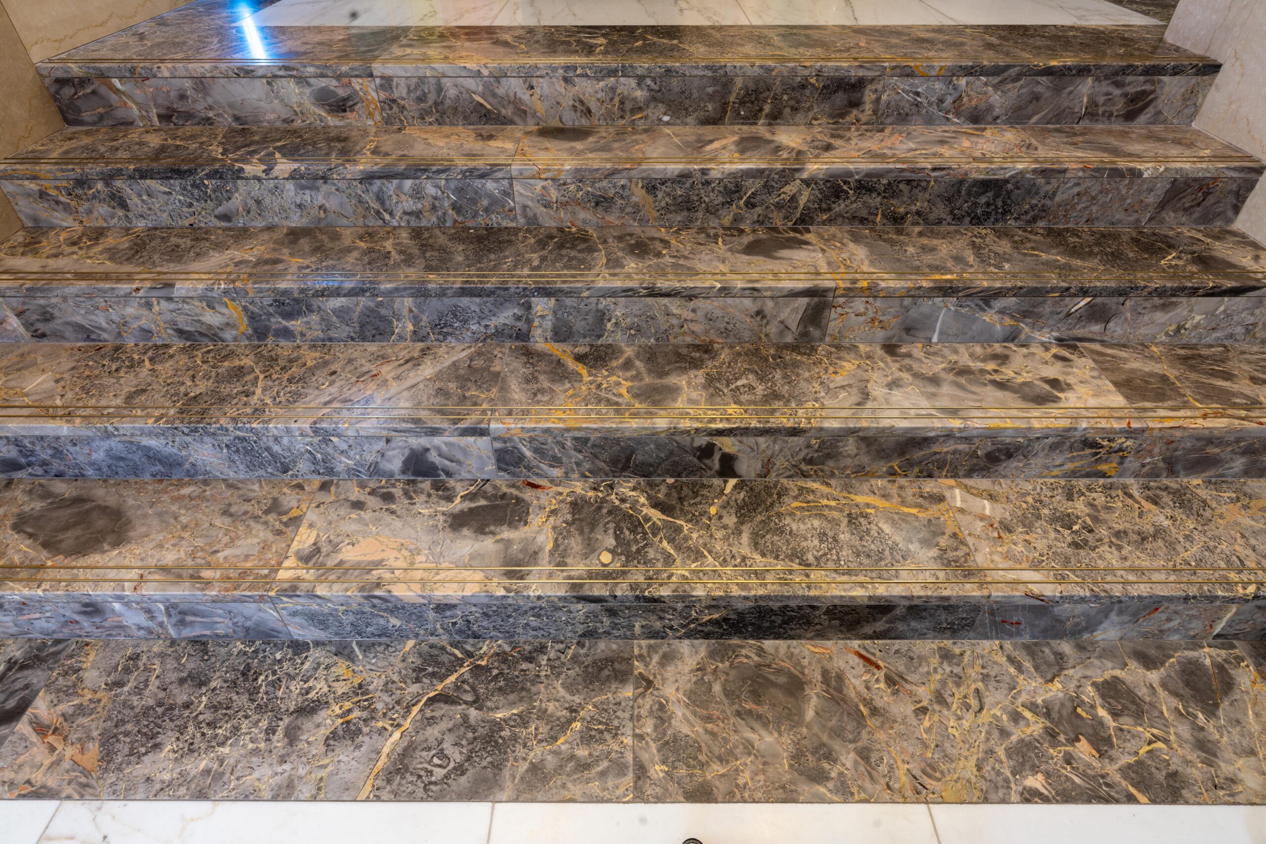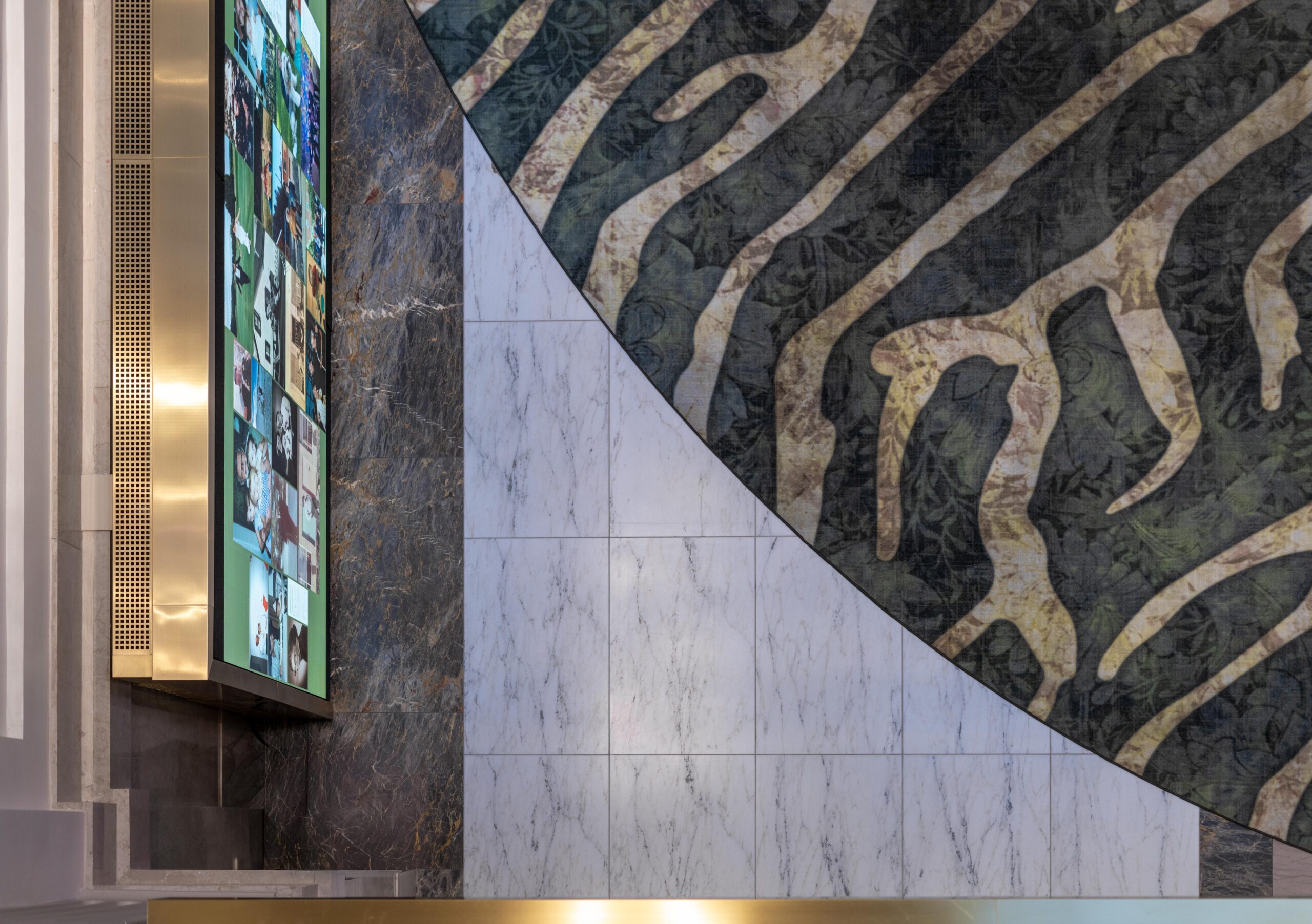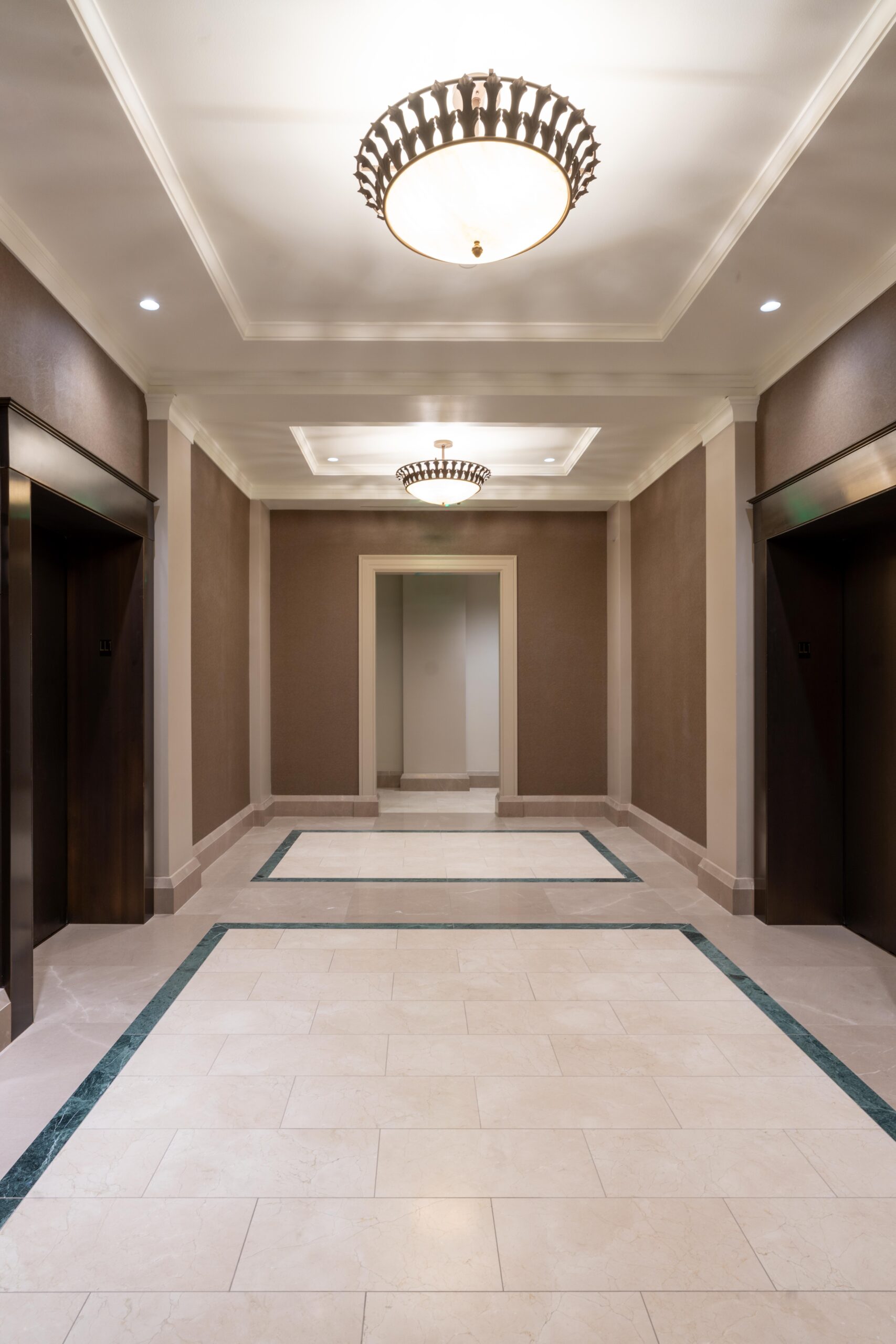 Rugo Stone’s scope included the removal, salvaging, restoration, and reinstallation of approximately 30,000 square feet of interior paving, steps, door & window casings, along with additional exterior paving on pedestals at the 12th floor Rooftop. Napolean Gray and Calacatta Lincoln marble were used for the lobby floors to match existing and added floor areas, both are stones quarried domestically in the US. Aurisina Fiorito, Bois de Jordan and Botticino Classico marbles were used for the wainscot and wall panels. In the lower level our team installed a waterjet cut, mosaic floor with various, colored marbles. The floor was made with various geometric shapes and they were all interconnected, so precision was key in execution of the design. Precision fabrication, quality control and dry lay review in the shop, along with extensive field measurements helped Rugo team achieve this grand floor installation.