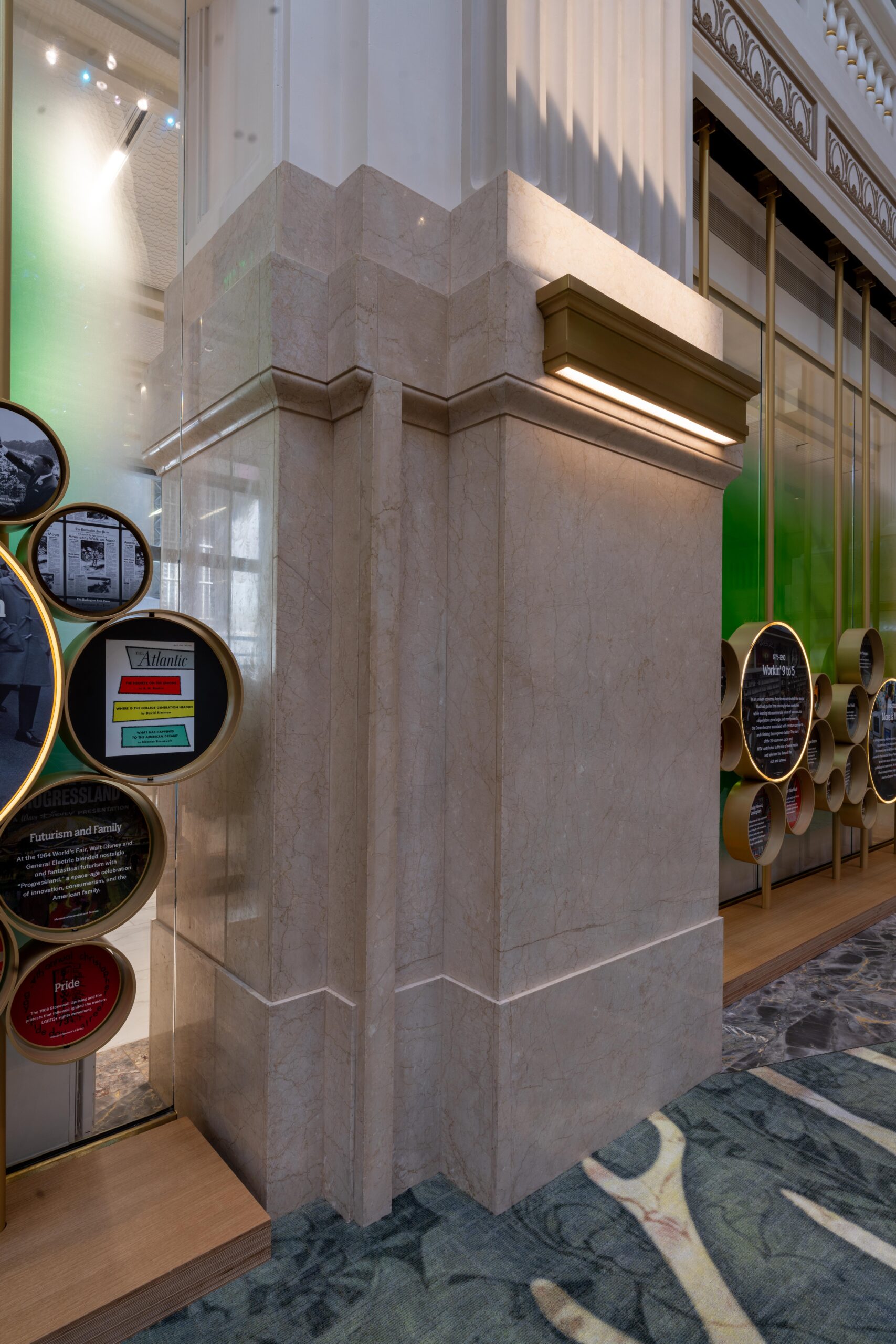 Rugo Stone was engaged early in the design process in 2021 by Shalom Baranes Associates to consult on all stone-related aspects of the project. The Rugo team identified the original historic marble types, researched matching sources, and established direct relationships with quarries to supply new material consistent with the original design.
