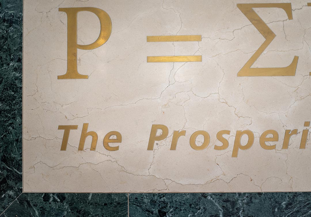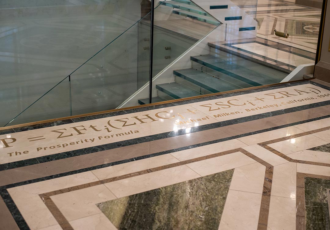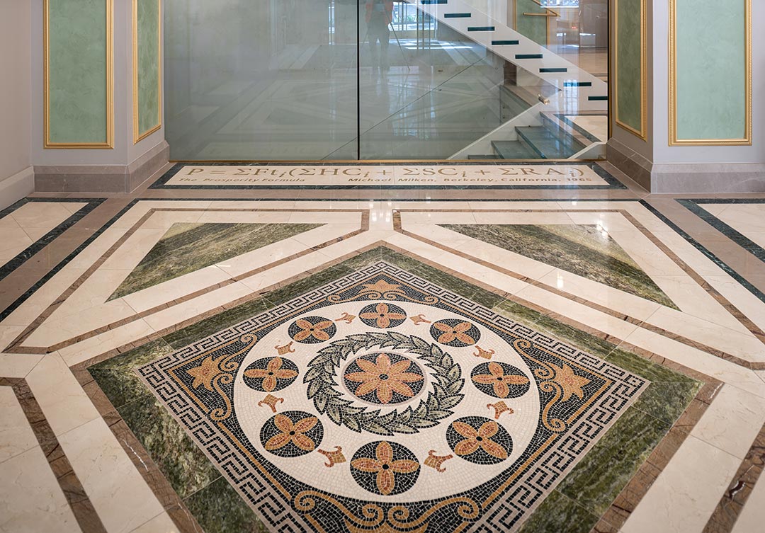 Rugo also produced special lettering cut from Bronze and inlaid into the marble with zero joint. The lettering forms the prosperity formula created by Mr. Milken.