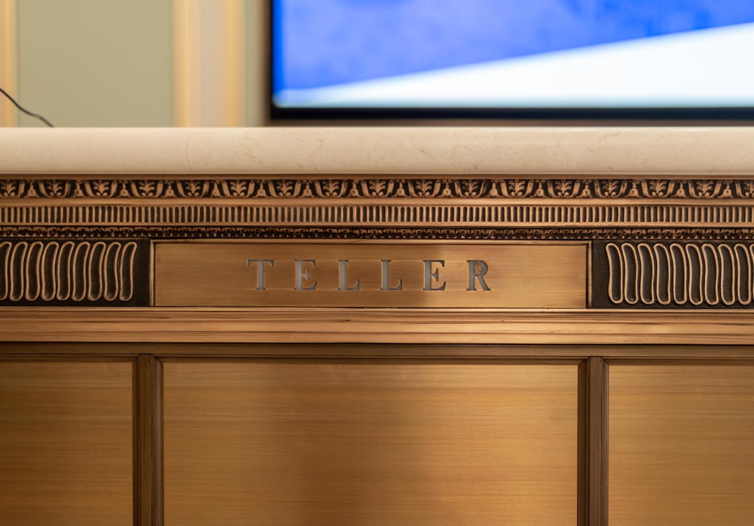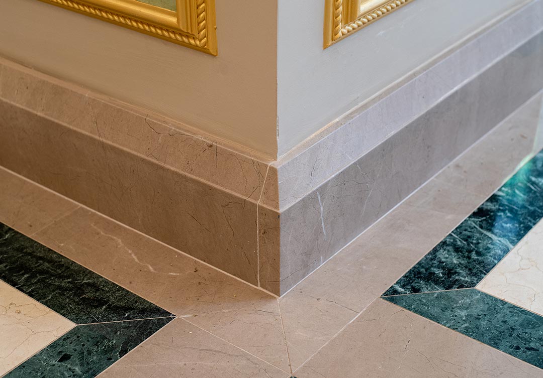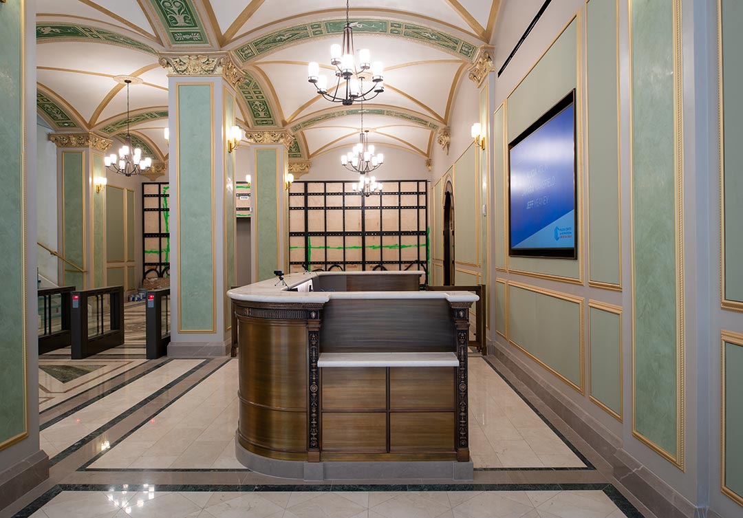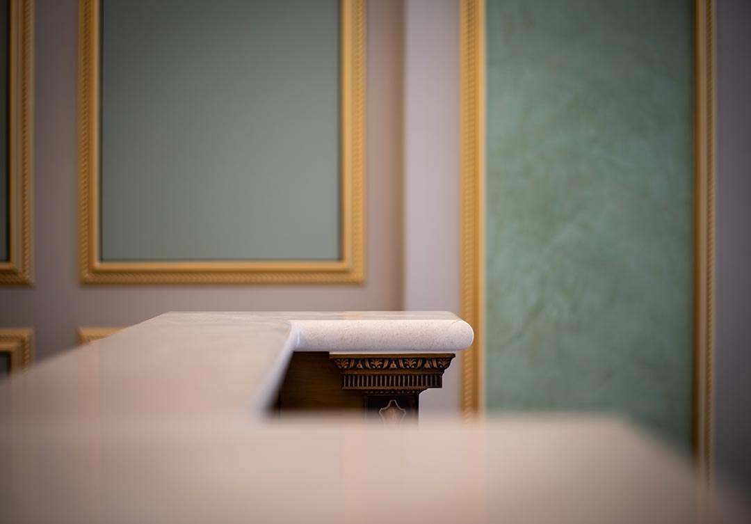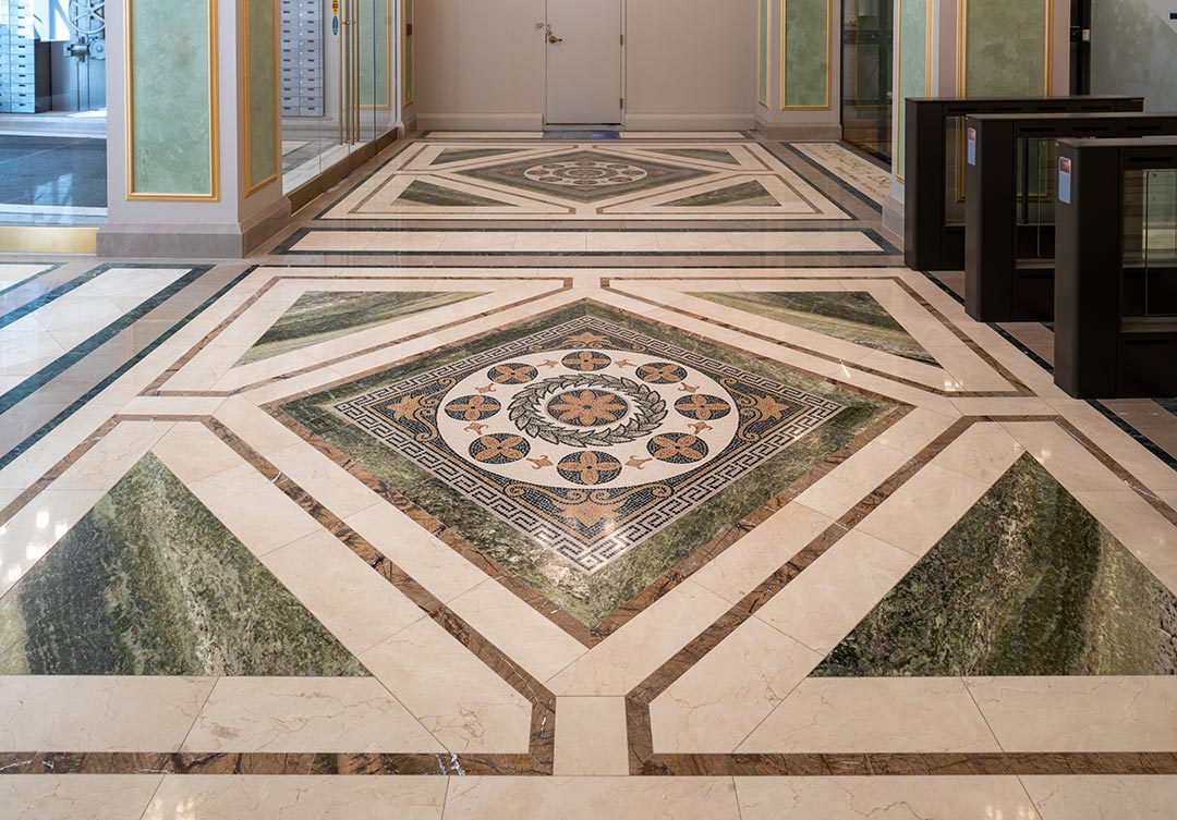The floor features three preassembled, hand-cut marble mosaics, all cut and assembled in Rugo’s in-house mosaic studio. These large mosaic panels are surrounded by elegant banding of Irish Connemara, hand-selected to show the gradation from light green to dark green. The balance of the flooring is first-choice Crema Marfil from the Cotto quarry, selectively sawn to eliminate all mud seams. The borders and bands are in Verde Issorie, Corinthian Beige, and Rainforest Brown. Once complete with fabrication, the entire floor was dryset in our studio to ensure a perfect fit. The desk features solid monolith, radial-faced base pieces, and monolithic countertops out of specially sawn 4cm material. The lobby base is also 4cm Corinthian Beige and features a complicated sloping top with a 1/8”-set back.