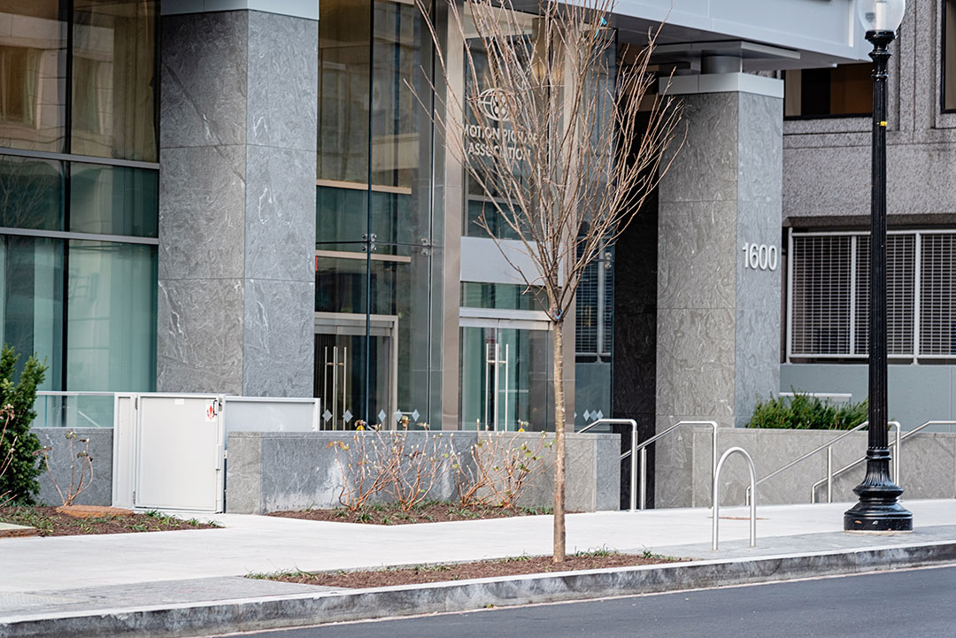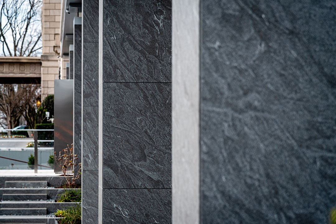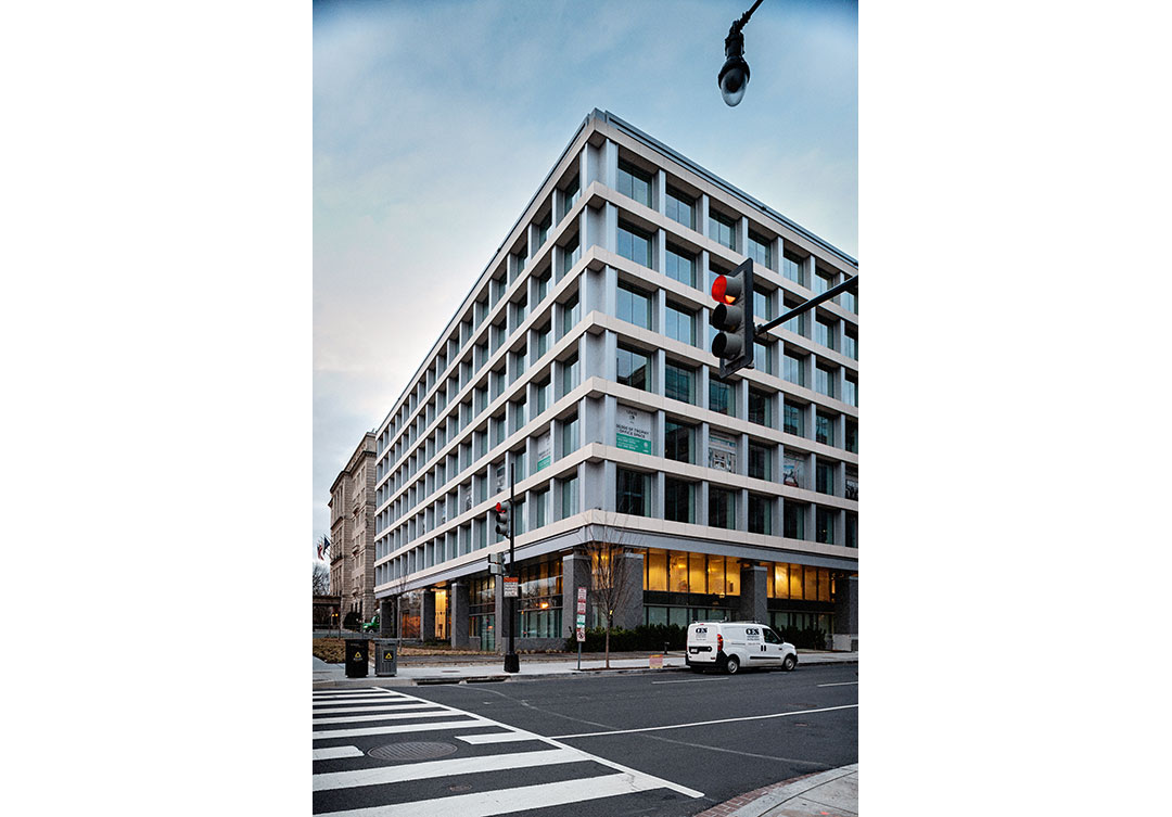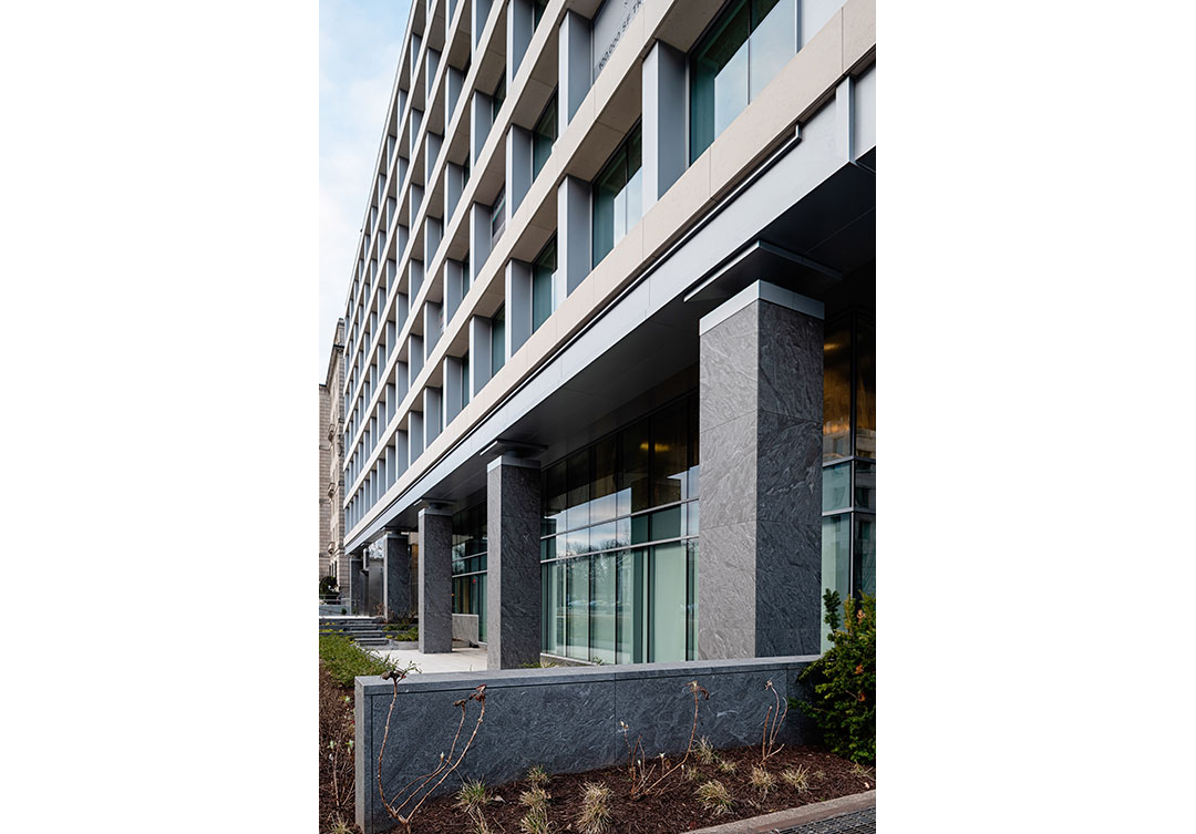 The eight-story, 90-foot-tall office building at 888 16th Street NW, within sight of the White House, was constructed around 1968 in the Brutalist style — marked by a six-story block composed of precast concrete and deeply recessed windows. Rugo Stone was engaged by design firm Gensler very early in the design process to identify the proper stone materials for the exterior re-cladding of the precast facade.