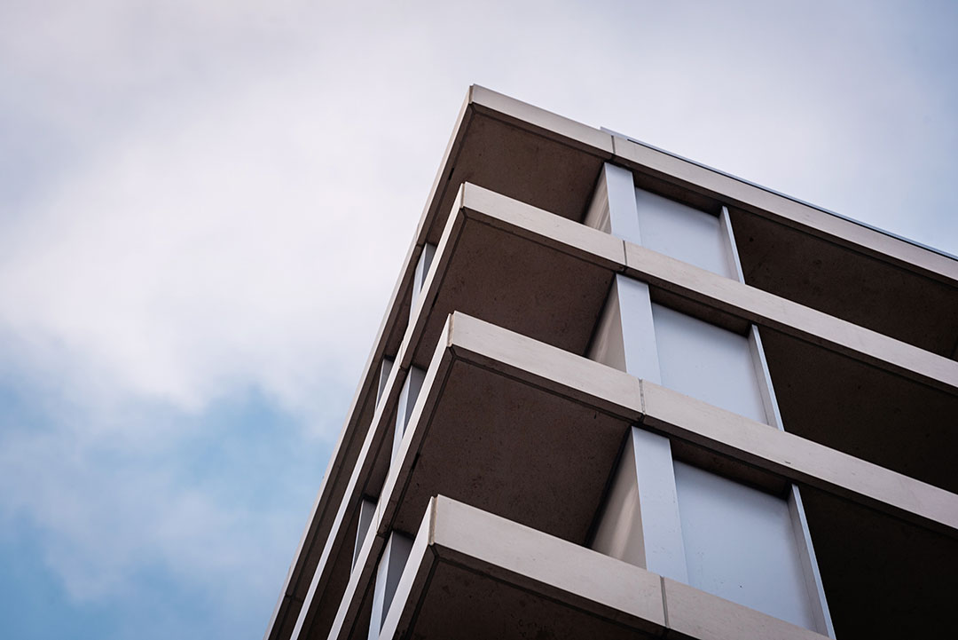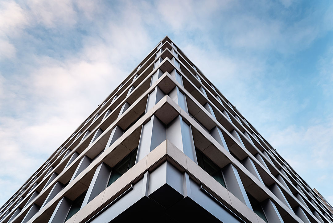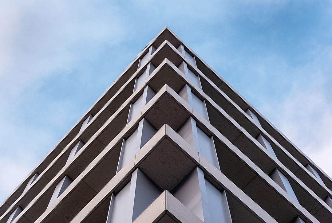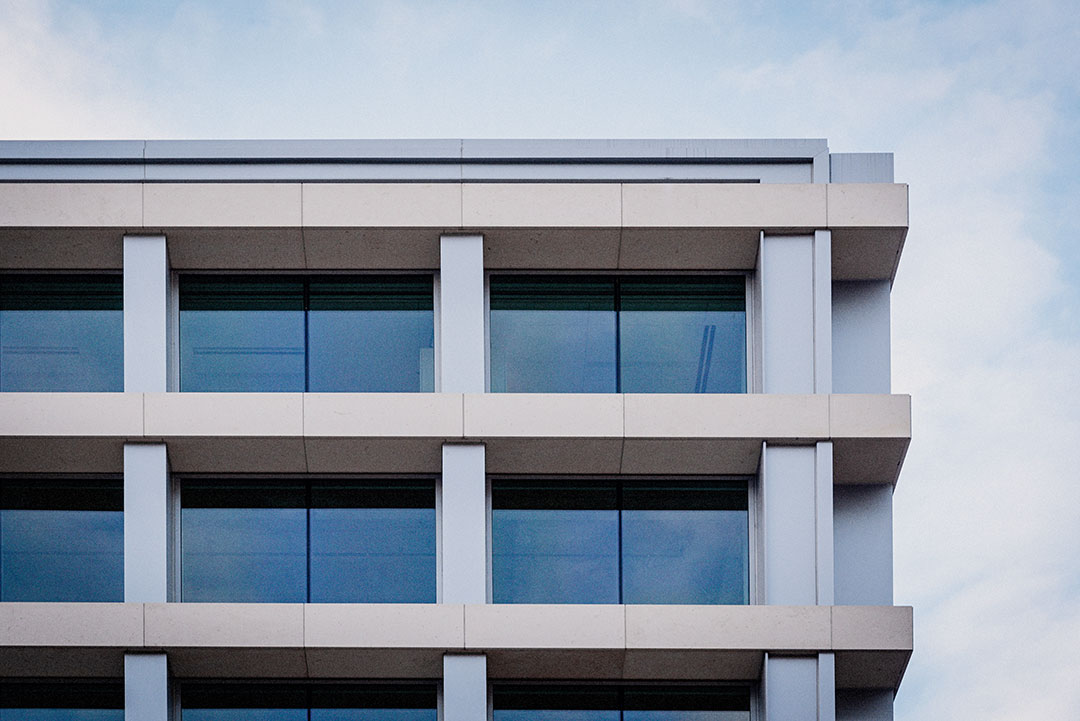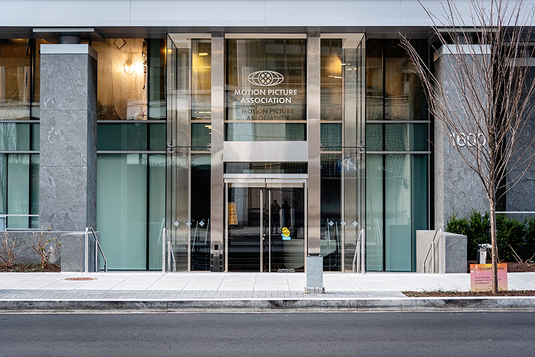 The eight-story, 90-foot-tall office building at 888 16th Street NW, within sight of the White House, was constructed around 1968 in the Brutalist style — marked by a six-story block composed of precast concrete and deeply recessed windows. Rugo Stone was engaged by design firm Gensler very early in the design process to identify the proper stone materials for the exterior re-cladding of the precast facade.