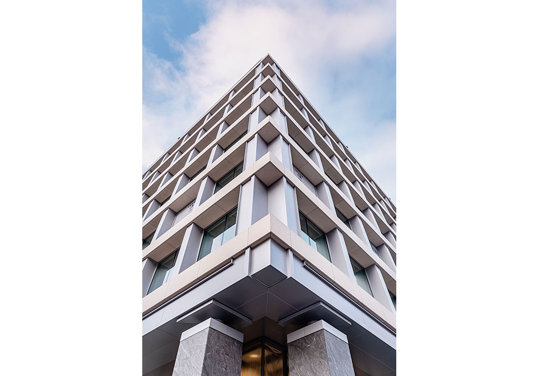 Rugo conducted extensive research on affordable and structurally reliable limestone materials for the upper floors. Rugo identified six materials, one of which was accepted by the client after Rugo completed all of the ASTM stone physical property stone and anchorage testing. Rugo designed a unique supplemental stainless steel framing system to fur out the wall cavity and create a system of blind anchors to support the new stone cladding, which had exposed stone edges and would not allow for edge anchorage of the stone. Rugo furnished and installed over 40,000 sqft of limestone and granite cladding, granite site work, and an elegant marble and travertine lobby.