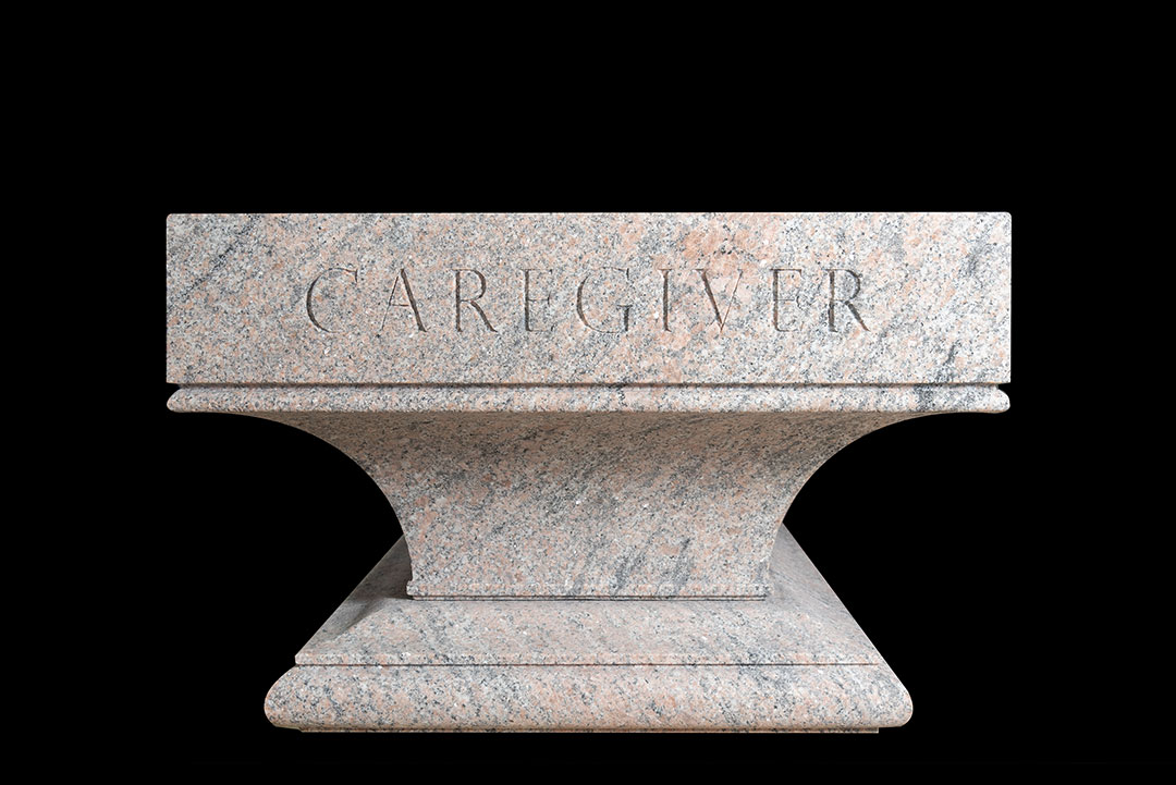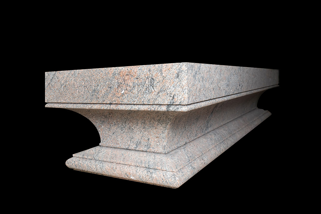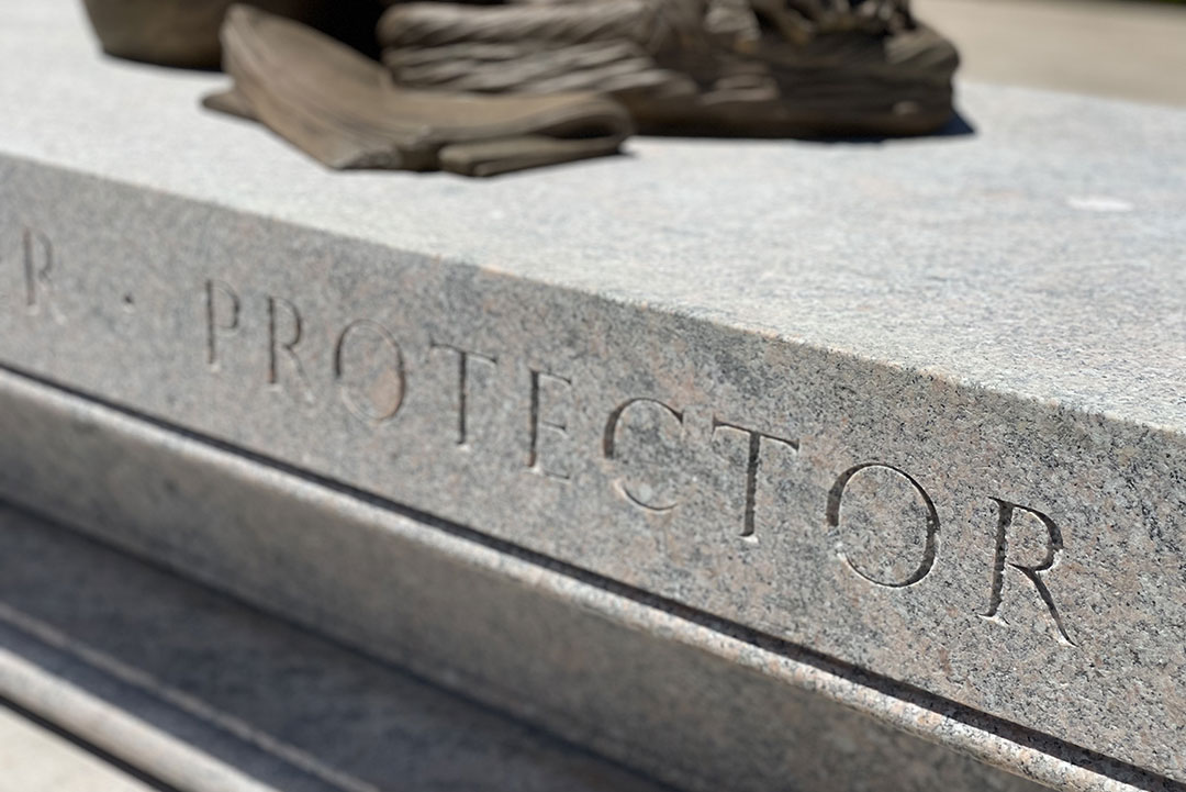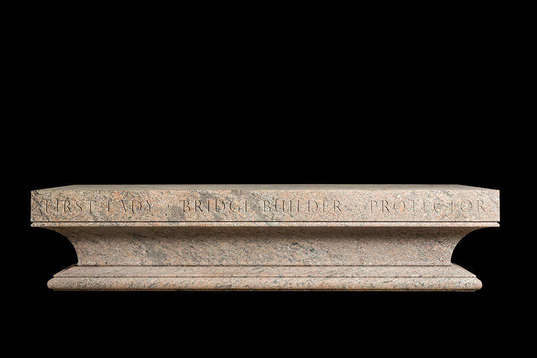 The Rugo team assisted in the stone selection process to help the client to find the best performing stone for this historic project. A granite block was hand-selected at the quarry and was shipped to the Rugo shop for fabrication. Using 3D modeling, Rugo’s team created the design, which features two pieces, a molded base and a flared top. Once the client approved, the block was milled with a CNC (Computer Numeric Controlled) machine to create the custom shape and profiles and finished with a fine sandblasted texture. Finally, the text on the stone was carefully traced and meticulously hand-cut to perfection by a master carver.