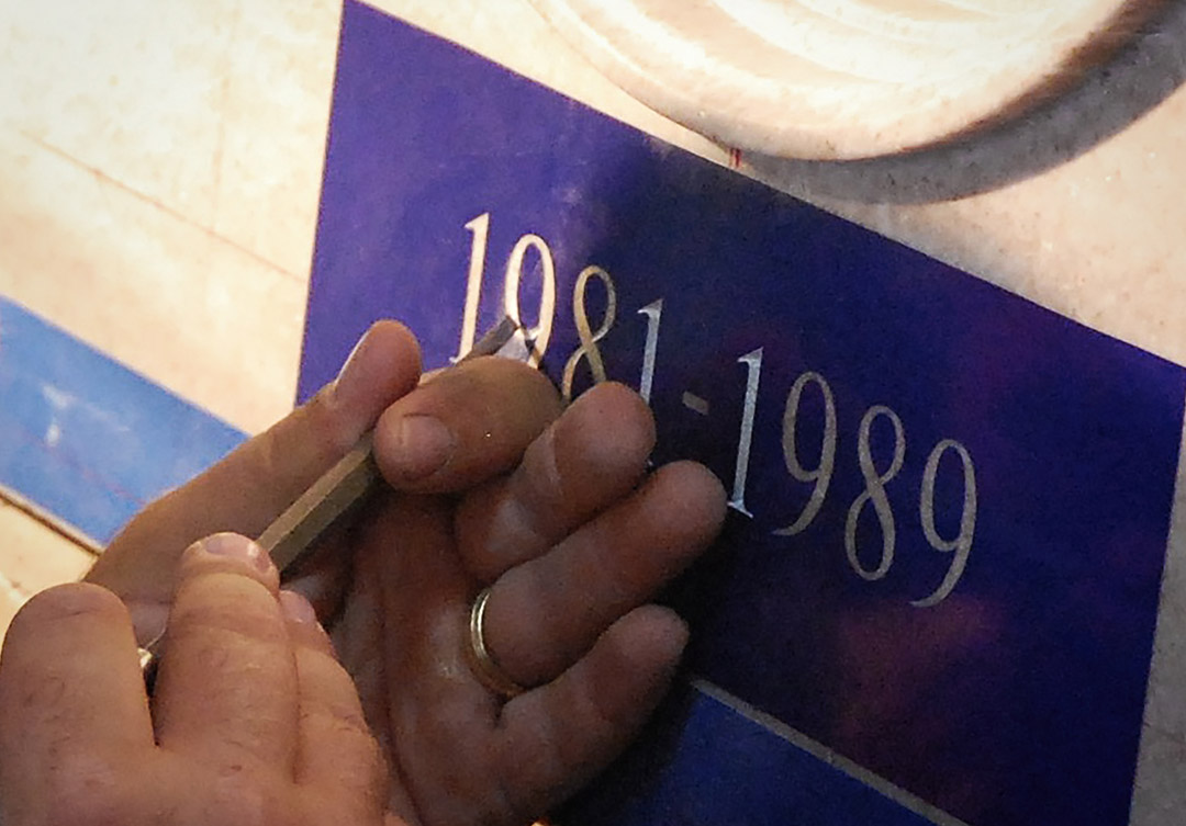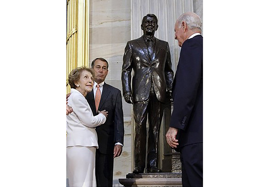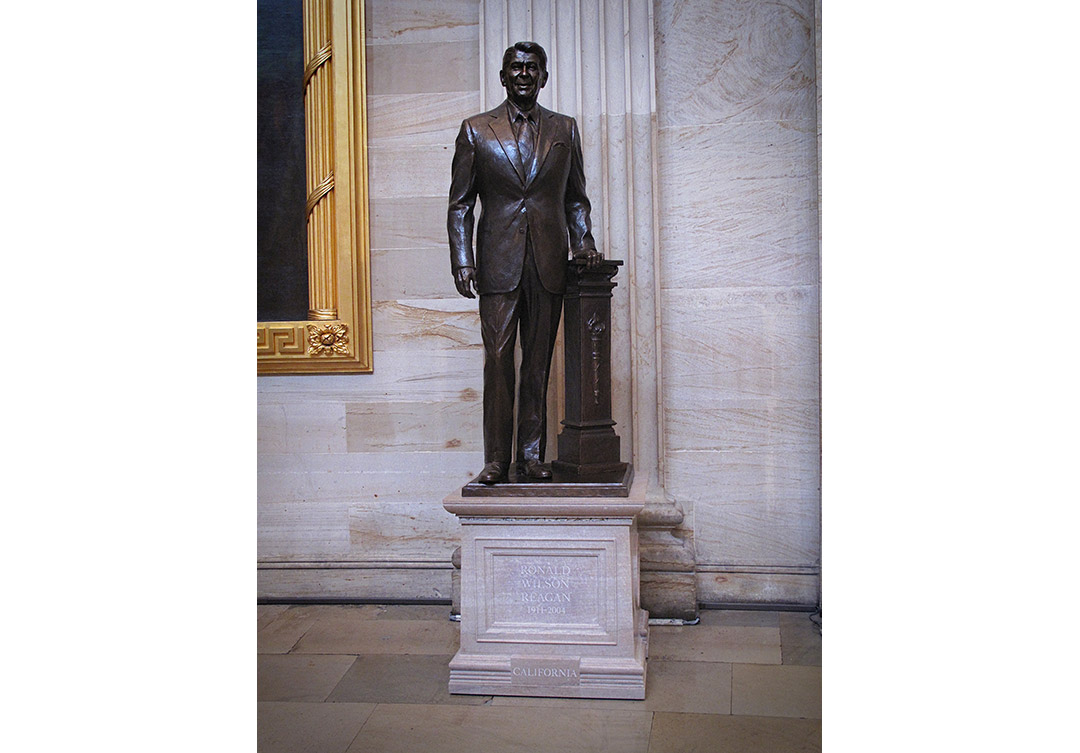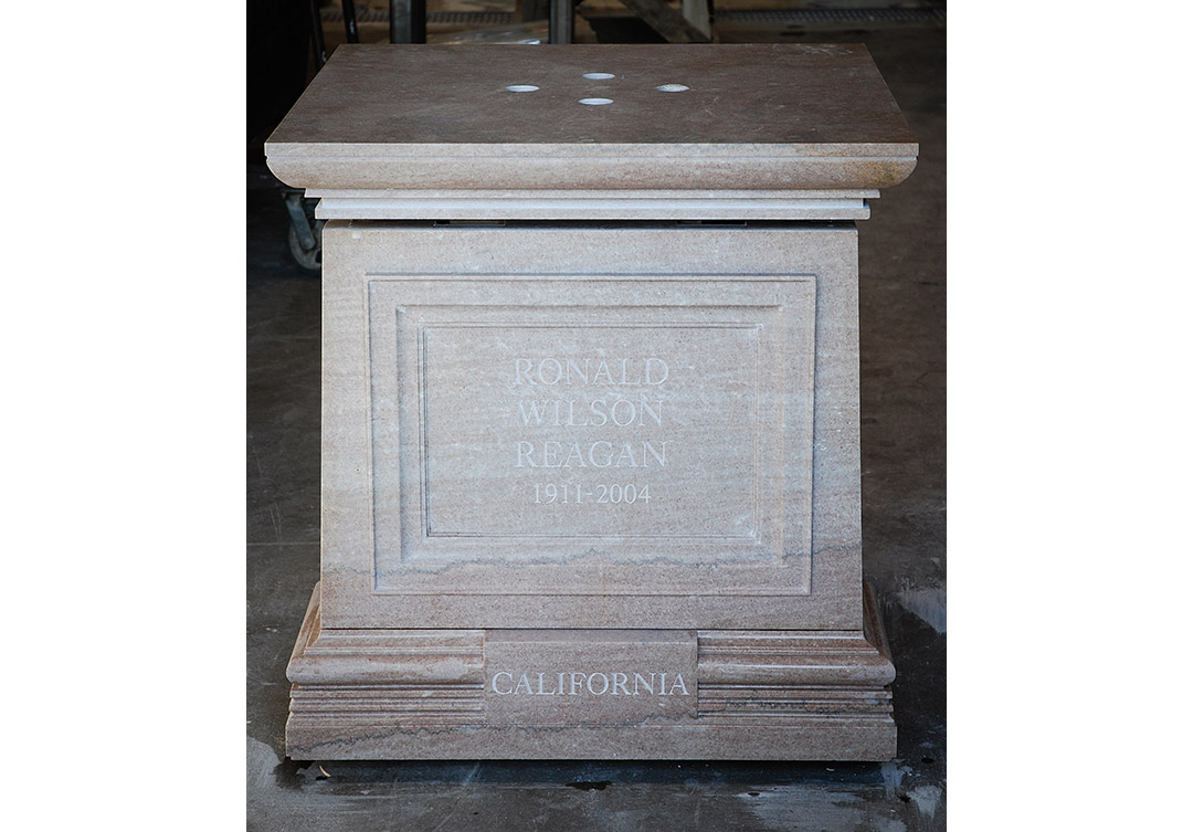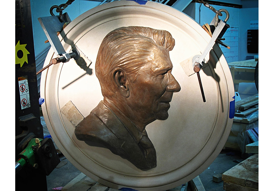 This prestigious project, mentored by Mrs. Nancy Reagan, was an honor for us to be a part of. This statue sits in the U.S. Capitol Rotunda; the Rugo team designed and engineered a custom steel support system for the stone assembly. The Tennessee Rose marble pedestal included a narrow band of concrete pieces from the Berlin Wall in between the die and the cornice, with the front of the pedestal, is inscribed with President Reagan’s name, his life dates, and the state name California with hand V-Cut letters. On both sides are bronze reliefs, which are the seals of the office that President Reagan held. Inscribed below are his terms of service, and a bronze plaque on the rear of the pedestal bears a quotation from one of President Reagan’s speeches.