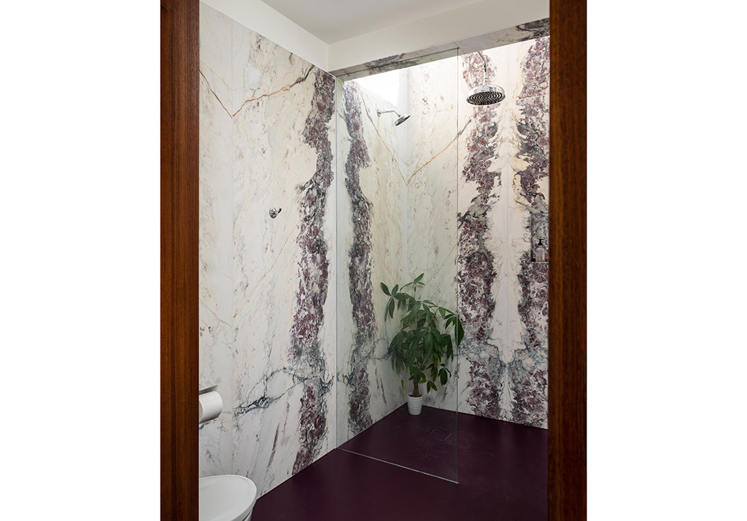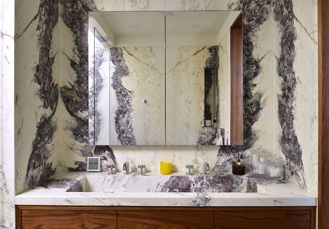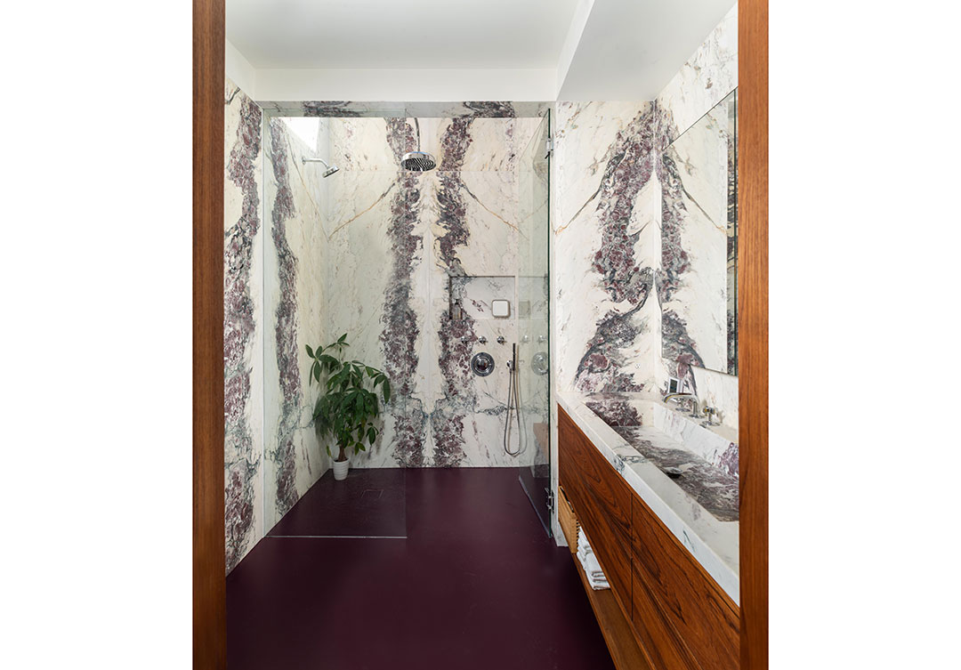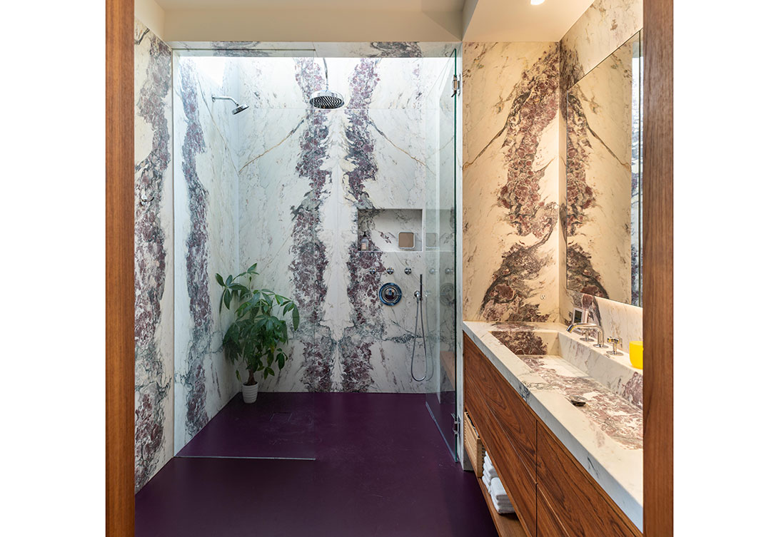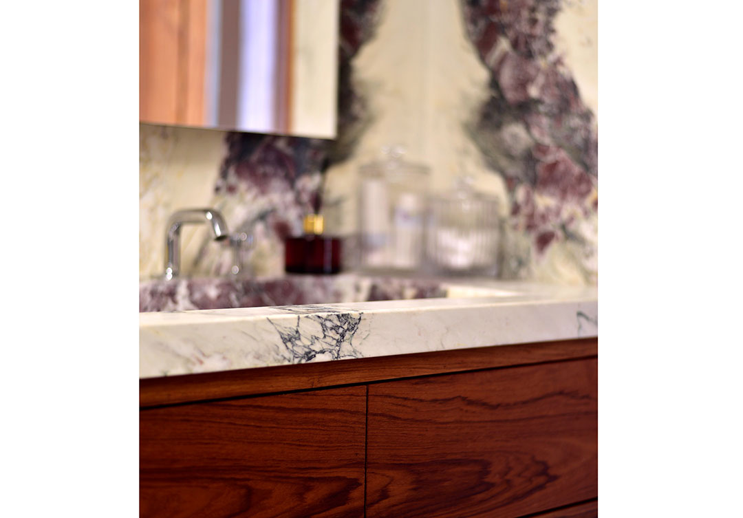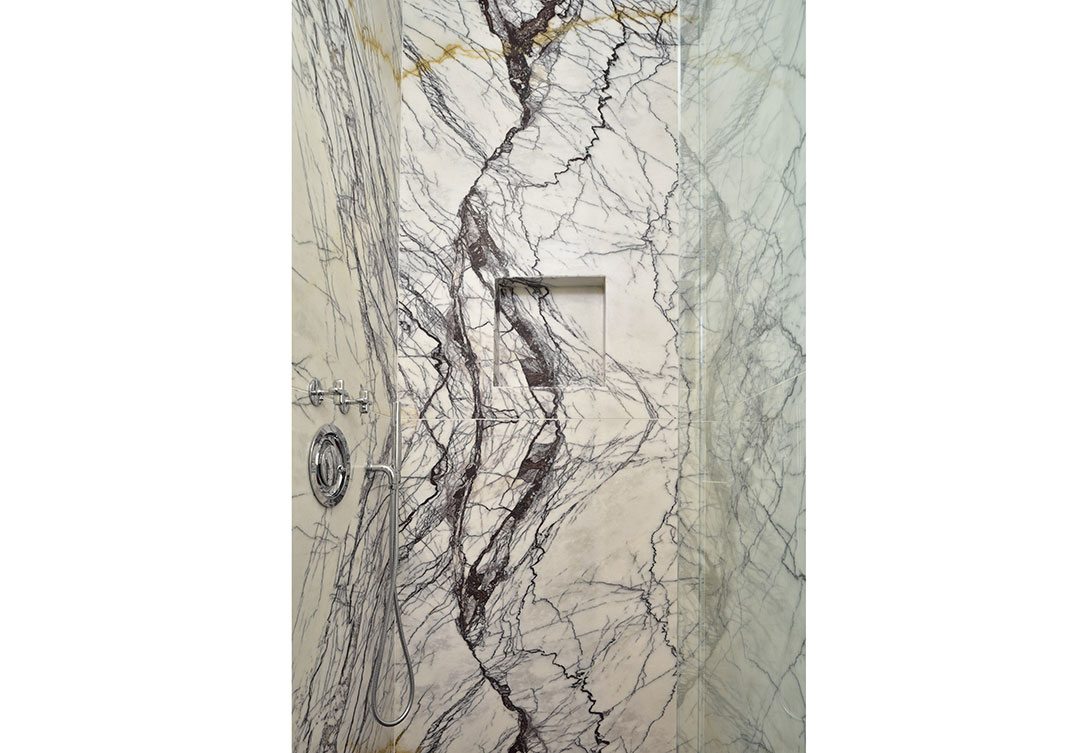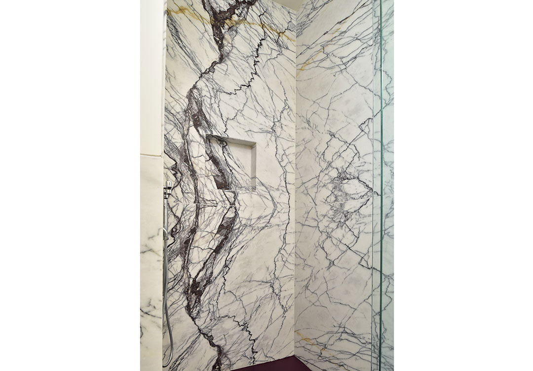 This was a special project featuring bookmatched Breccia Capraia & Lilac marbles, the bold book-matched veining creates a stunning impression. The shower design had a removable glass ceiling looking onto the sky above, being at the penthouse level of the building this shower is perhaps the best feature of the project, it was one of the best ways to showcase the natural beauty of the stone. Rugo team hand selected the best choice of marble for this project as desired by the homeowner and performed digital slab layouts to book-match the veins at the joints to create a grand marble appearance.