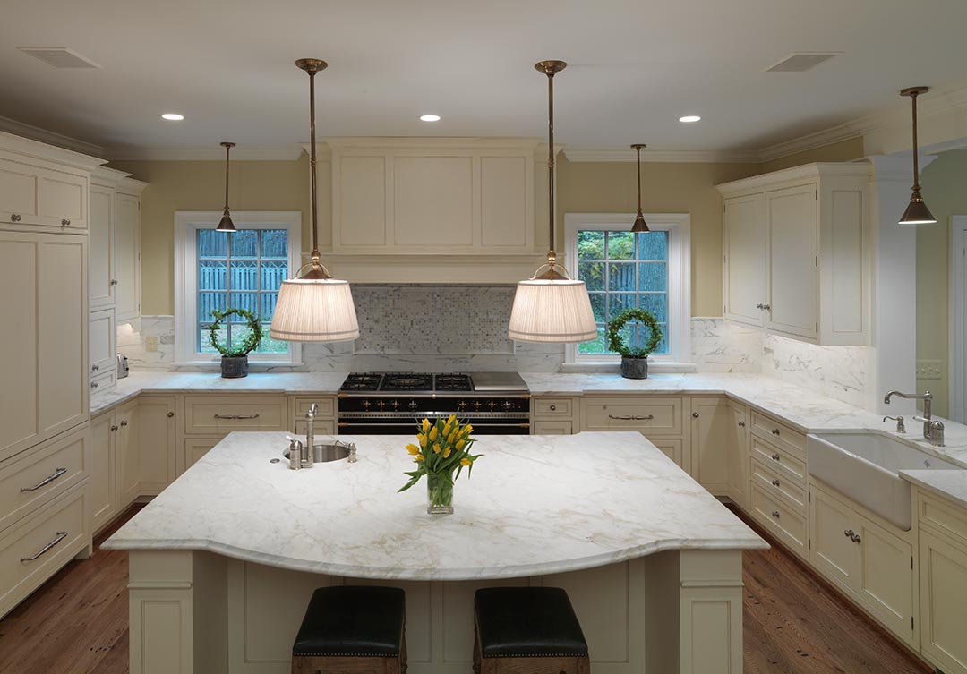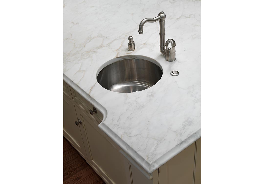 The homeowner expressed her desire for a white marble that is not too busy, with subtle veins and warm tones to compliment her light-colored cabinets and satin finish faucets. The Rugo team helped the client select Calacatta Sponda marble, which worked perfectly for this kitchen project. The large center island was waterjet cut to create a curved seating area. It featured an ogee design for the edge profile, contrasting with the simple edges on the perimeter countertops. The honed/matte finish applied to the marble further softened the look of the marble and blended well with the other design elements in the room.