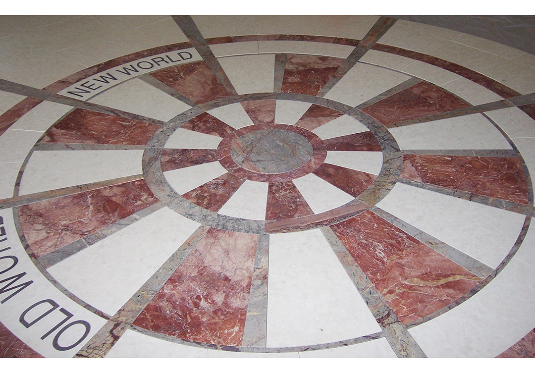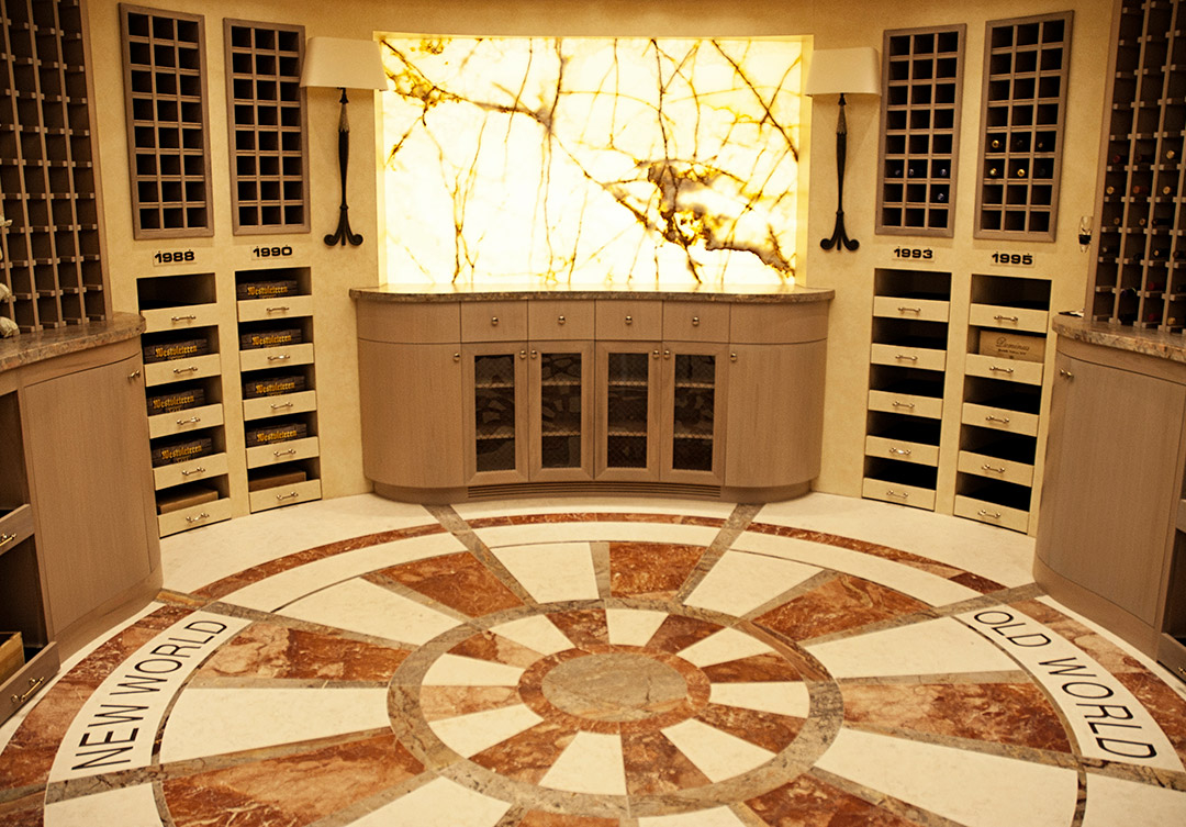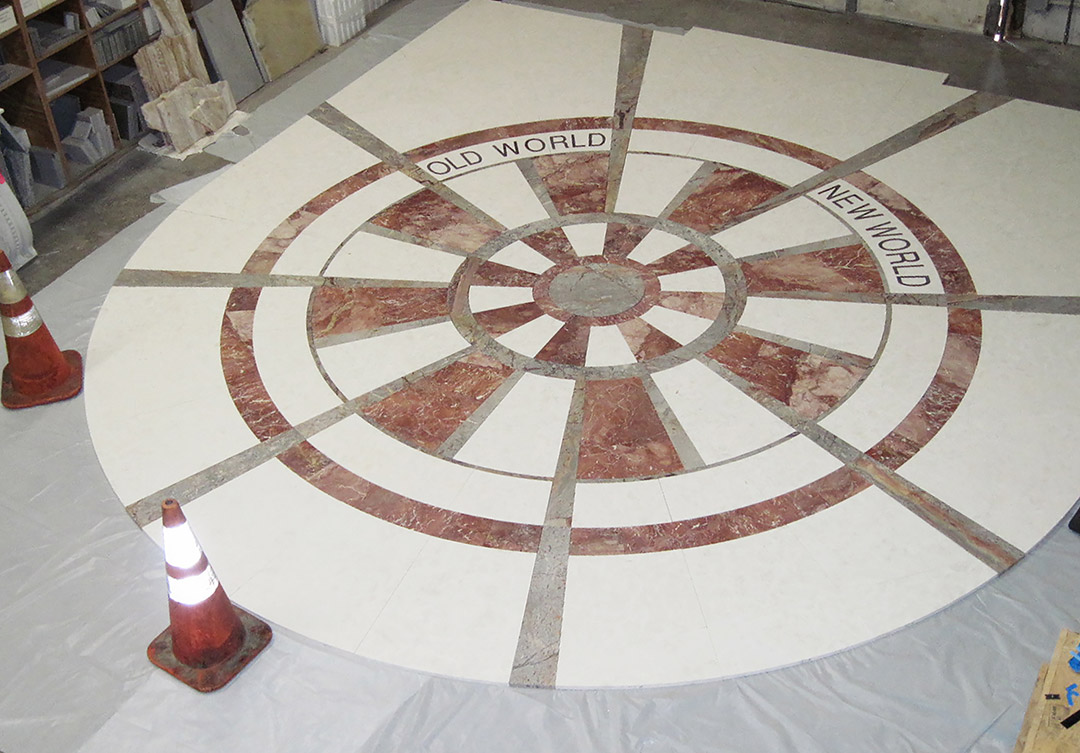 There is a Massive floor inlay, which took a tremendous amount of drafting and design to create a precise drawing and programming for the machining. A Waterjet machine cut the whole floor, and then the pieces were meticulously assembled by a team of four and dry laid in the Rugo shop. The countertops cut using the waterjet, follow the curved shape of the cabinet, which is precisely templated using a Pro-liner.