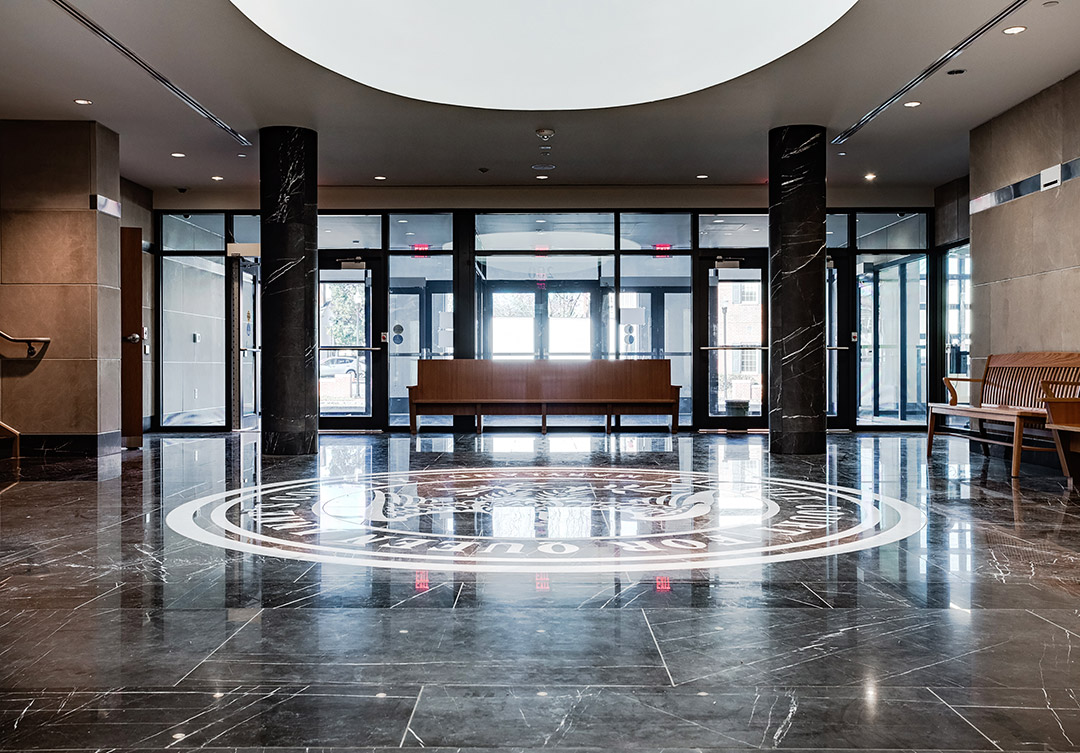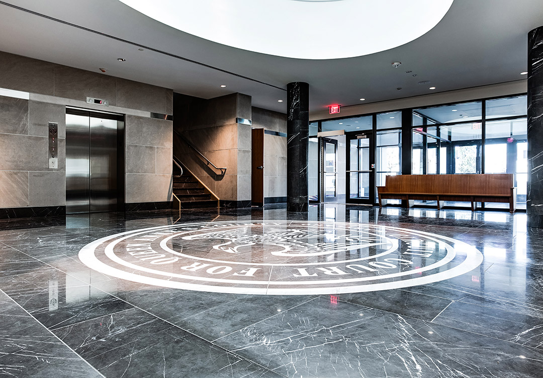 The size of the medallion was 15′ Dia. Each of the patterns/shapes was cut twice, once from each marble type, and then meticulously assembled and epoxied together at Rugo shop to form larger sections for the install. The most challenging part of the project was to continue to the paving joints from outside the medallion into the medallion’s inner circle with the “Eagle”; this called for huge, fragile sections of epoxied stone assembly.