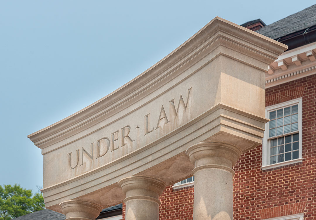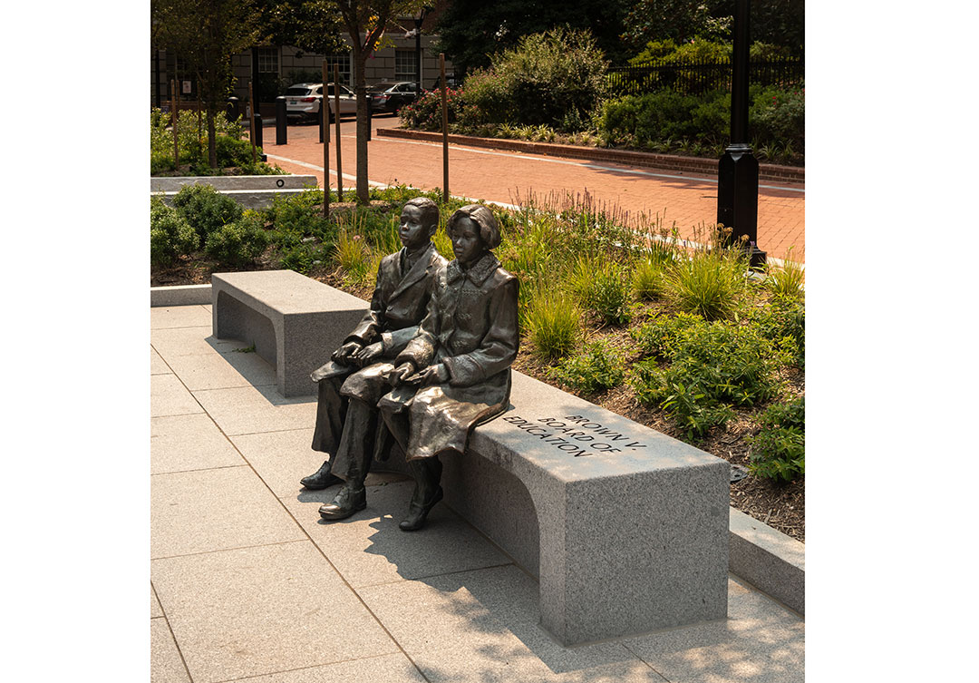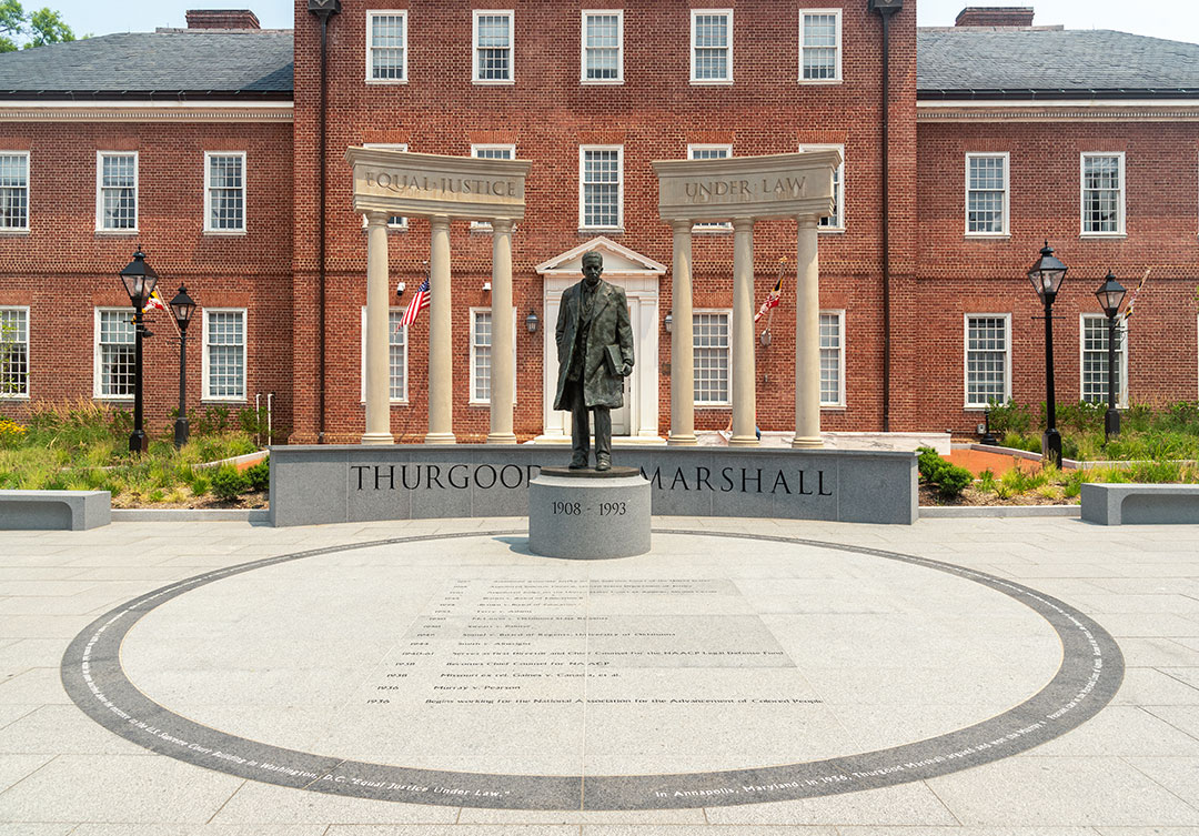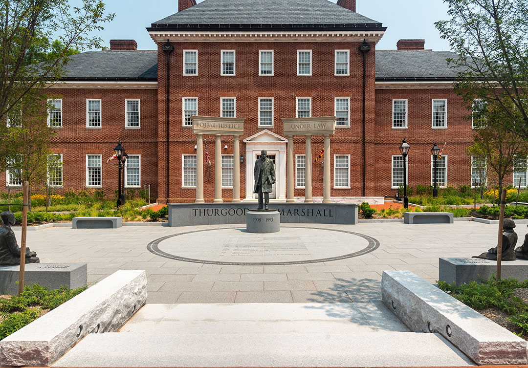 This prominent plaza is a gathering point for legislators and attorneys working in the state Capital. The focal point of the plaza is a salvaged and restored limestone colonnade element from a previous design and a bronze statue of the late US Supreme Court Justice, Mr. Thurgood Marshall.