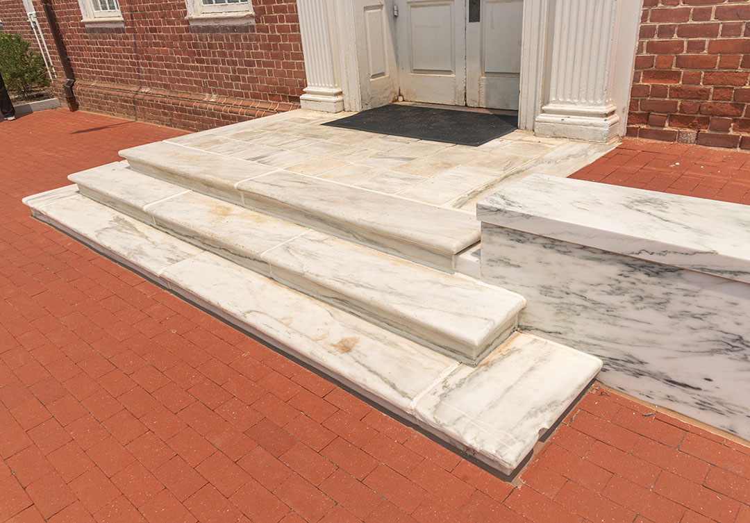 We carefully dismantled the Indiana limestone colonnade and pedestal and transported them to our marble shop for restoration. The stone was heavily soiled and required nearly two months of work, including cleaning, patching, and dutchman repairs.