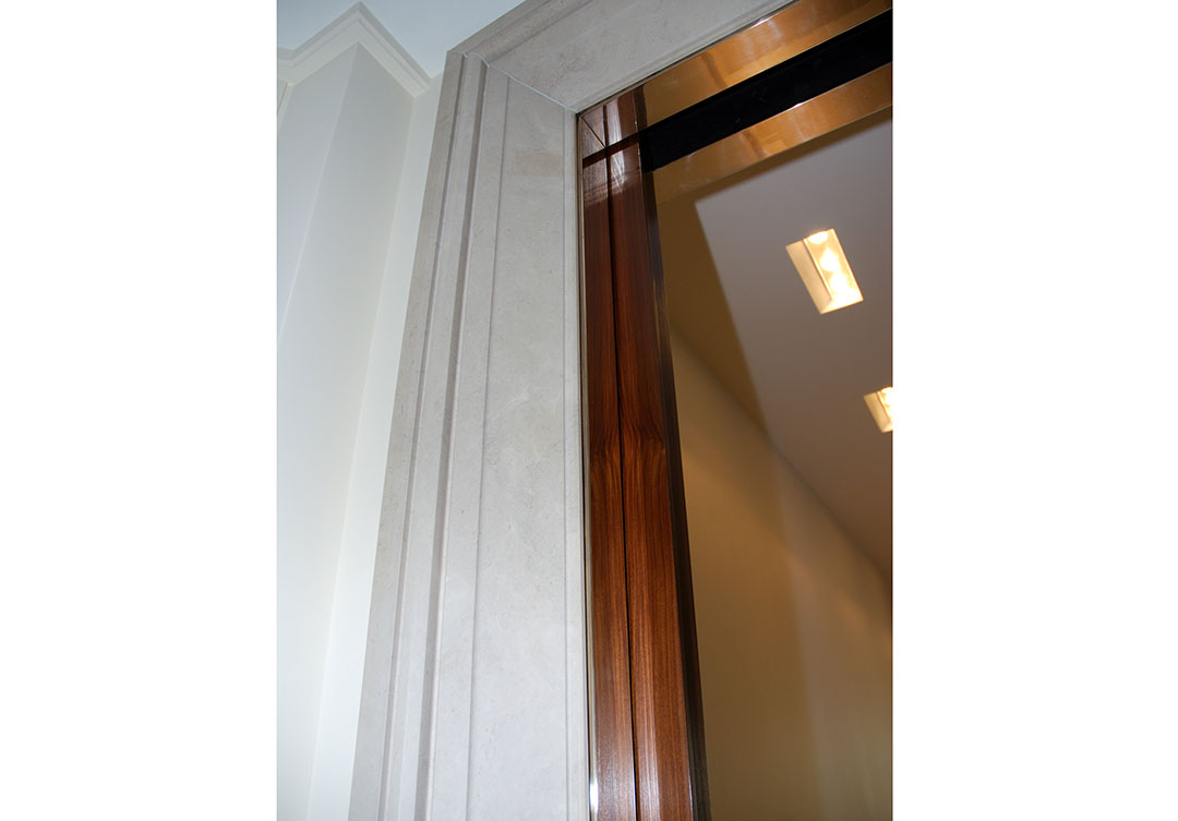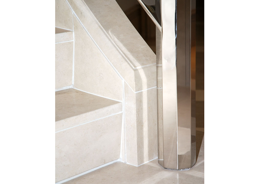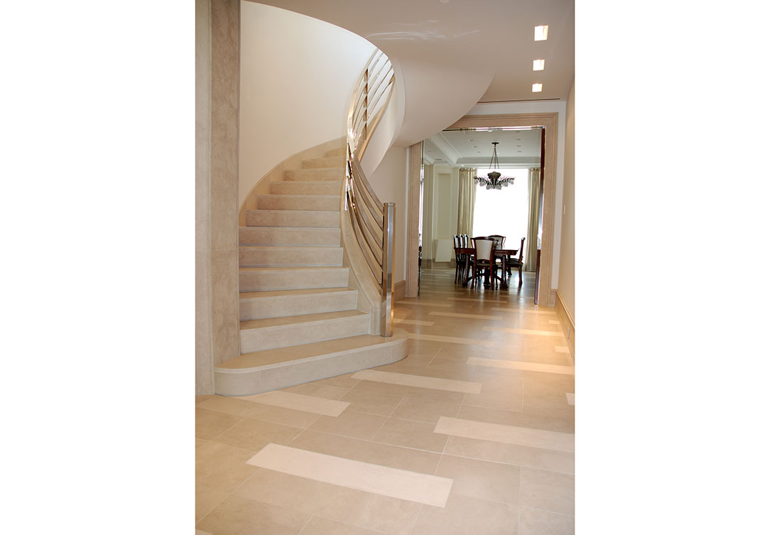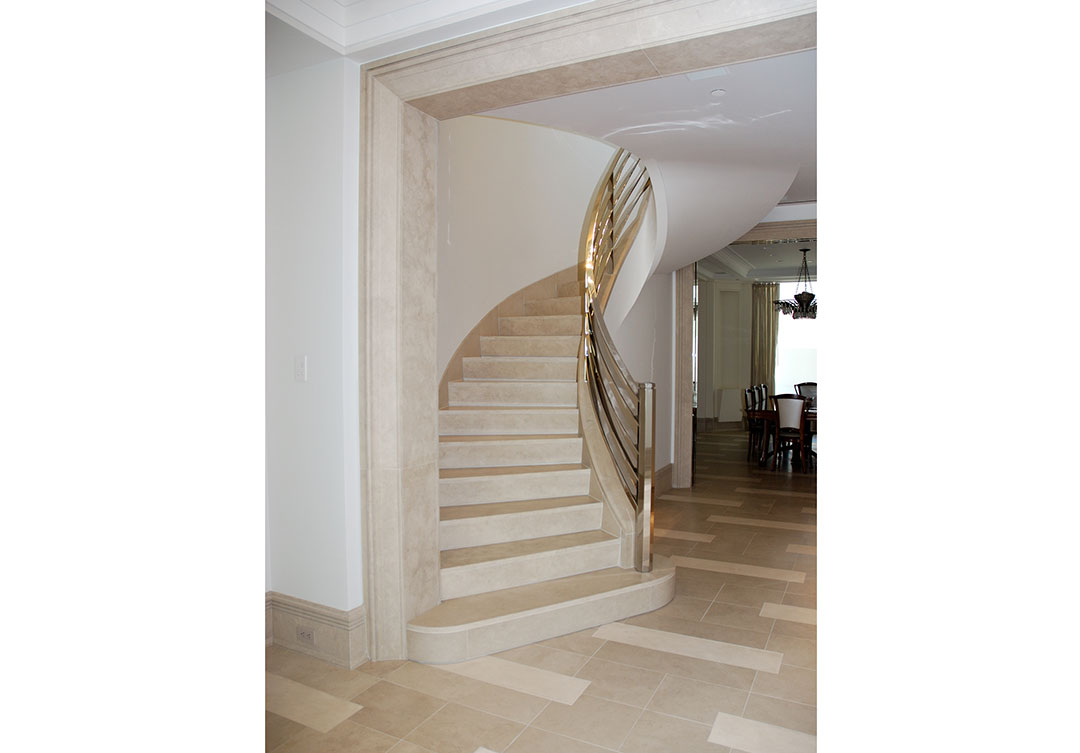 The entire home is paved in 2cm limestone, marble, and onyx. The base, door surrounds, and portals are cased with custom profiled Gohare beige limestone moldings. There are no wood baseboards or wood door cases––the entire casement is detailed in custom profiled limestone and marble. The home also has an internal elliptical spiral stair that features stone treads and risers, a ramp, and twisted stone stringer and rail caps.