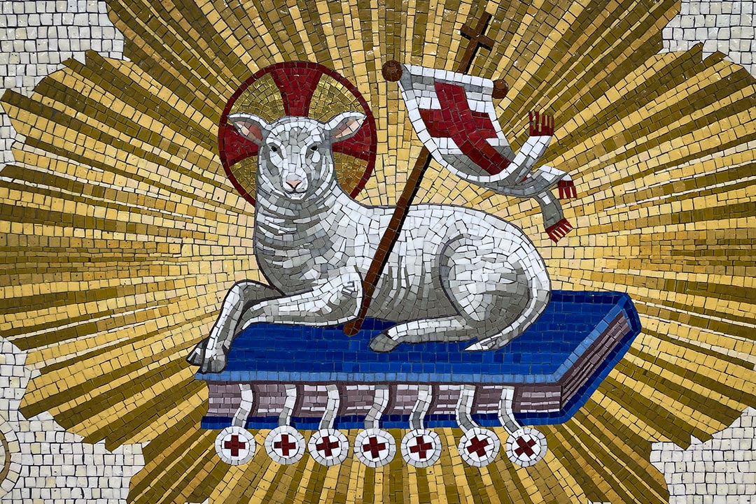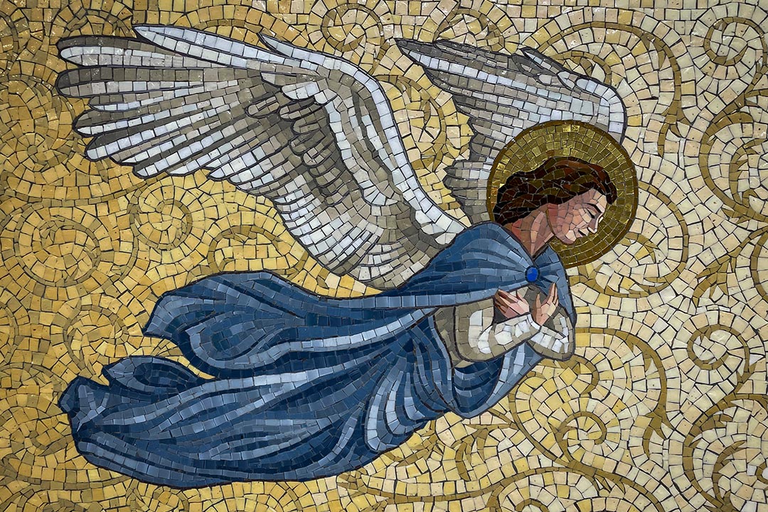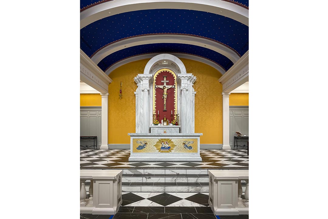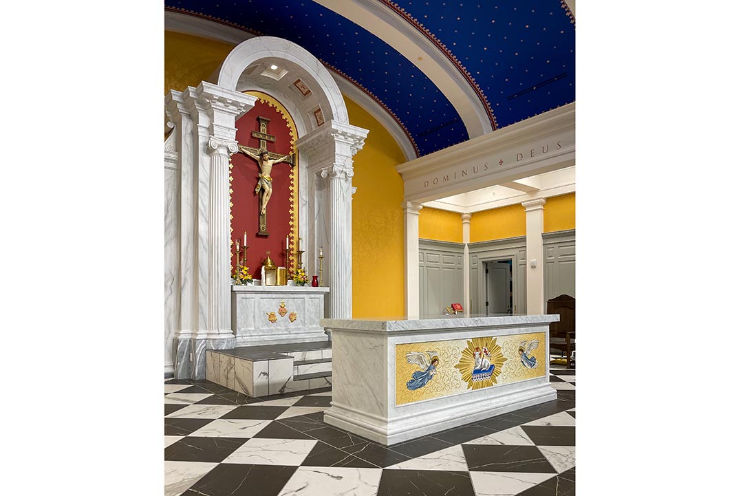 The stunning St. Monica Altar of Sacrifice is an example of our diverse liturgical crafts skills, combining the fabrication of ornate Bianco Carrara marble and Venetian glass mosaic. Depicted in the inlaid Venetian glass mosaic are the sacrificial lamb and adoring angels. This mosaic is rather complex as it requires a detailed tapestry of subtle vines placed in the background.