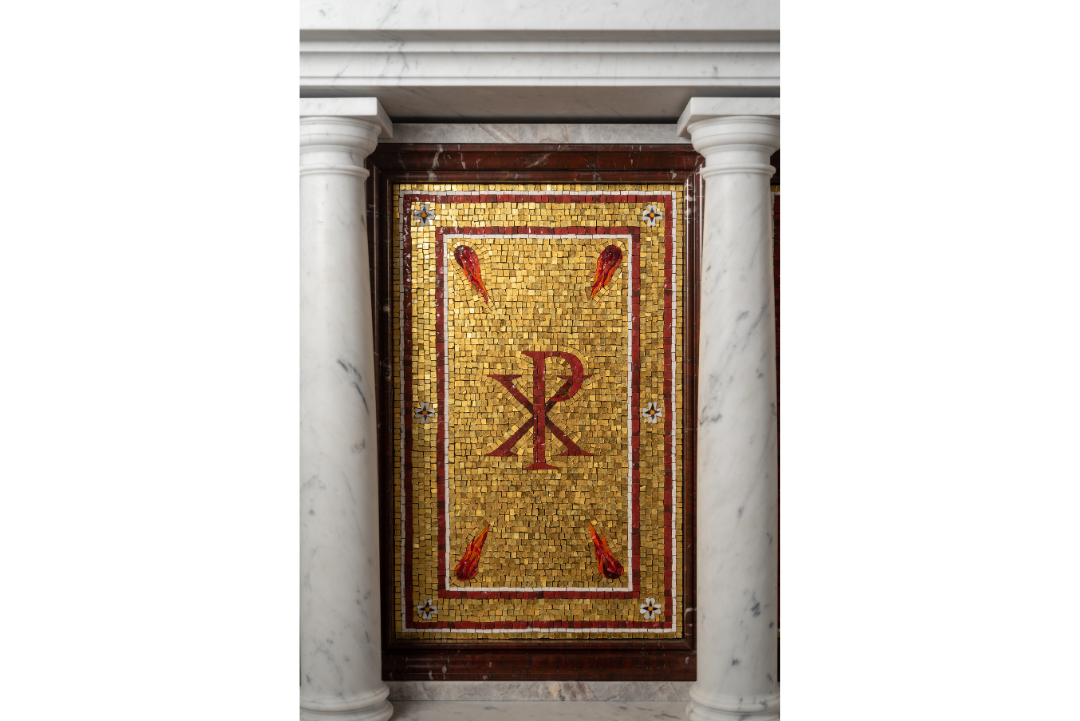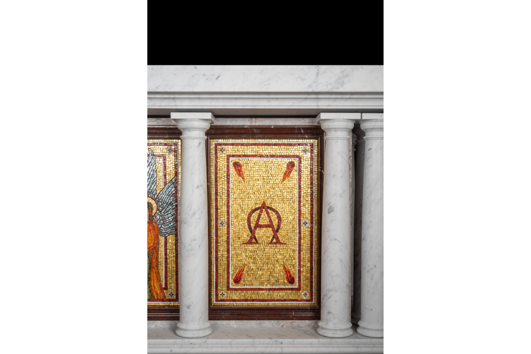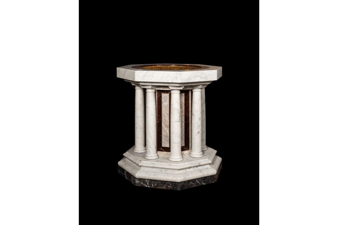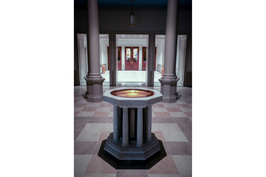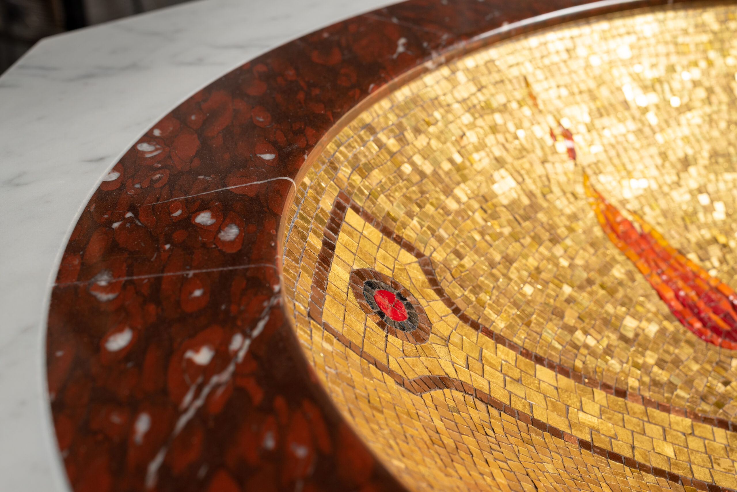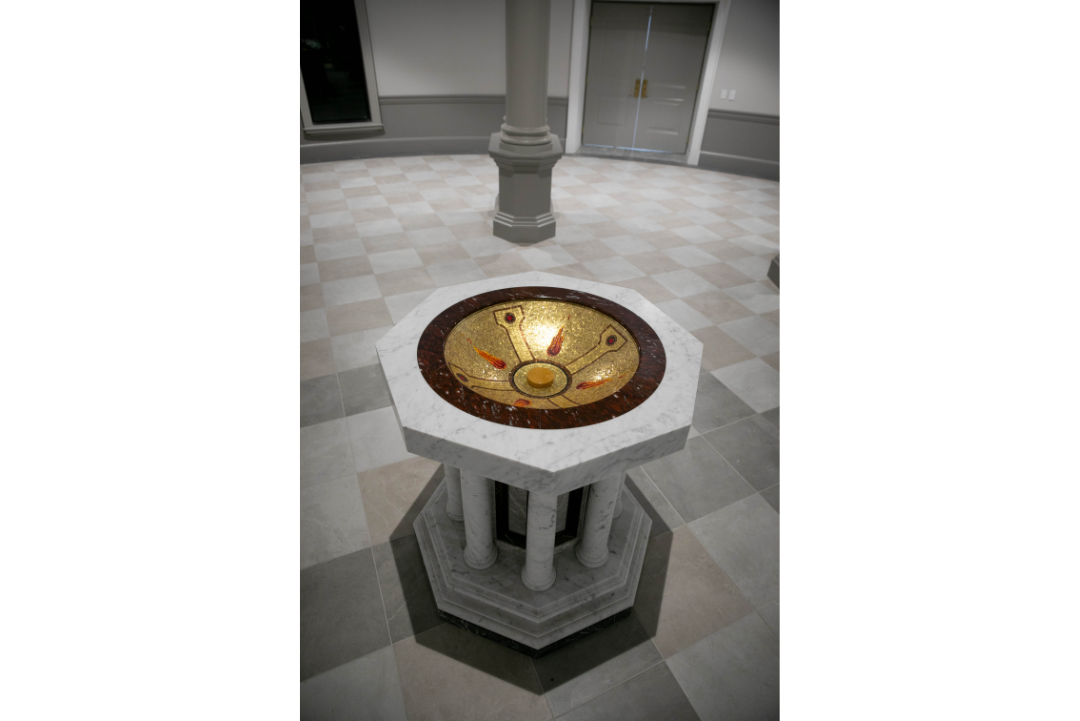 Marble Baptismal Font: Designed with free-standing columns in Bianco Carrara and red marble inlays, the font resonates with symbolic significance, representing the Sacred Heart. The contrasting cool tones of grey, darker grey, and green marble create a lush and unique design that stands out from traditional baptismal fonts. The font basin is inlaid with Venetian glass mosaic.