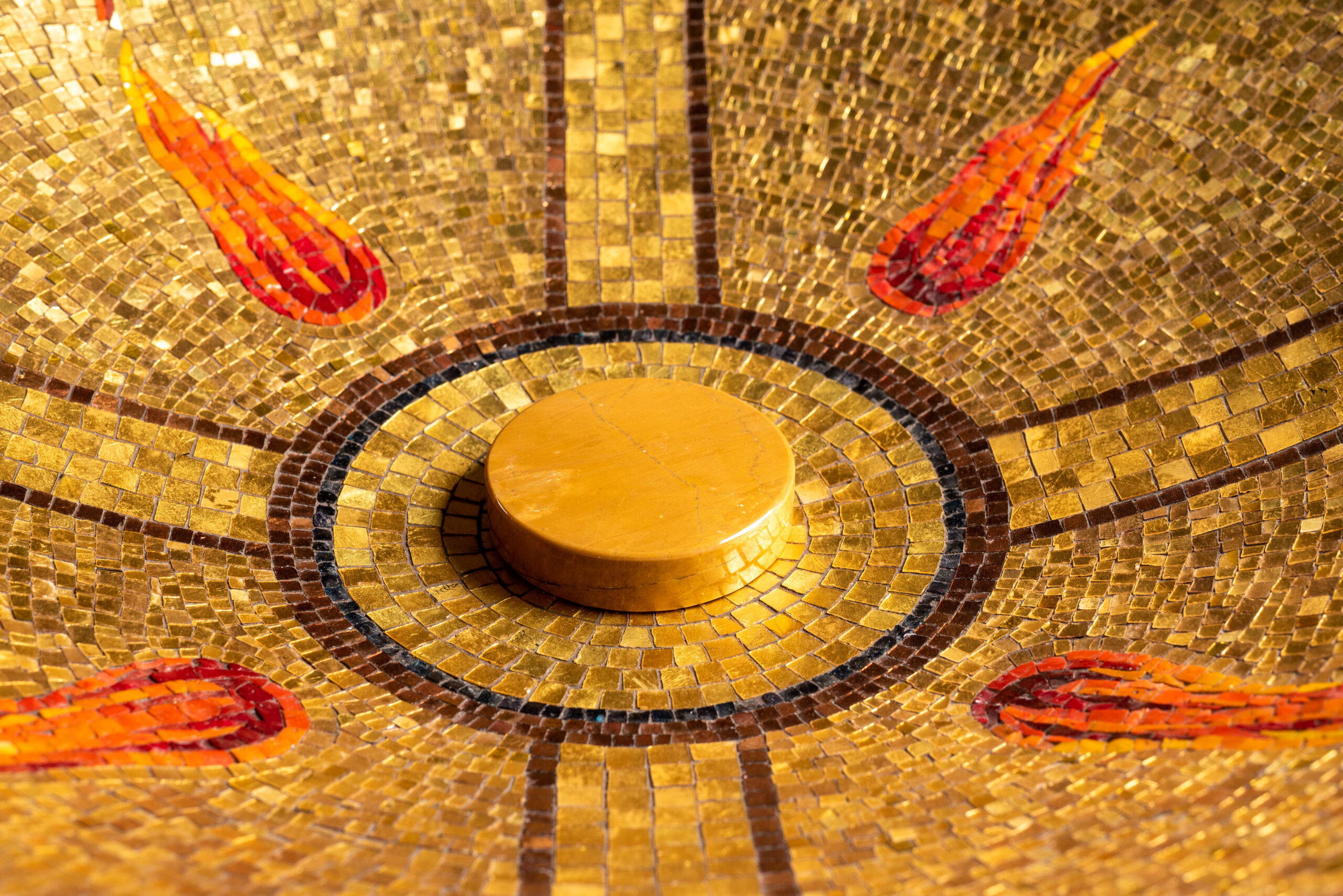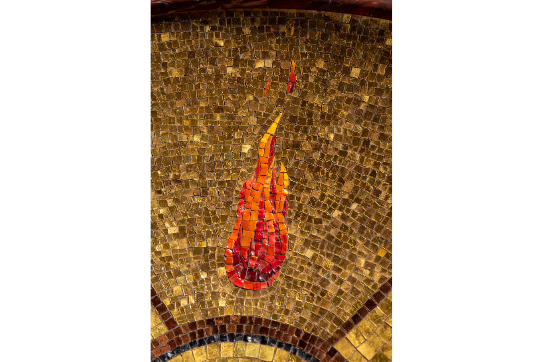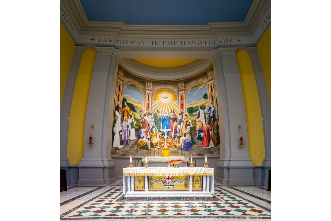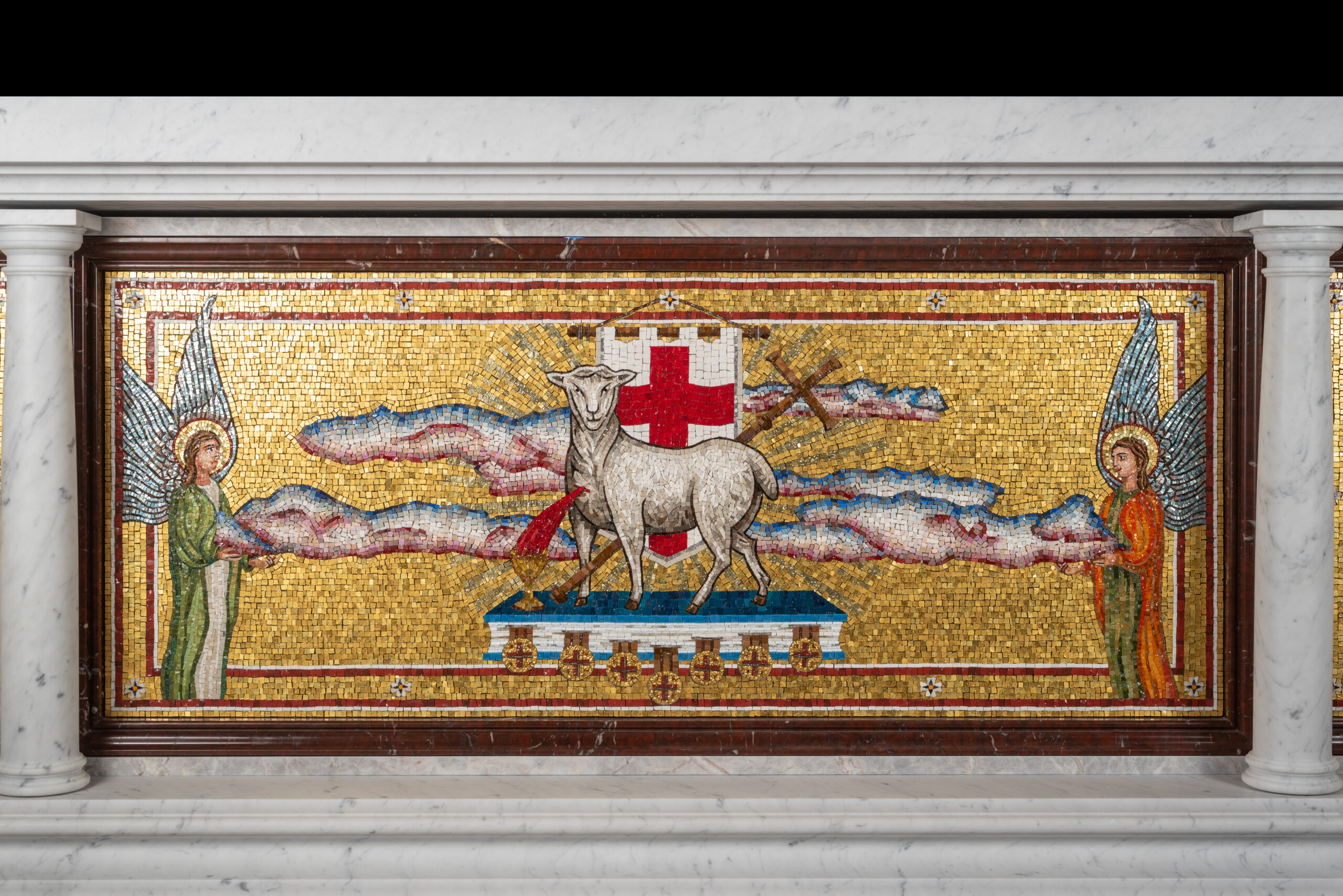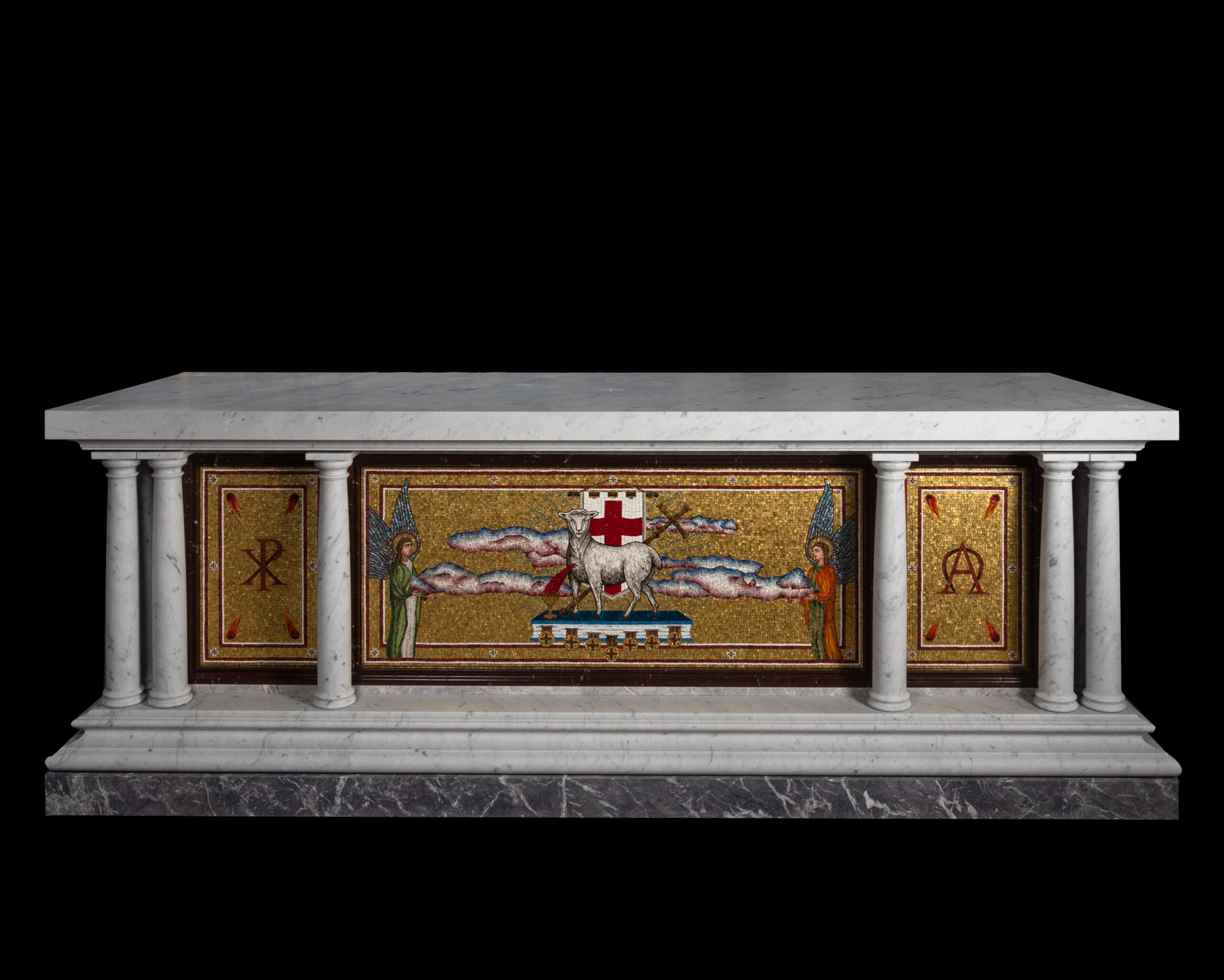 Marble Baptismal Font: Designed with free-standing columns in Bianco Carrara and red marble inlays, the font resonates with symbolic significance, representing the Sacred Heart. The contrasting cool tones of grey, darker grey, and green marble create a lush and unique design that stands out from traditional baptismal fonts. The font basin is inlaid with Venetian glass mosaic.