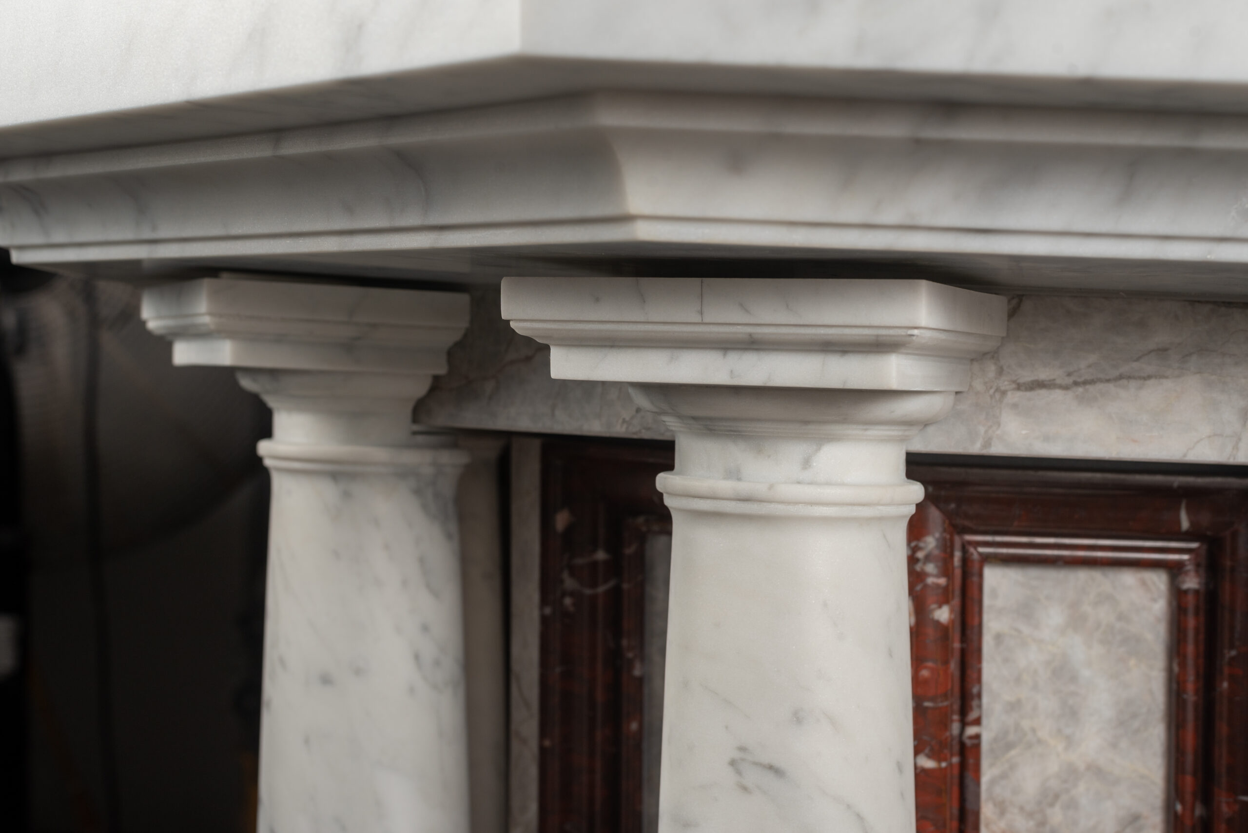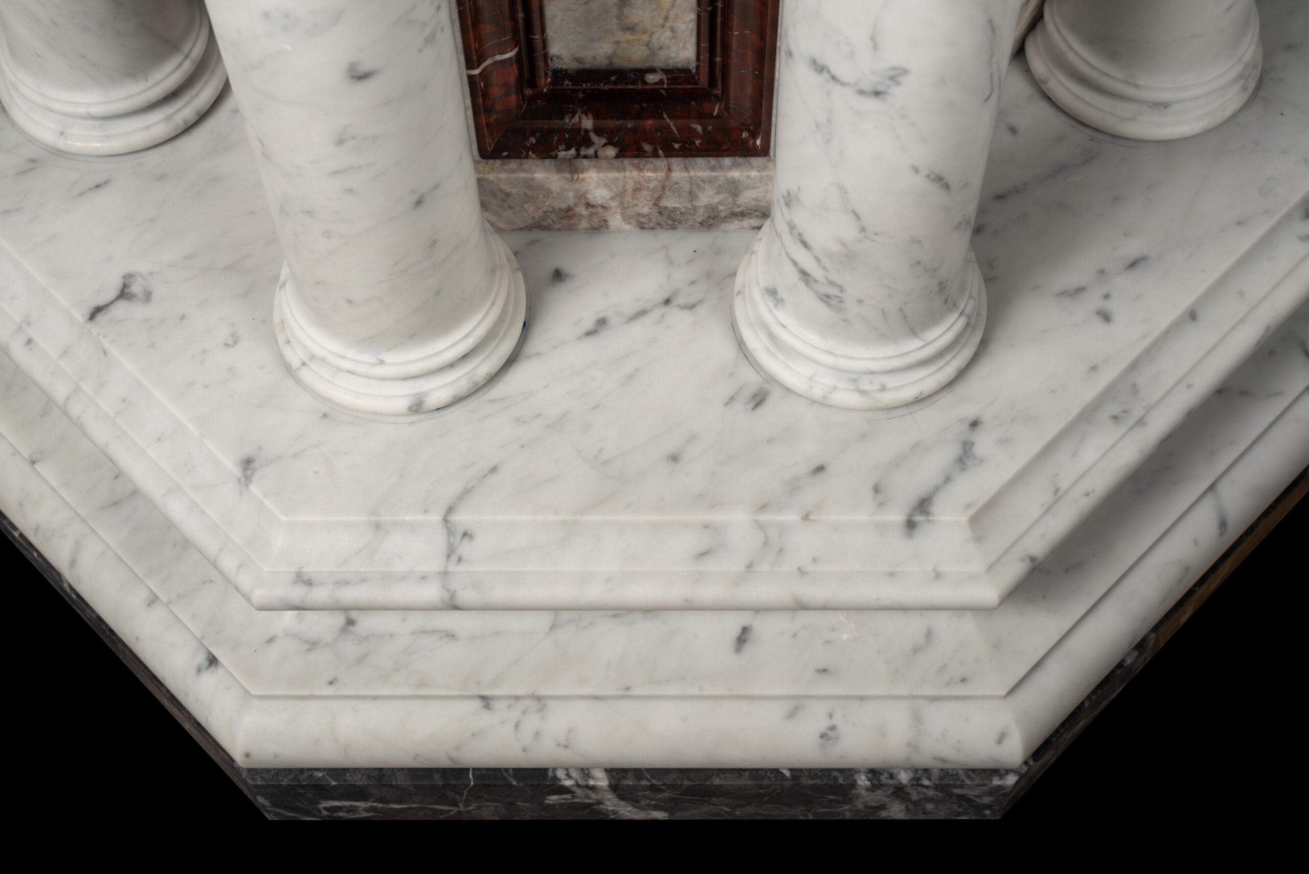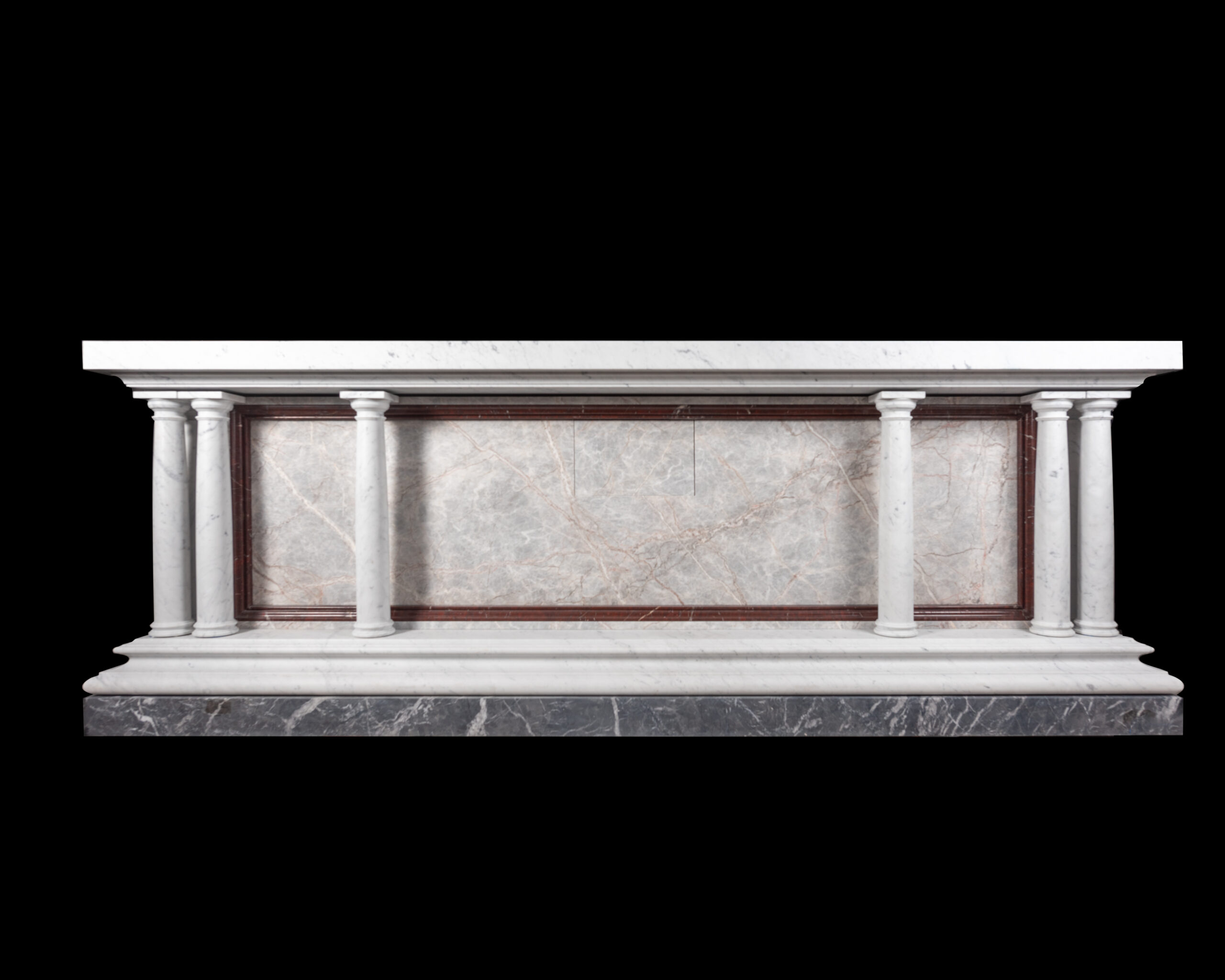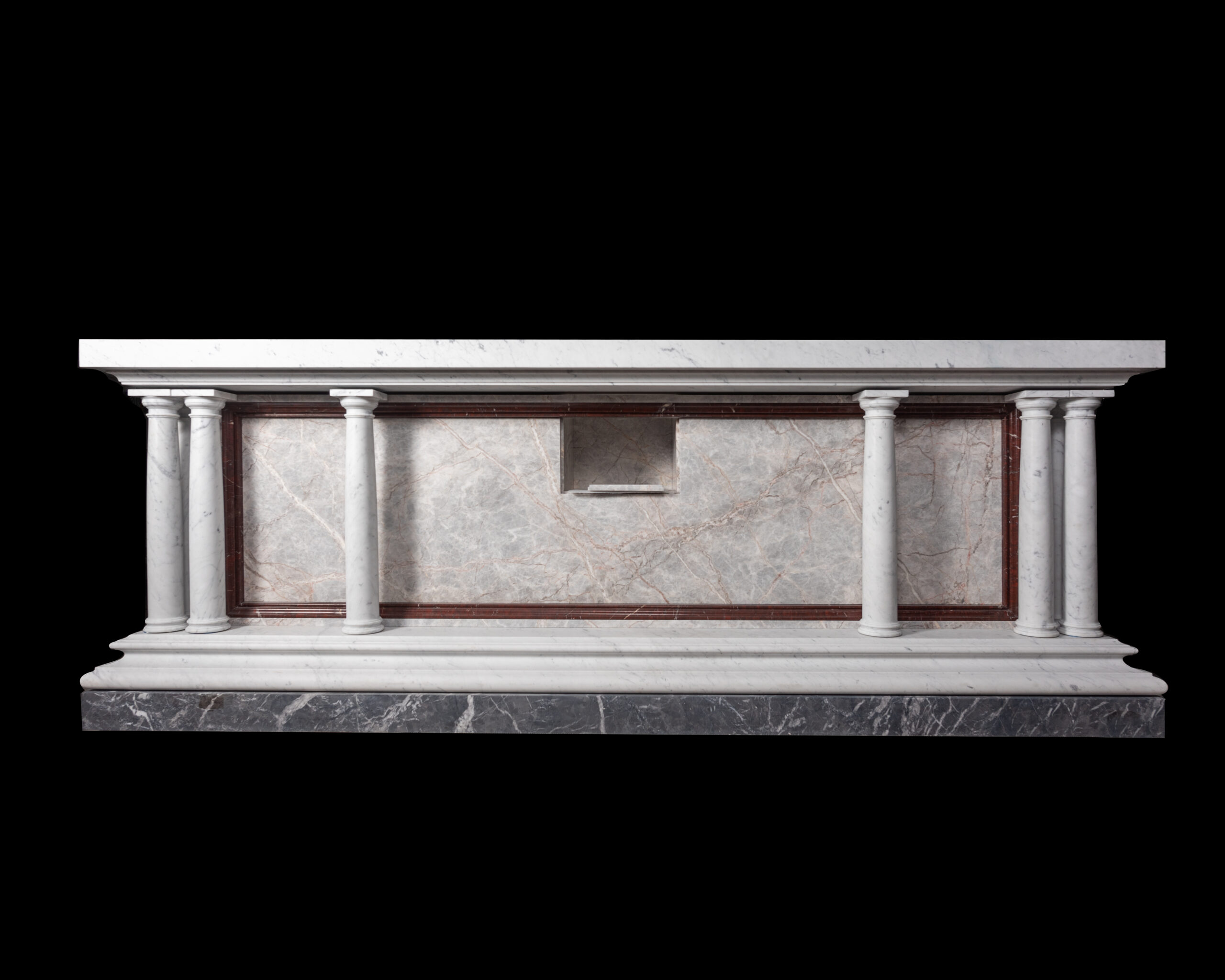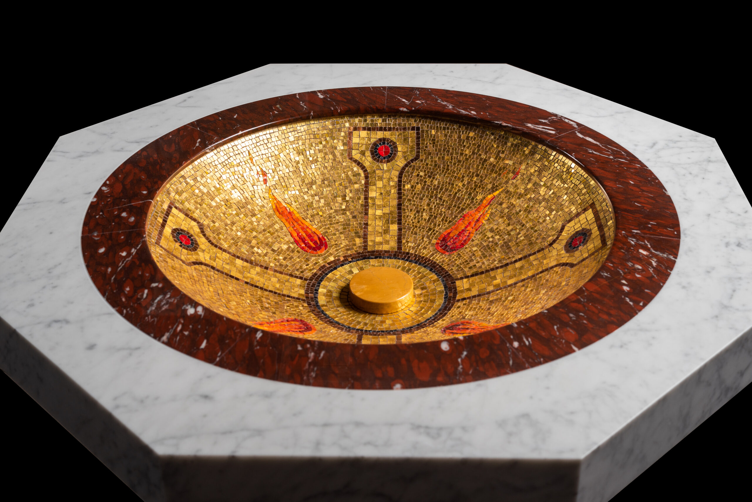 Marble Baptismal Font: Designed with free-standing columns in Bianco Carrara and red marble inlays, the font resonates with symbolic significance, representing the Sacred Heart. The contrasting cool tones of grey, darker grey, and green marble create a lush and unique design that stands out from traditional baptismal fonts. The font basin is inlaid with Venetian glass mosaic.