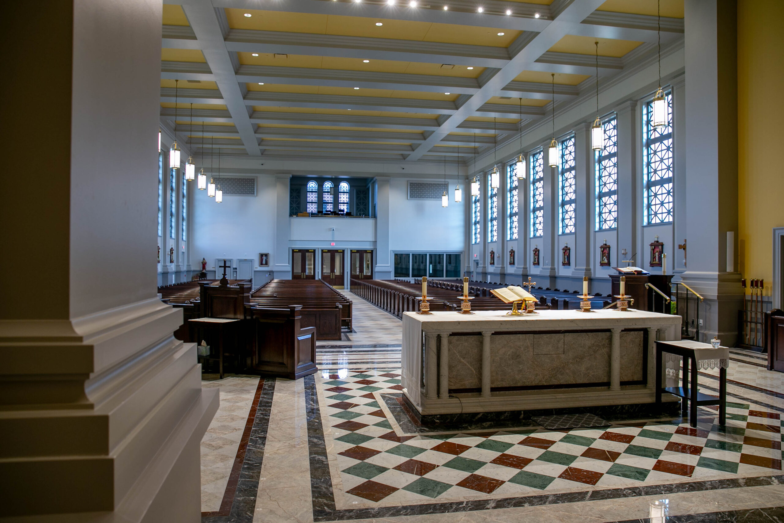 Sanctuary Floor: The sanctuary floor is a striking checkerboard pattern composed of five different colored marble pavers. This intricate design delivers a visual feast, elevating the aesthetic ambiance of the sacred space.