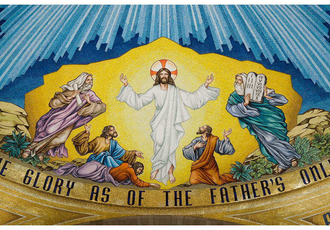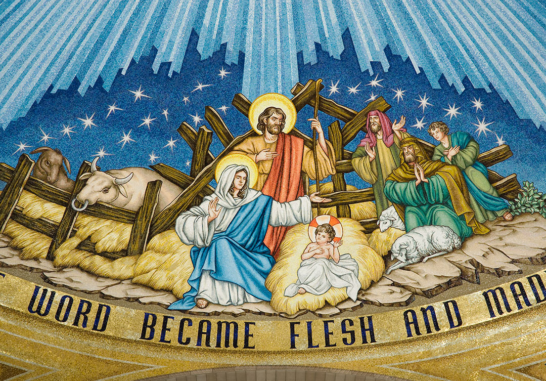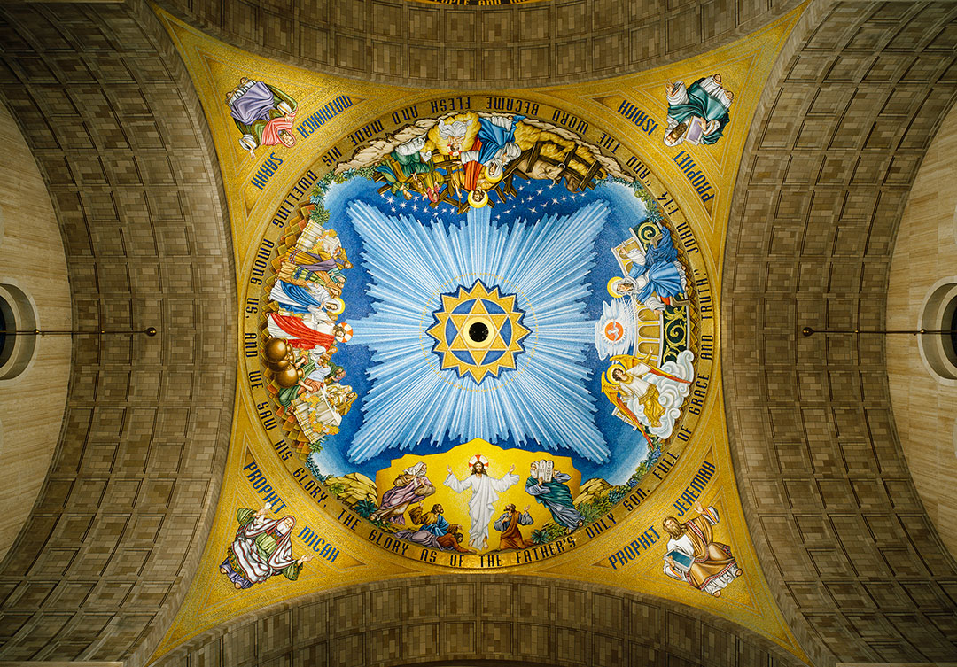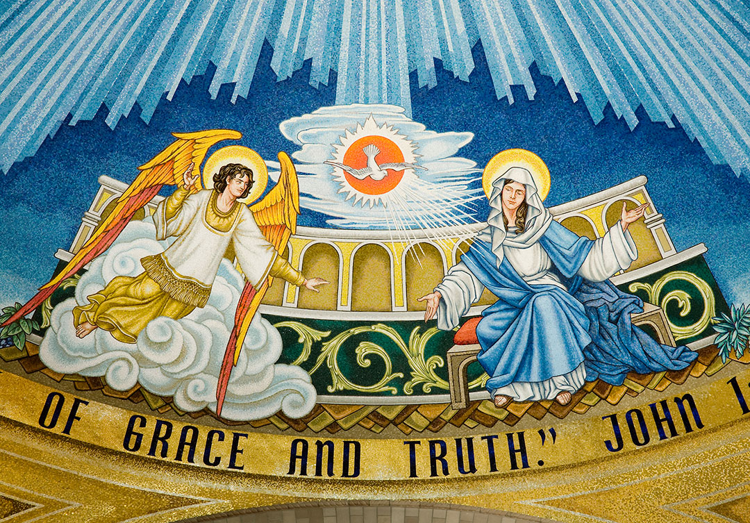The dome itself is an extraordinary representation of the Incarnation of Jesus Christ. The mosaic was produced in northern Italy and consisted of a 12-foot tall figures and over 800,000 tesserae tiles. Over 100 colors of tesserae, as well as 24-carat gold leaf tiles, were used to complete the dome, which measures 54 feet across. Each section was completed in panels and represented different significant points and people in the life of Jesus Christ. The inner-circle illustrates the incarnation of Jesus. The Annunciation, the Nativity, the Wedding Feast at Cana, and the Transfiguration.