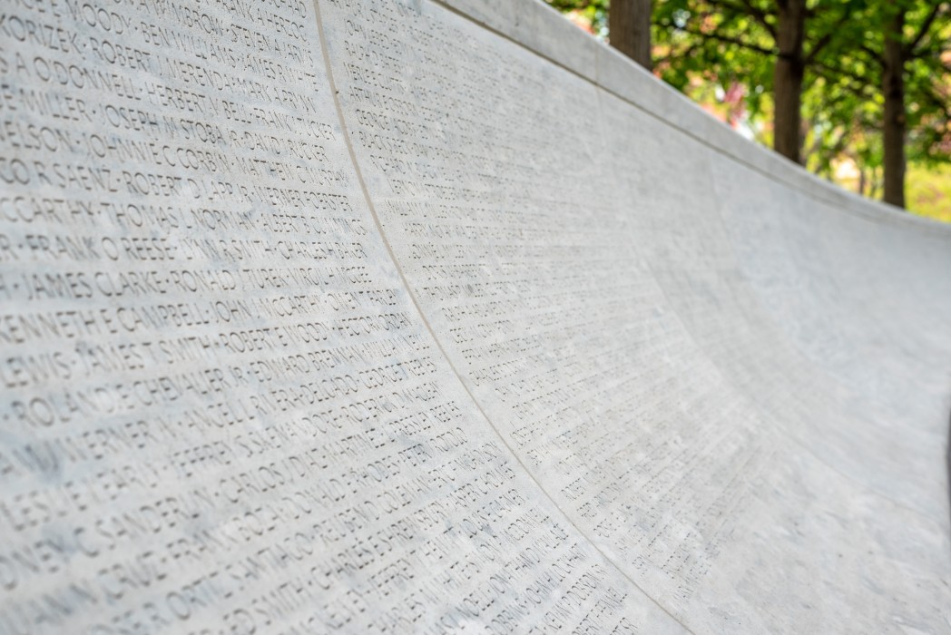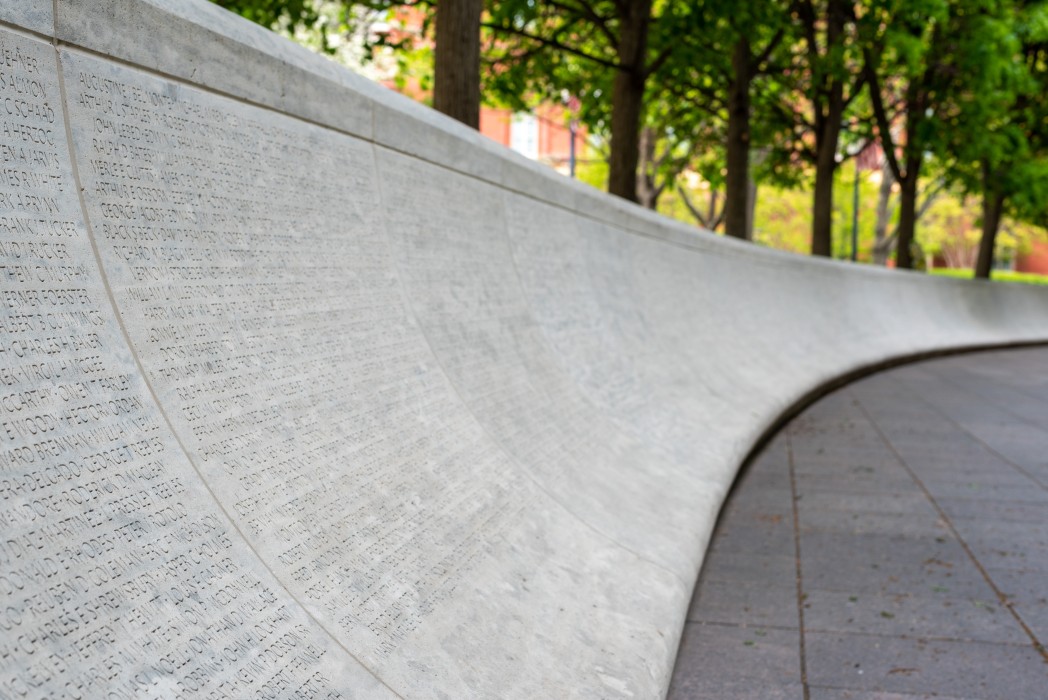 Since completion of the expansion, Rugo Stone has continued engraving new names annually, adding 1,850 names by May 2025. The engraving scope presented three major challenges: matching the style of the original inscriptions, executing precise lettering across curved and radial walls, and maintaining safety while the site remained open to the public. Through extensive mockups and testing, Rugo Stone refined its sandblasting techniques, using specialized acrylic stencils that adhered securely without staining or damaging the limestone.