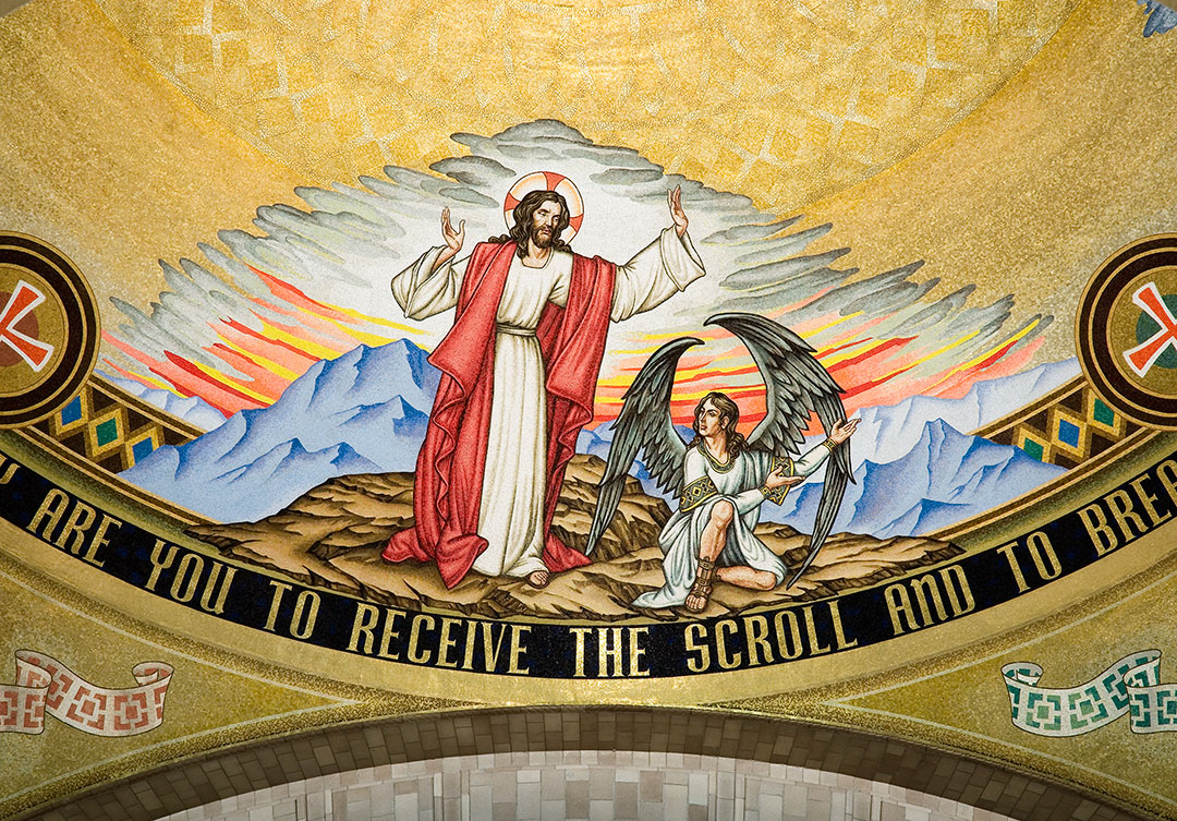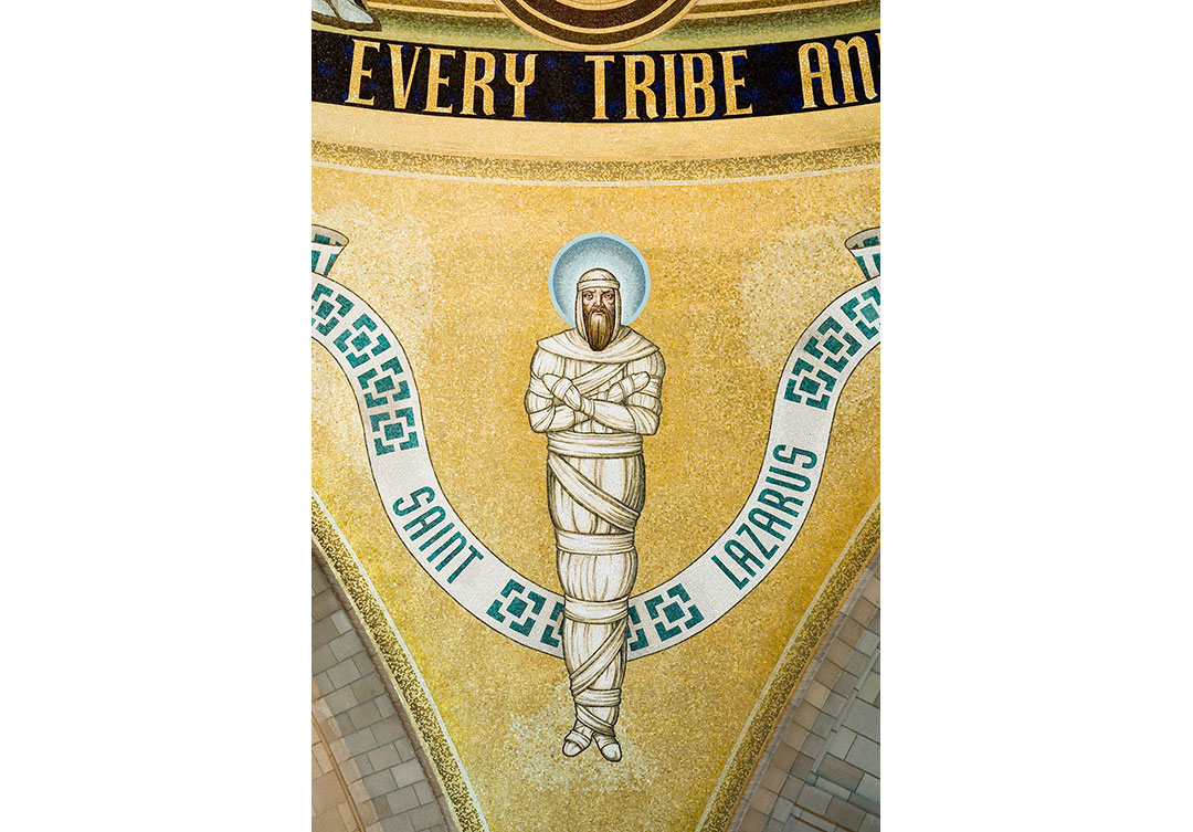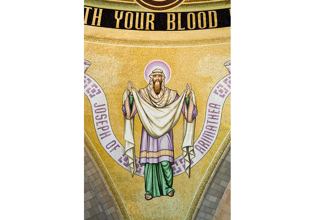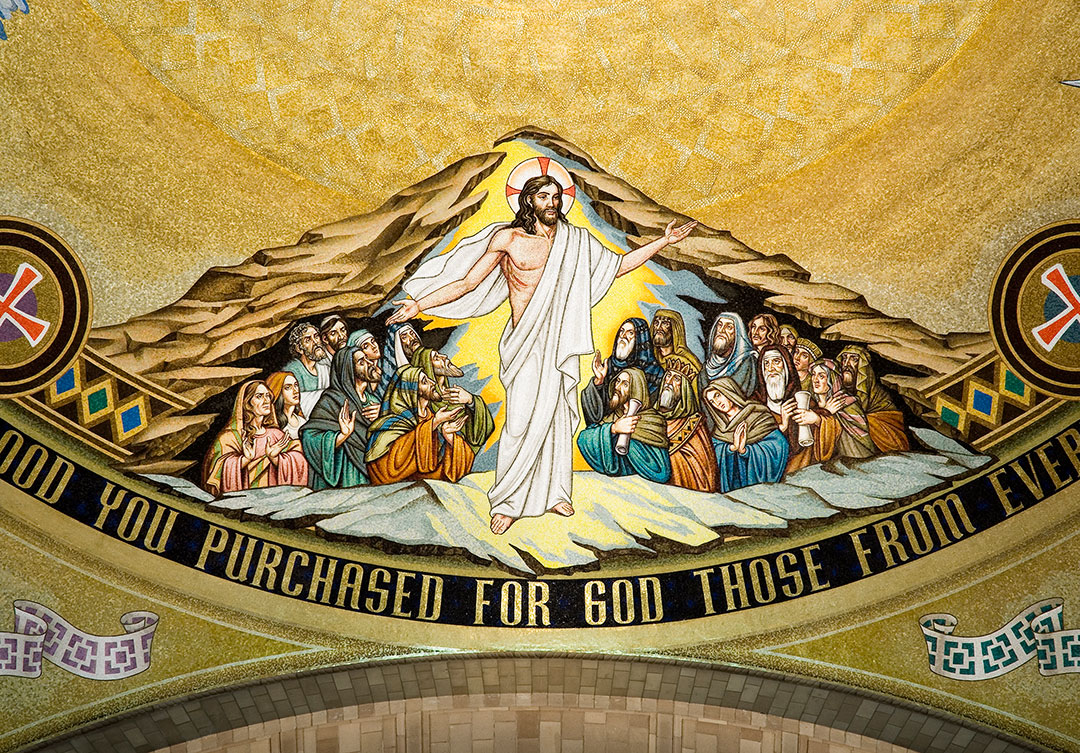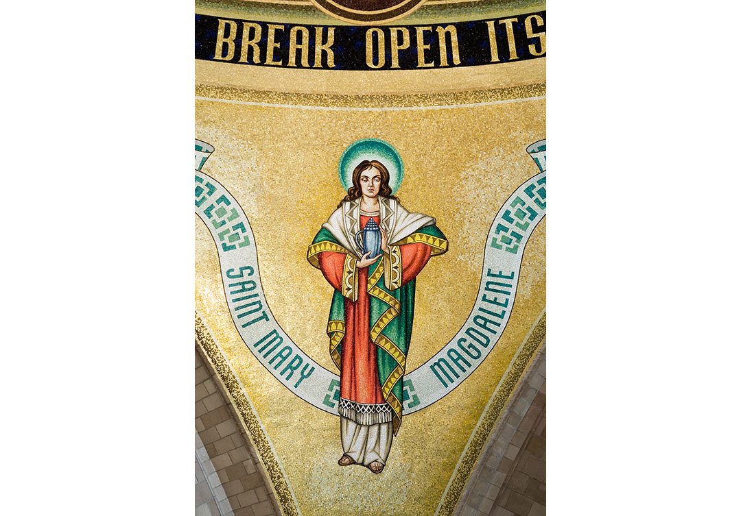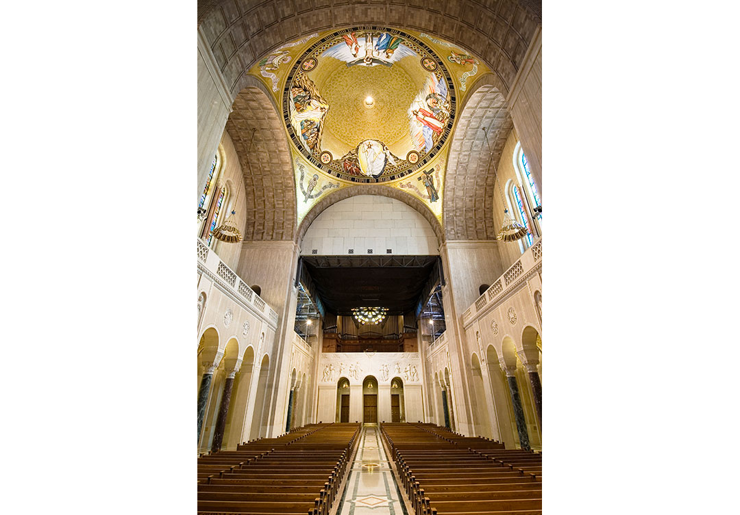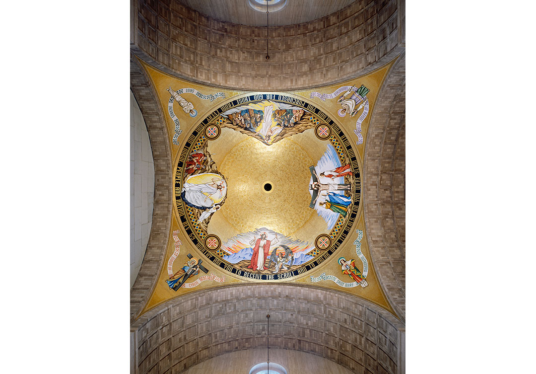 The dome itself is an extraordinary representation of the Redemption of Jesus Christ. The mosaic consists of 12-foot figures and over 800,000 glass tesserae tiles. Over 100 colors of tesserae, as well as gold leaf tiles, were used to complete the dome, which measures 86 feet in length.