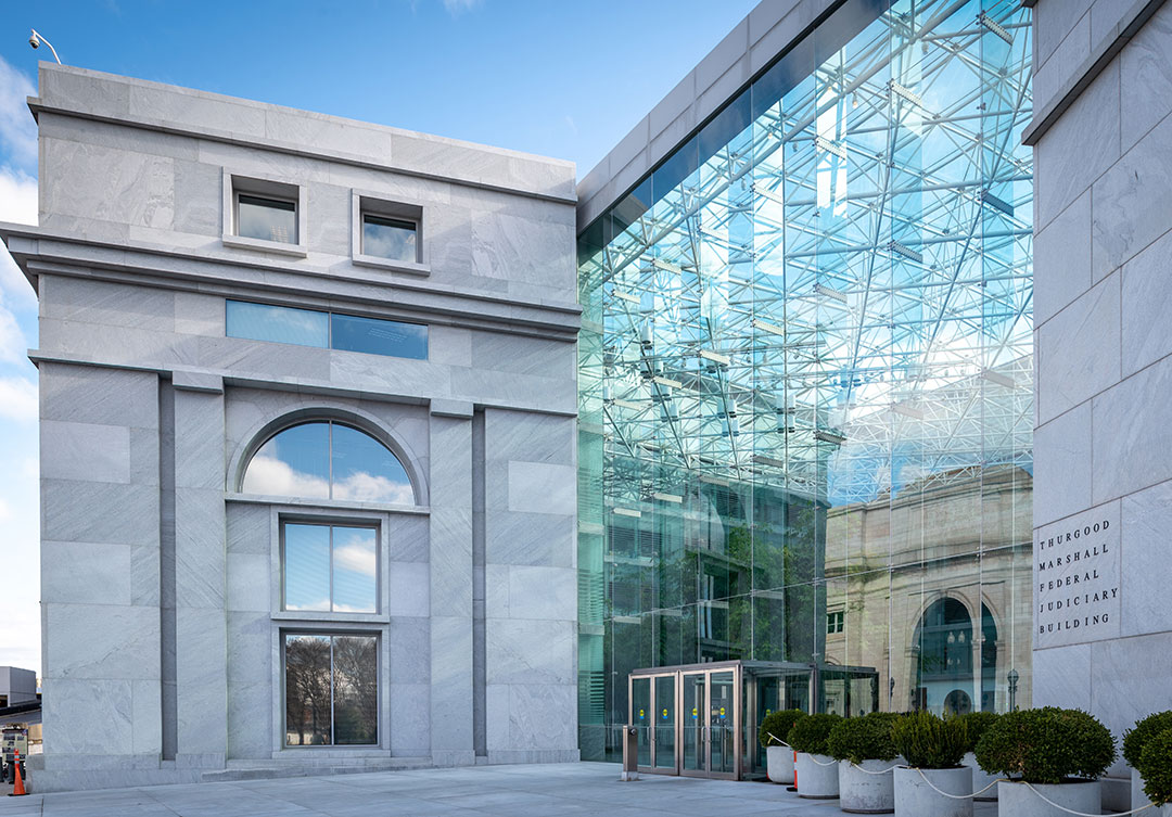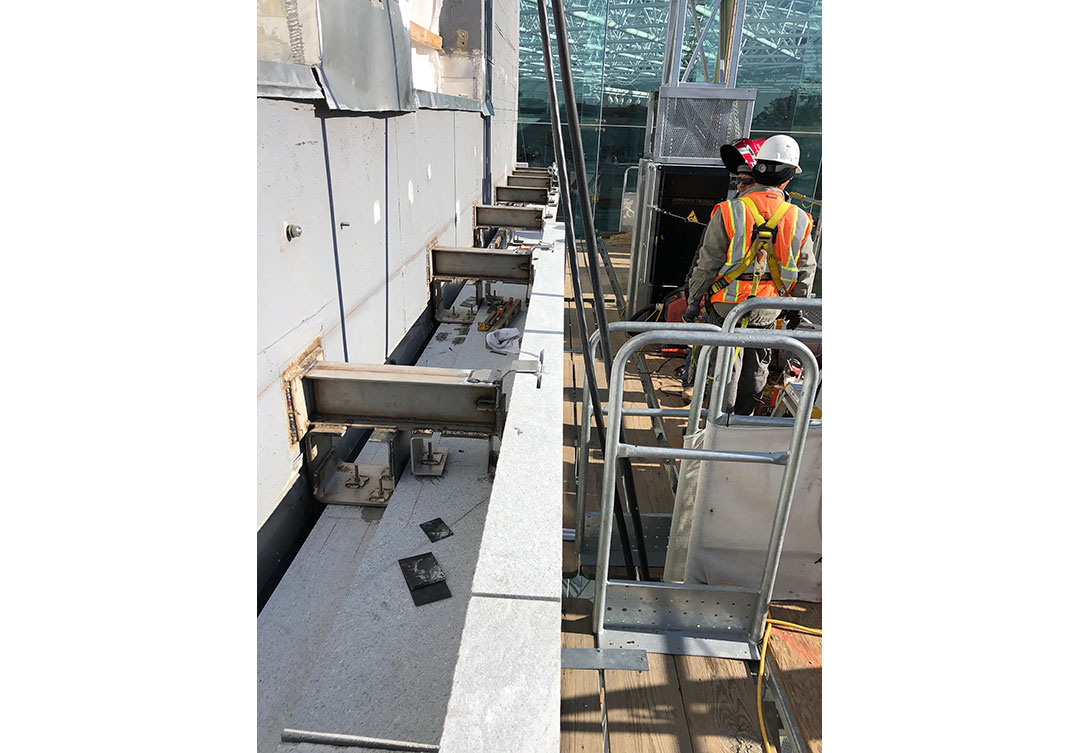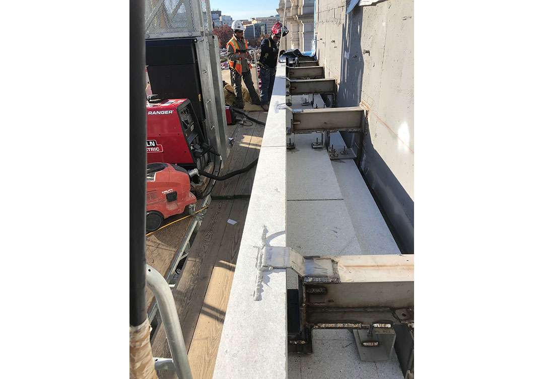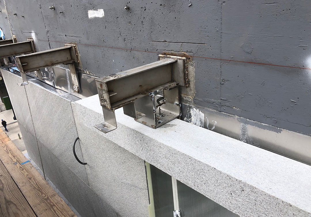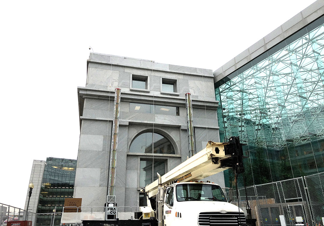 Rugo performed the entire dismantle and salvage of the old stone, measuring and cataloging the size of every piece. We field measured the whole facade and every piece to create new stone shop drawings with identical piece sizes. Rugo performed extensive stone and anchorage physical property testing for all the new granite. The new stone is supported by a new and improved anchorage support system, which ensures the longevity of the assembly.