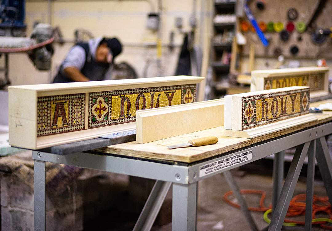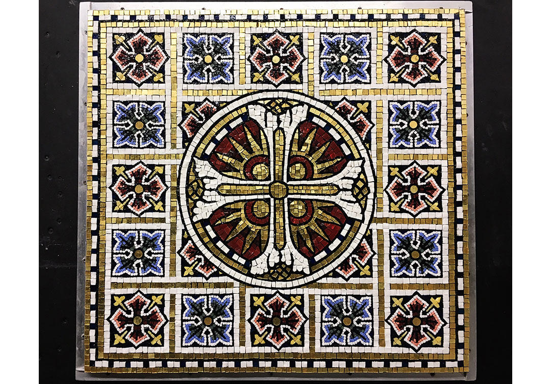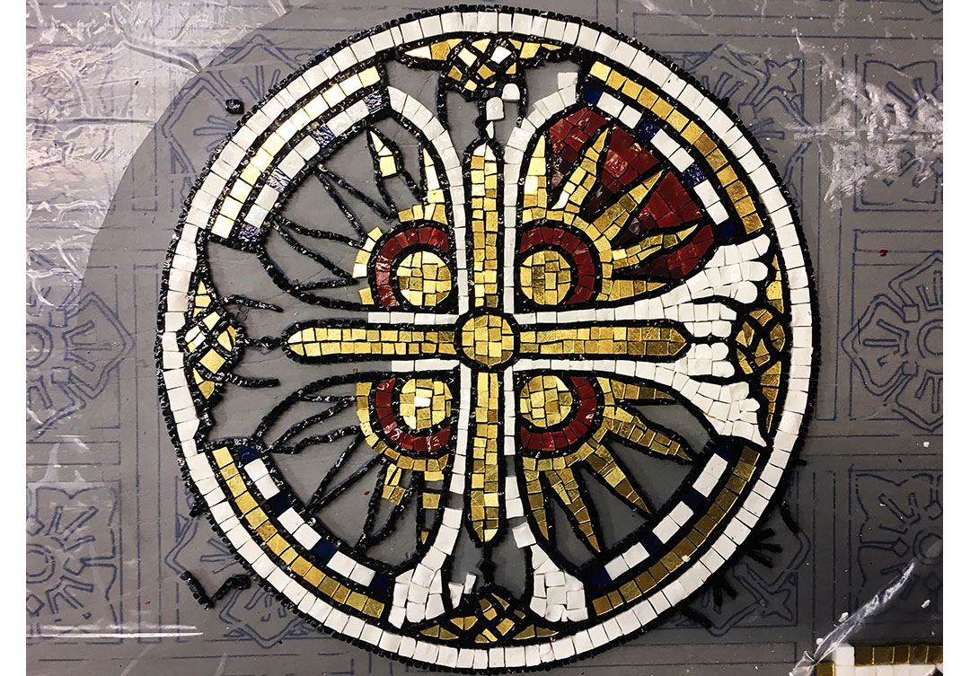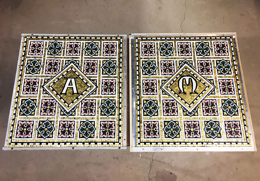 We transported the panels to our mosaic studio and carefully conserved them by replacing rusted iron x cross braces and replacing the x crosses with offset aluminum honeycomb panels. The surface was thoroughly cleaned and consolidated. The missing mosaic pieces were replaced, including the gemstones of the central Pantocrator panel. In addition to the altar mosaics, Rugo also performed a complete restoration of the three rear wall panels which displayed the words HOLY HOLY HOLY and Alpha and Omega. We also created three new rear wall panels to match the original panels adjacent to the original location of the rear altar. Rugo’s work and precision to detail has been highly regarded by the Owner, architect, and contractor,