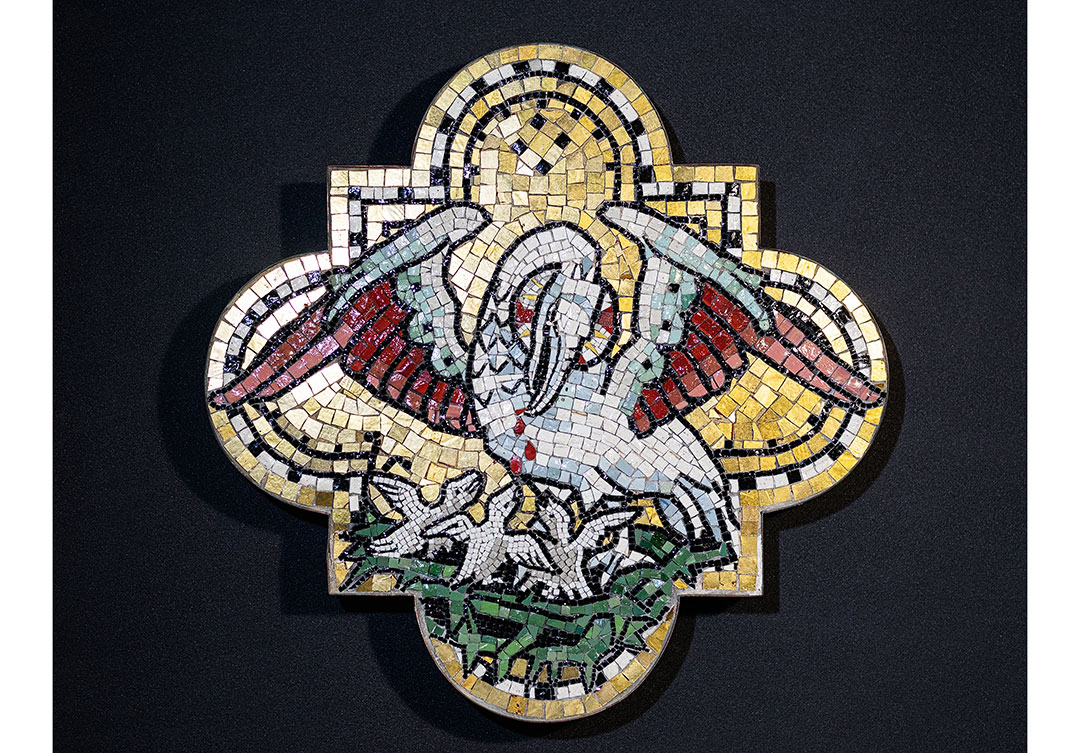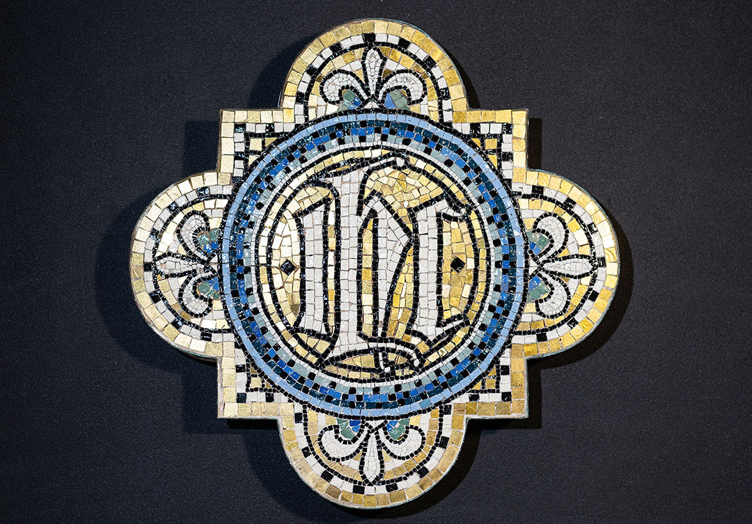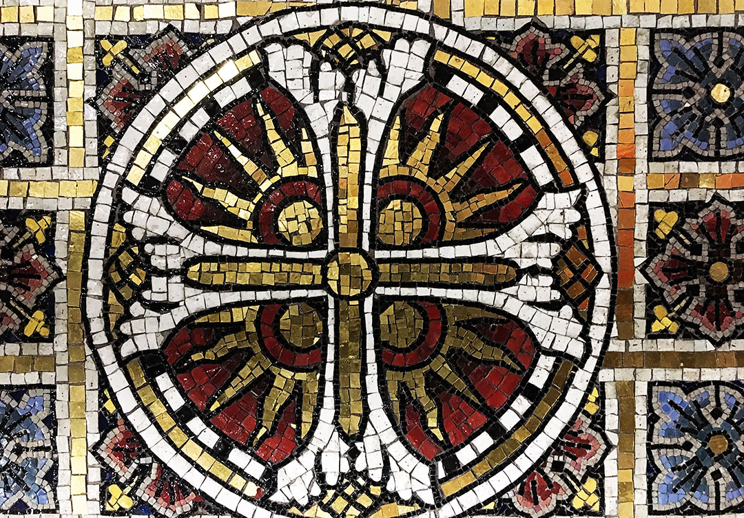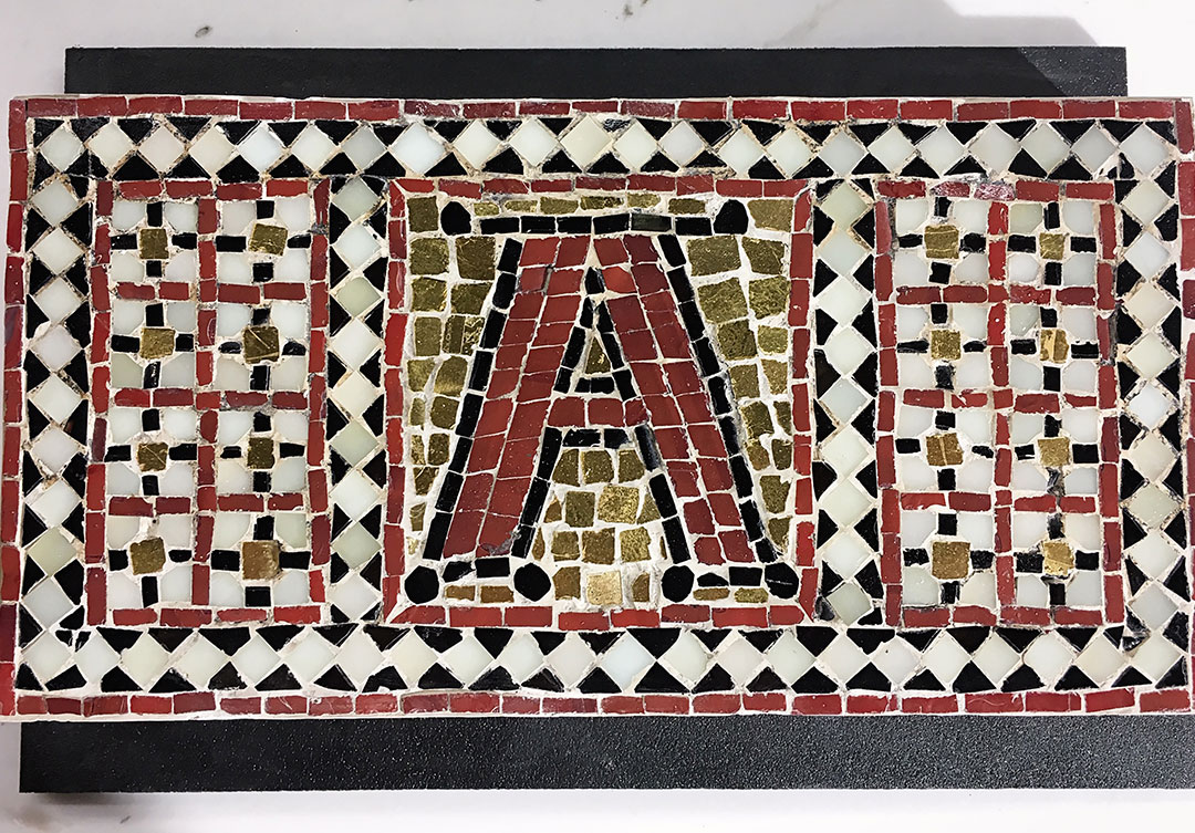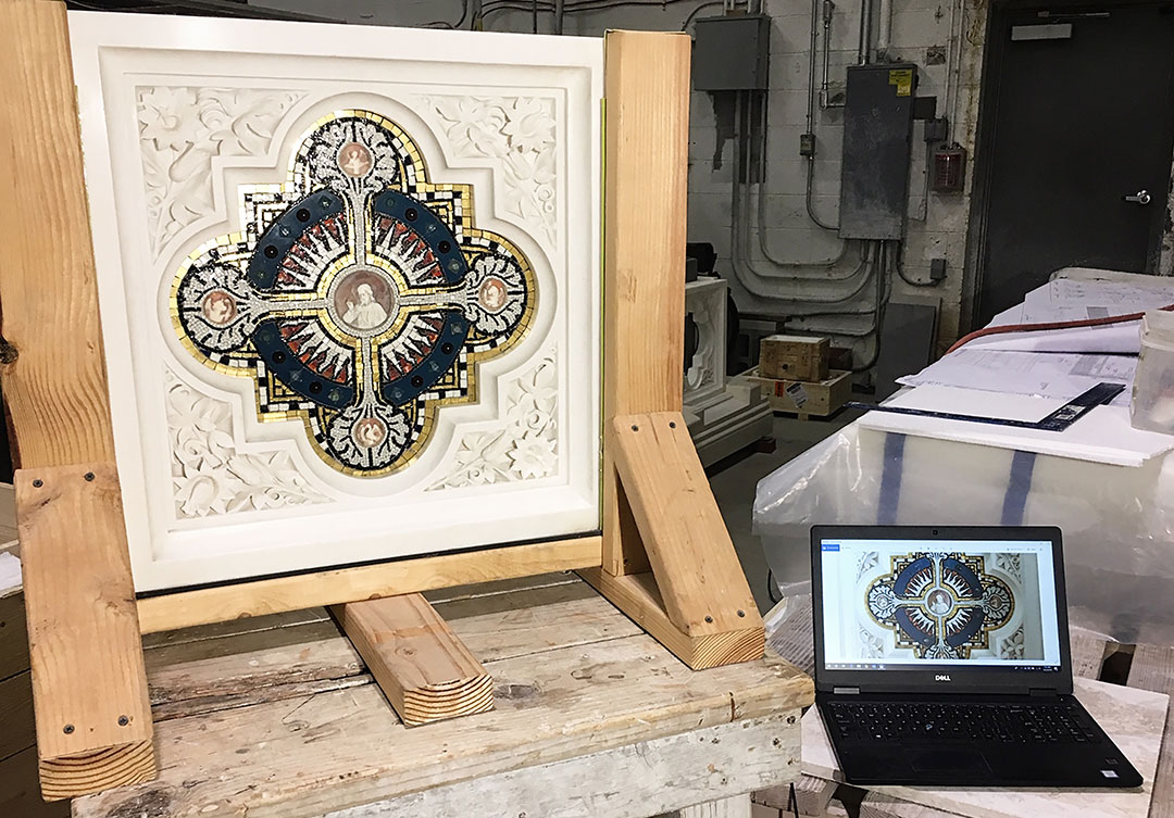 We transported the panels to our mosaic studio and carefully conserved them by replacing rusted iron x cross braces and replacing the x crosses with offset aluminum honeycomb panels. The surface was thoroughly cleaned and consolidated. The missing mosaic pieces were replaced, including the gemstones of the central Pantocrator panel. In addition to the altar mosaics, Rugo also performed a complete restoration of the three rear wall panels which displayed the words HOLY HOLY HOLY and Alpha and Omega. We also created three new rear wall panels to match the original panels adjacent to the original location of the rear altar. Rugo’s work and precision to detail has been highly regarded by the Owner, architect, and contractor,